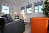 Die Wohnung befindet sich in der 3. Etage (Dachgeschoss) auf der Ostseite des Hauses und verfügt über 2 Dachterrassen. Der Boden ist mit Designbelag ausgelegt. Im offenen Wohnbereich finden Sie eine moderne Couch mit 2 Sesseln, einen Couchtisch, einen Flachbild-TV und eine Stereoanlage.
