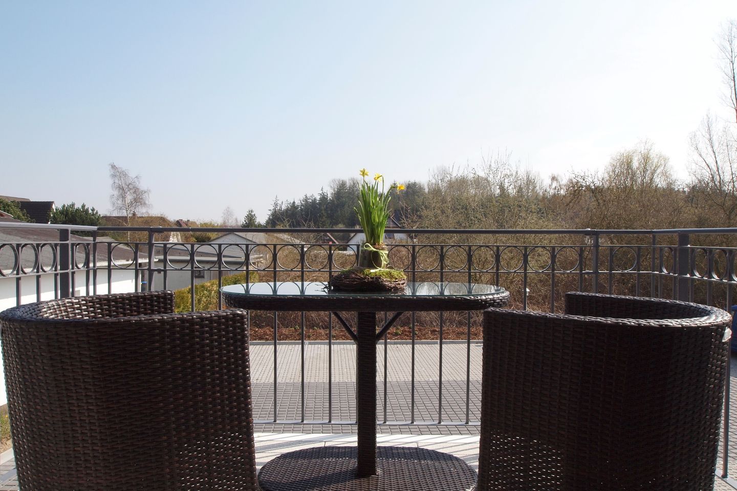 Die Wohnung befindet sich in der 1. Etage auf der Süd-Ostseite des Hauses und verfügt über einen Balkon. Der Boden ist mit Designbelag ausgelegt. Im offenen Wohnbereich finden Sie eine moderne Eckschlafcouch (120 cm x 180 cm), auf der bequem 2 Personen schlafen können, einen Couchtisch, einen Flachbild-TV mit Blu-ray-Player und eine Stereoanlage.