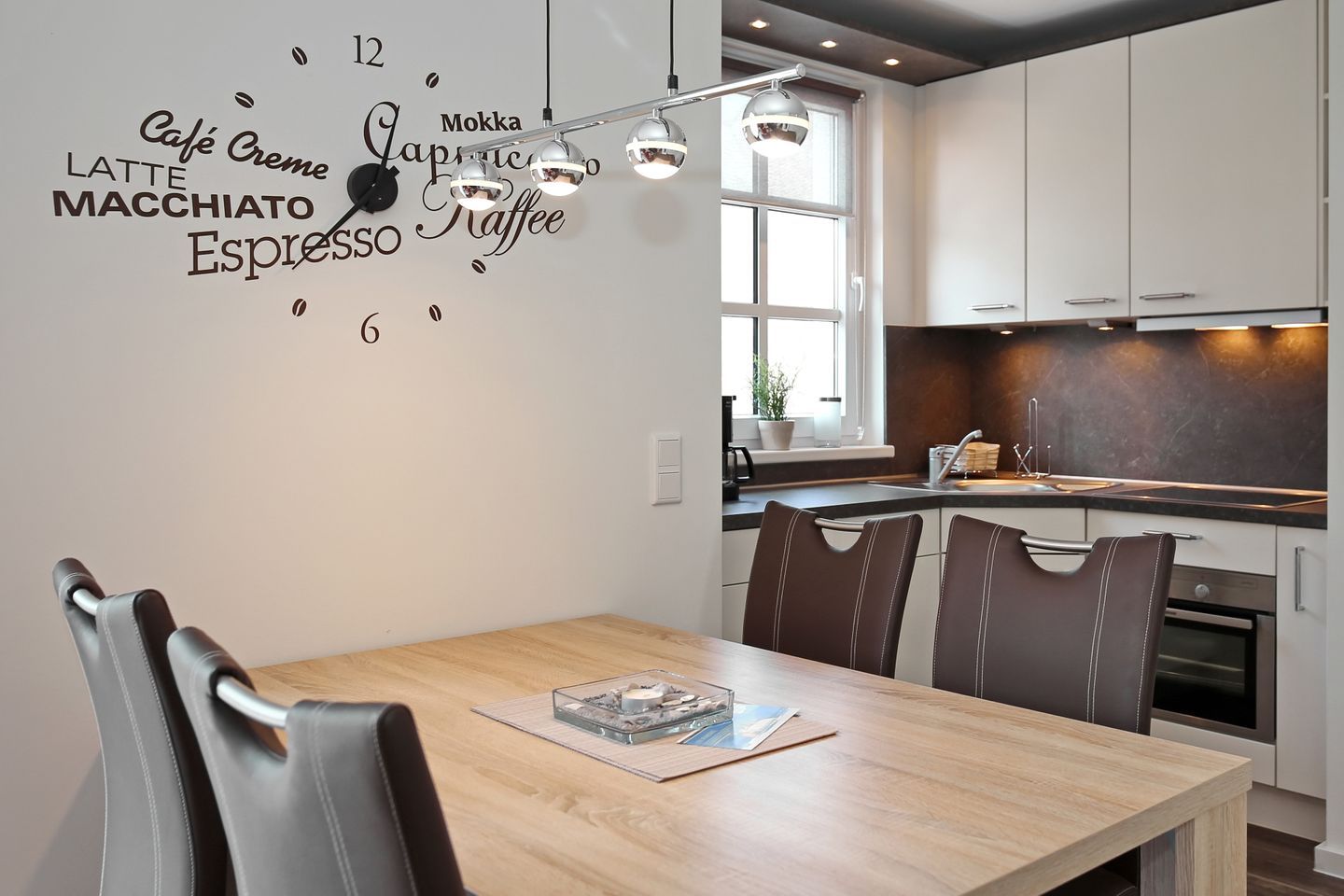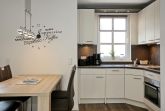 Der Essbereich ist mit einem Tisch und 4 Stühlen ausgestattet. Die exklusive Küchenzeile bietet alles, was Sie benötigen: ein Cerankochfeld (4 Platten), einen Backofen, einen Geschirrspüler und einen Kühlschrank.