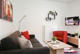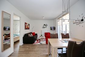 Die Wohnung befindet sich in der 2. Etage auf der Westseite des Hauses und verfügt über einen Balkon. Der Boden ist mit Designbelag ausgelegt. Im offenen Wohnbereich finden Sie eine moderne Doppelschlafcouch (160 cm x 200 cm), auf der bequem 2 Personen schlafen können, passende Sessel und einen Couchtisch, einen Flatscreen-TV und eine Stereoanlage.