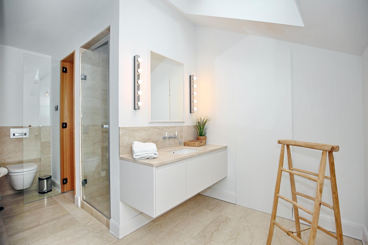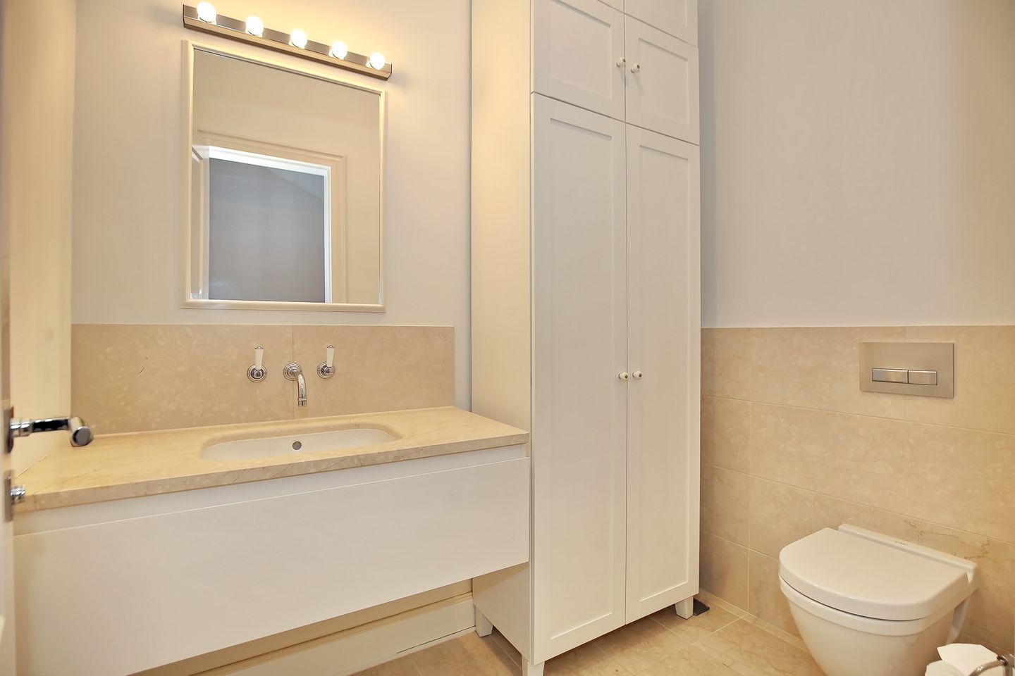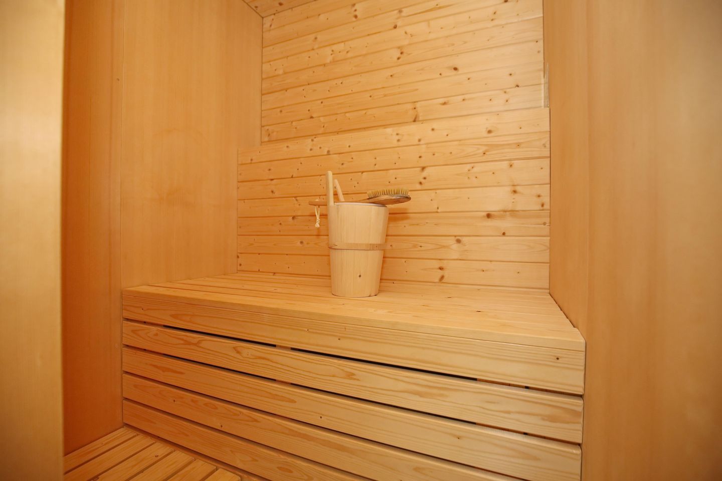 Das große geflieste Bad mit Tageslicht verfügt über eine Badewanne, eine separate Dusche sowie ein WC und ist von beiden Schlafzimmern aus begehbar. Das moderne Bad ist mit einem großzügigen Waschtisch, der viel Stauraum für Ihre Waschutensilien bietet, und einem Föhn ausgestattet. Das Badezimmer verfügt sogar über eine eigene Sauna. Ein Gäste- WC befindet sich gegenüber dem 2. Schlafzimmer im Eingangsbereich.