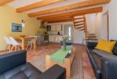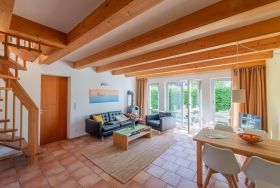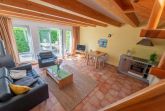 Der offene Wohn- und Essbereich der Ferienwohnung verfügt über ein Sofa und einen separaten Sessel, einen Flachbild-TV, einen DVD-Player sowie ein Radio. Zusätzlich steht dir kostenloses WLAN zur Verfügung. Die gemütliche Essecke lädt zum Verweilen bei den gemeinsamen Mahlzeiten oder netten Spieleabenden ein. Der Kamin sorgt besonders in den kälteren Monaten für wohlige Wärme und Gemütlichkeit. Vom Wohnbereich aus hast du Zugang zur sonnenverwöhnten Terrasse.