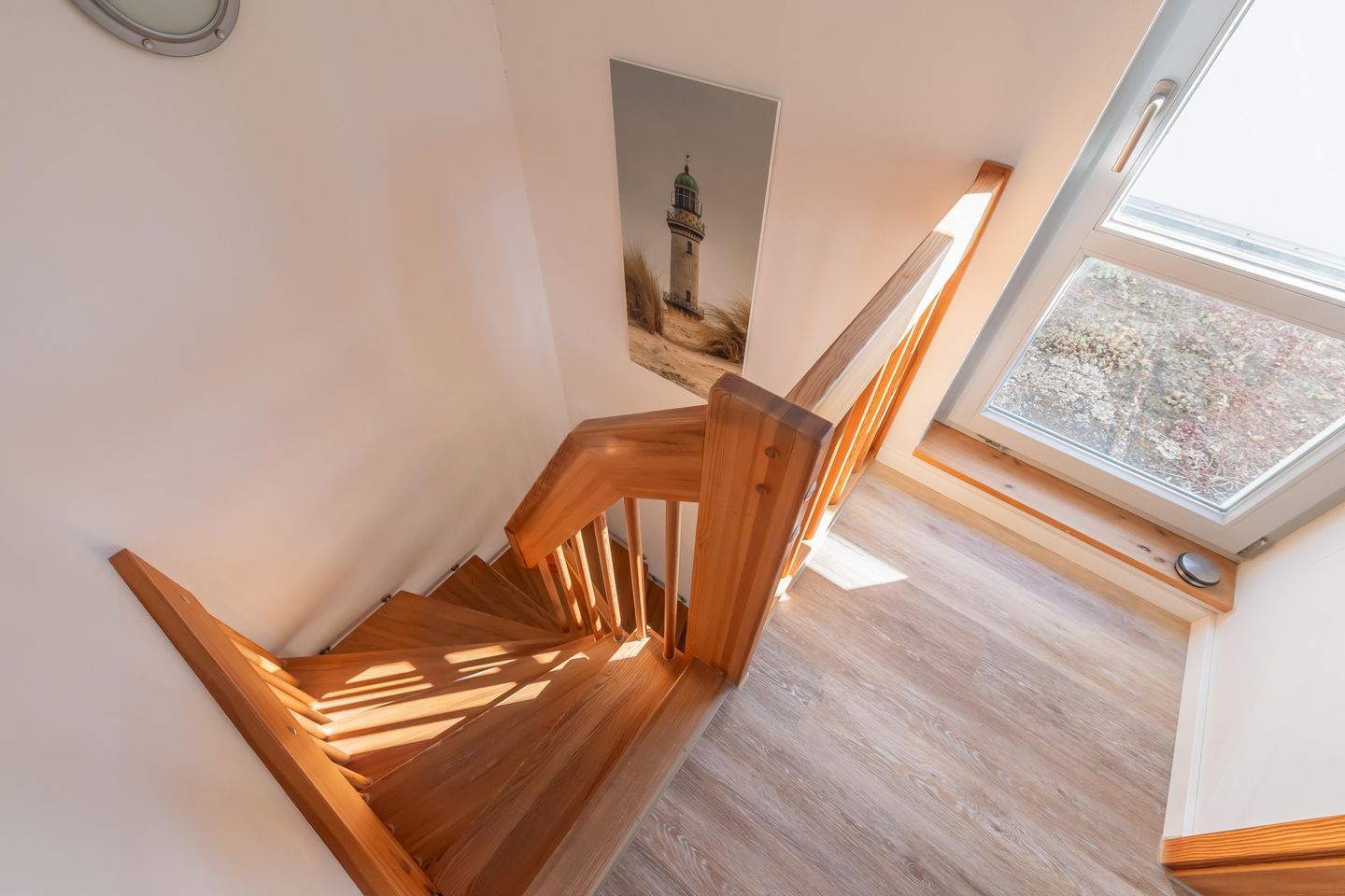 Zum Tageslichtbad im Untergeschoss mit Dusche und WC gehören ein Waschtisch mit beleuchtetem Spiegel sowie ein Föhn. Im gesamten Erdgeschoss sind Bodenfliesen mit Fußbodenheizung verlegt. Die Schlafräume im Obergeschoss sind mit einem Korkboden ausgestattet.