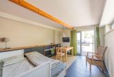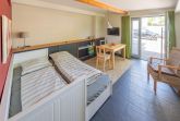 Der offene Wohn-, Schlaf- und Essbereich des Ferienappartements verfügt über ein Bett, welches zu einem Schlafplatz für 2 Personen ausziehbar ist. Zur Unterhaltung stehen dir ein Flachbild-TV, ein Radio und kostenloses WLAN zur Verfügung. Vom Wohnbereich aus hast du Zugang zur Terrasse.