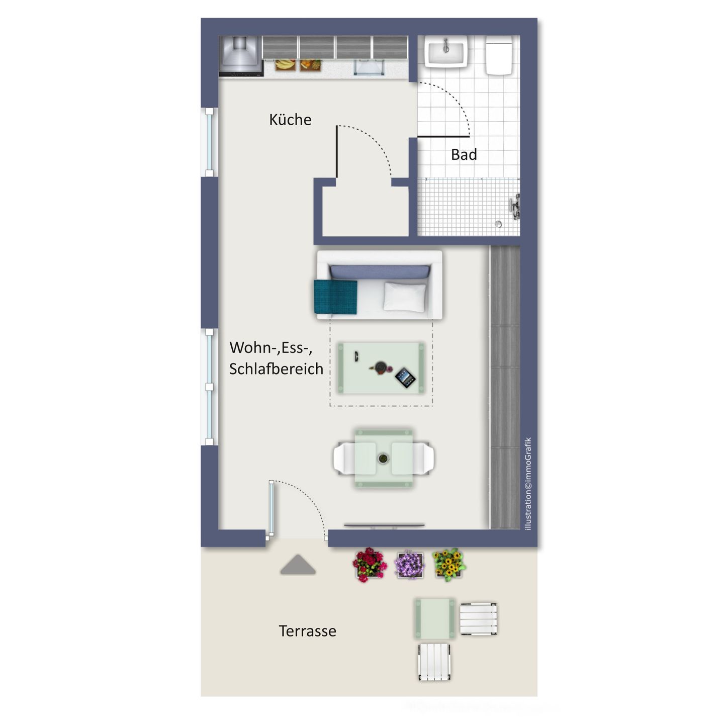 Auf 28 m² empfängt dich ein kombinierter Wohn-, Schlaf- und Essbereich mit einer Küchenzeile und einem Duschbad. Die möblierte Terrasse mit Westausrichtung lädt dich zu erholsamen Stunden im Freien ein. Genieße in dieser Ferienwohnung geruhsame Urlaubstage an der Ostsee.