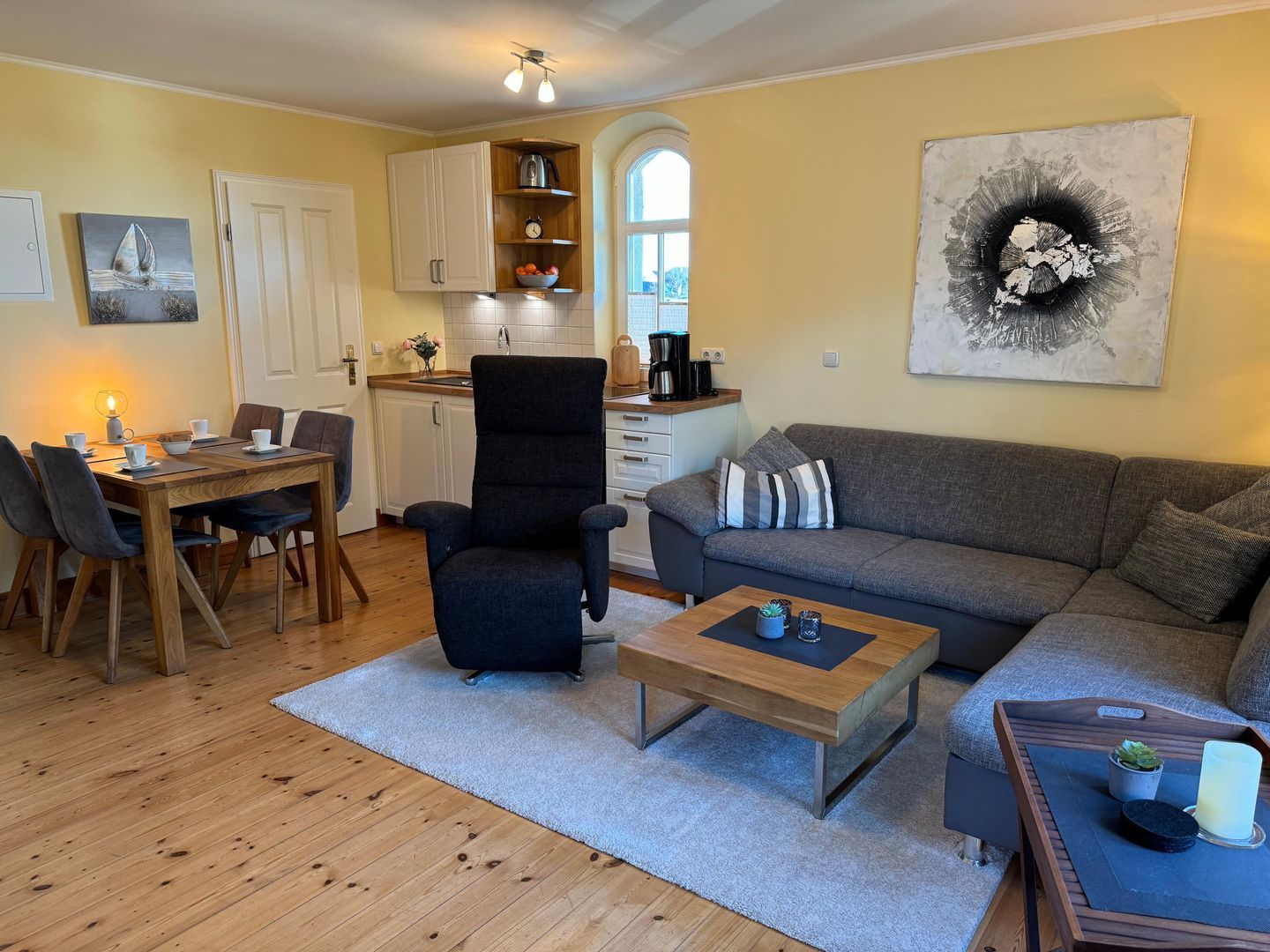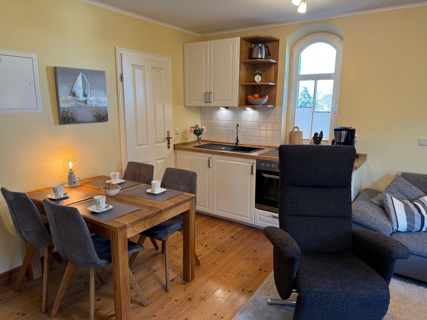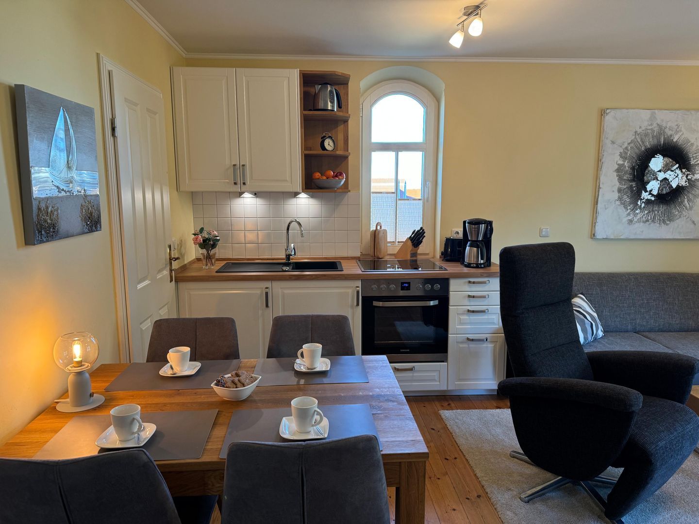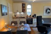 Die gut organisierte Küchenzeile verfügt über ein 4-Platten-Cerankochfeld, einen Backofen, einen Kühlschrank sowie Kaffeemaschine, Wasserkocher und Toaster. Am angrenzenden Esstisch können bis zu 4 Personen Platz nehmen.