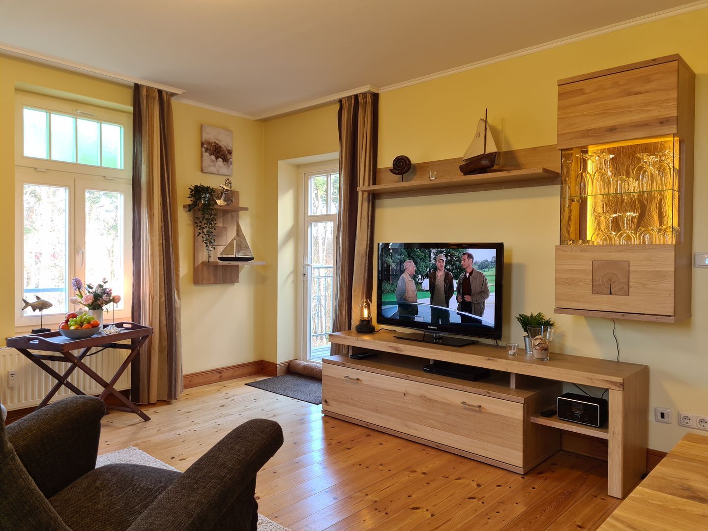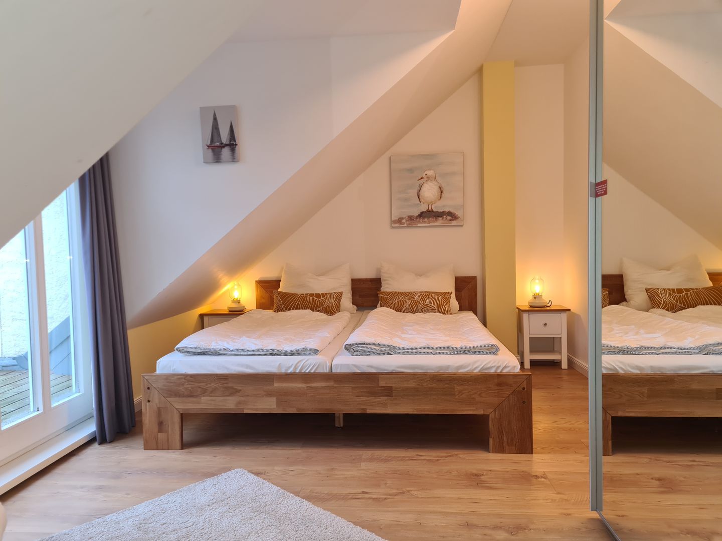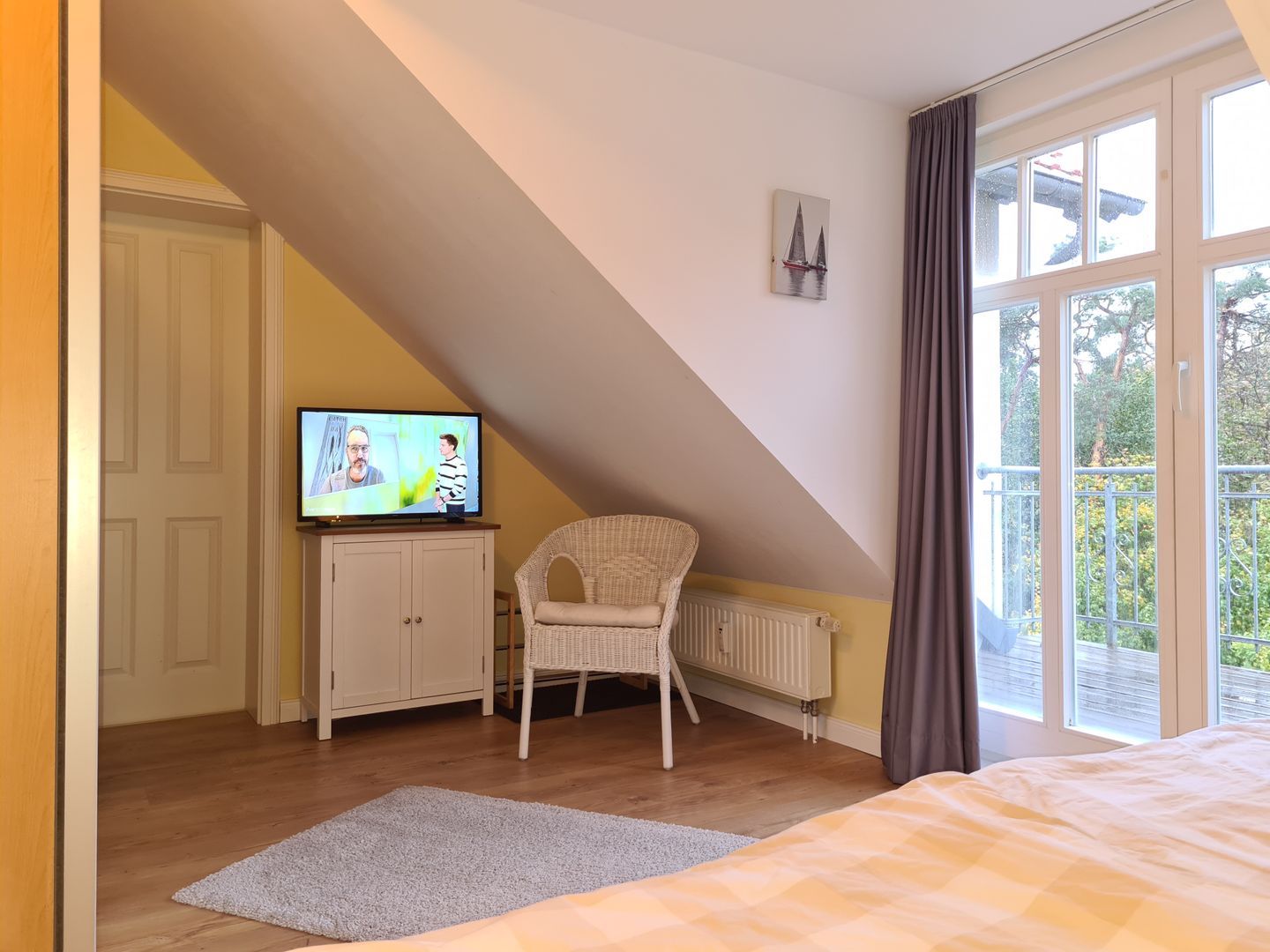 Erholung finden Sie auch im Schlafzimmer in dem komfortablen Doppelbett (180 cm x 200 cm). Der große Kleiderschrank bietet ausreichend Stauraum für Ihre Urlaubsgarderobe. Zur Verdunklung wurden an den Fenstern Vorhänge angebracht. Eine Besonderheit dieser Ferienwohnung ist, dass Sie von hier aus auch den Balkon betreten können. Außerdem steht Ihnen im Schlafzimmer ein zweiter TV zur Verfügung.