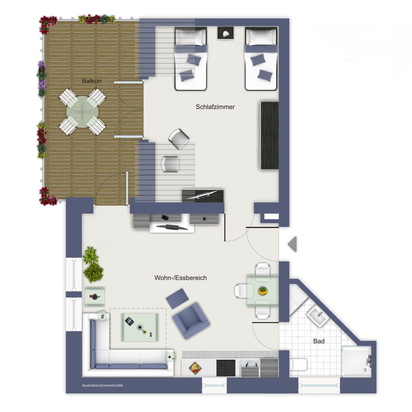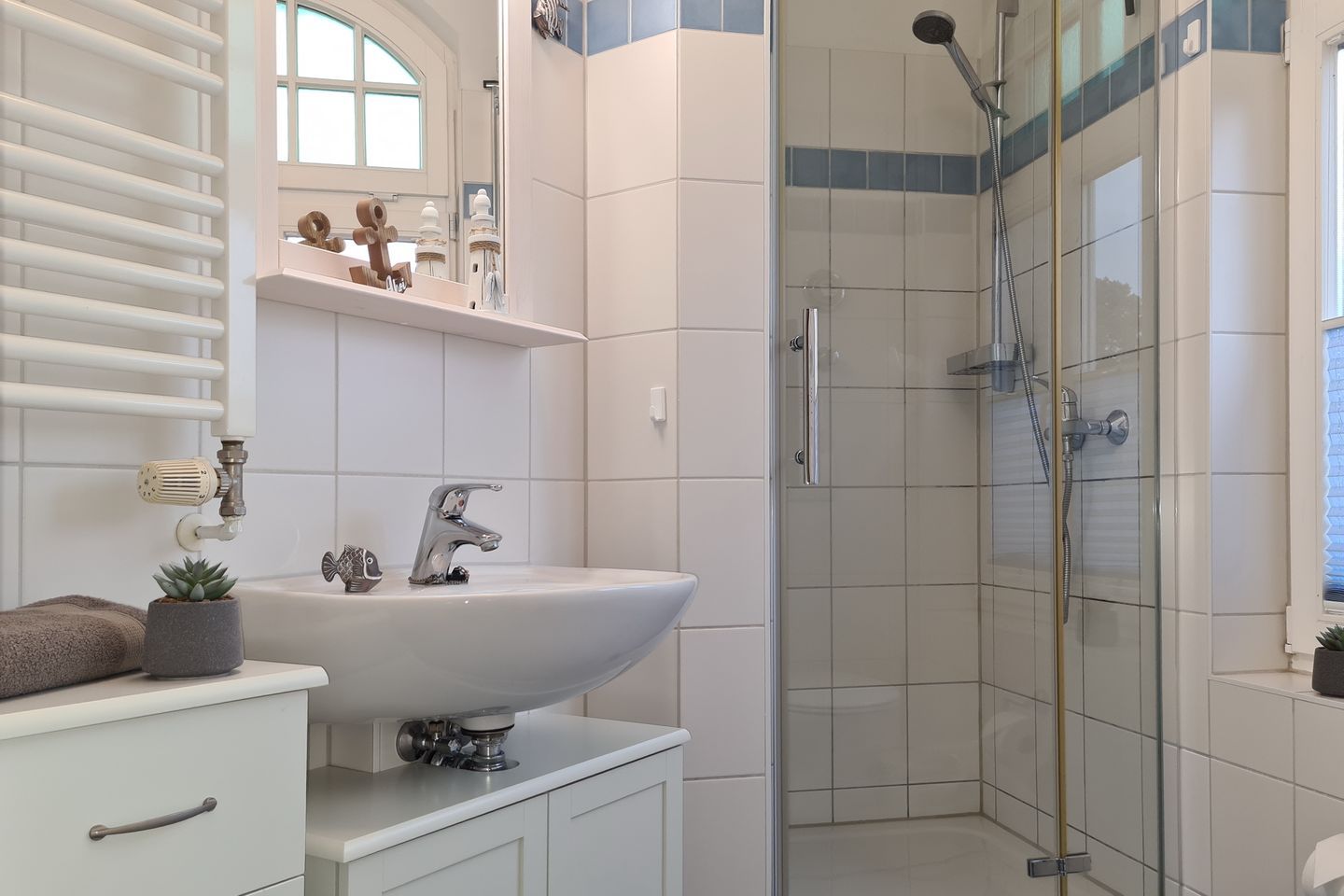 Ein Duschbad/WC mit Föhn ist selbstverständlich ebenfalls vorhanden. Das Badezimmer ist mit einer Fußbodenheizung ausgestattet. Im Wohnbereich wurden echte Holzdielen verlegt, im Schlafzimmer befindet sich Laminatboden.