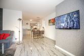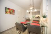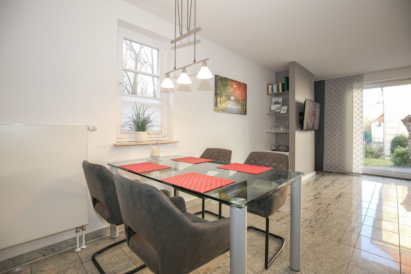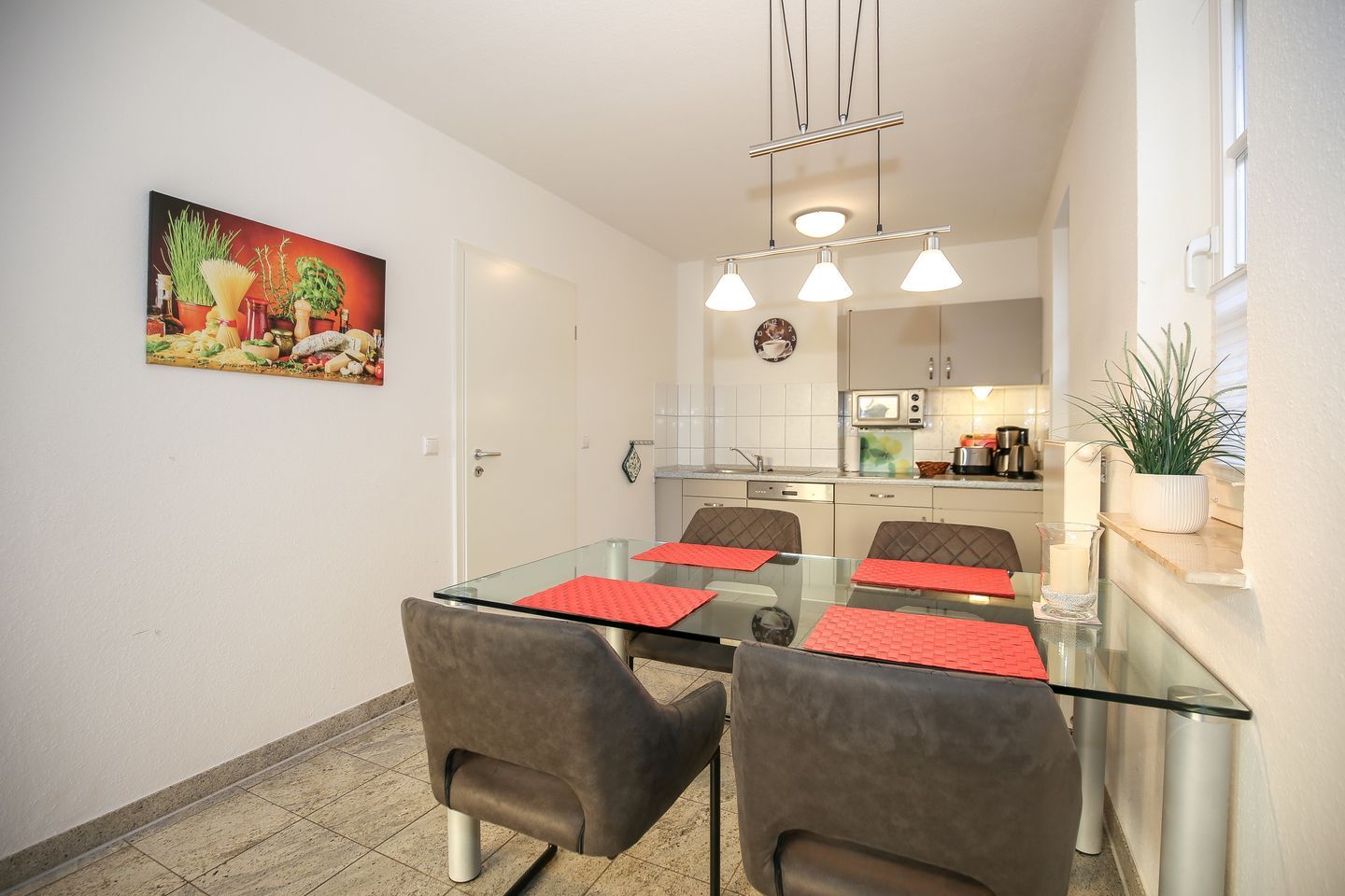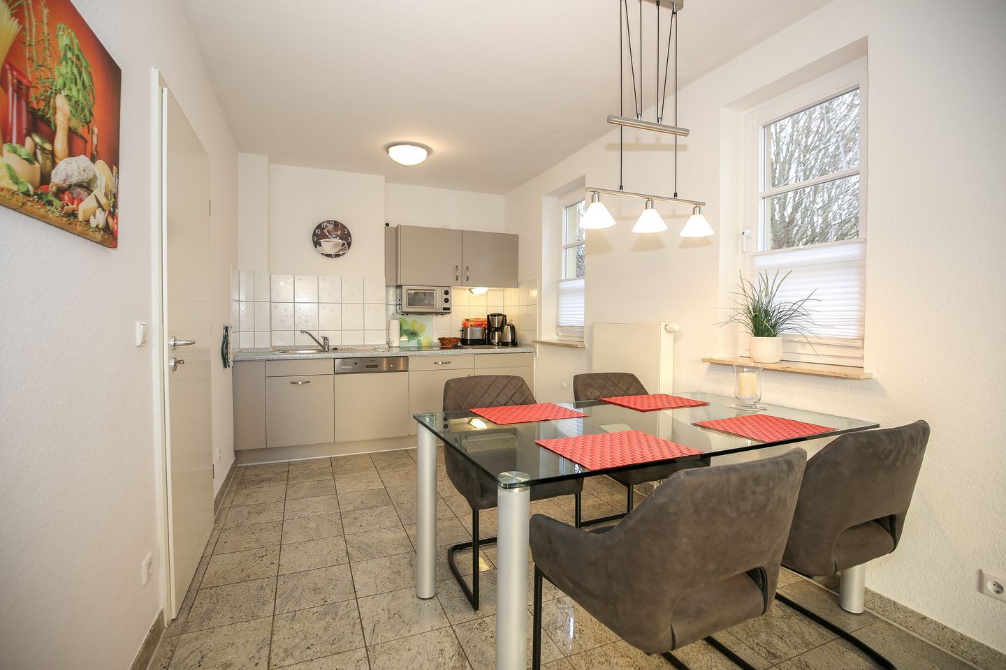 An den Wohnraum angrenzend finden Sie die funktional eingerichtete Küchenzeile. Diese verfügt über ein 4-Platten-Cerankochfeld, einen Geschirrspüler, eine Mikrowelle, einen Kühlschrank mit Gefrierfach sowie einen Wasserkocher, einen Toaster und eine Kaffeemaschine. Am Esstisch haben bis zu 4 Personen Platz.