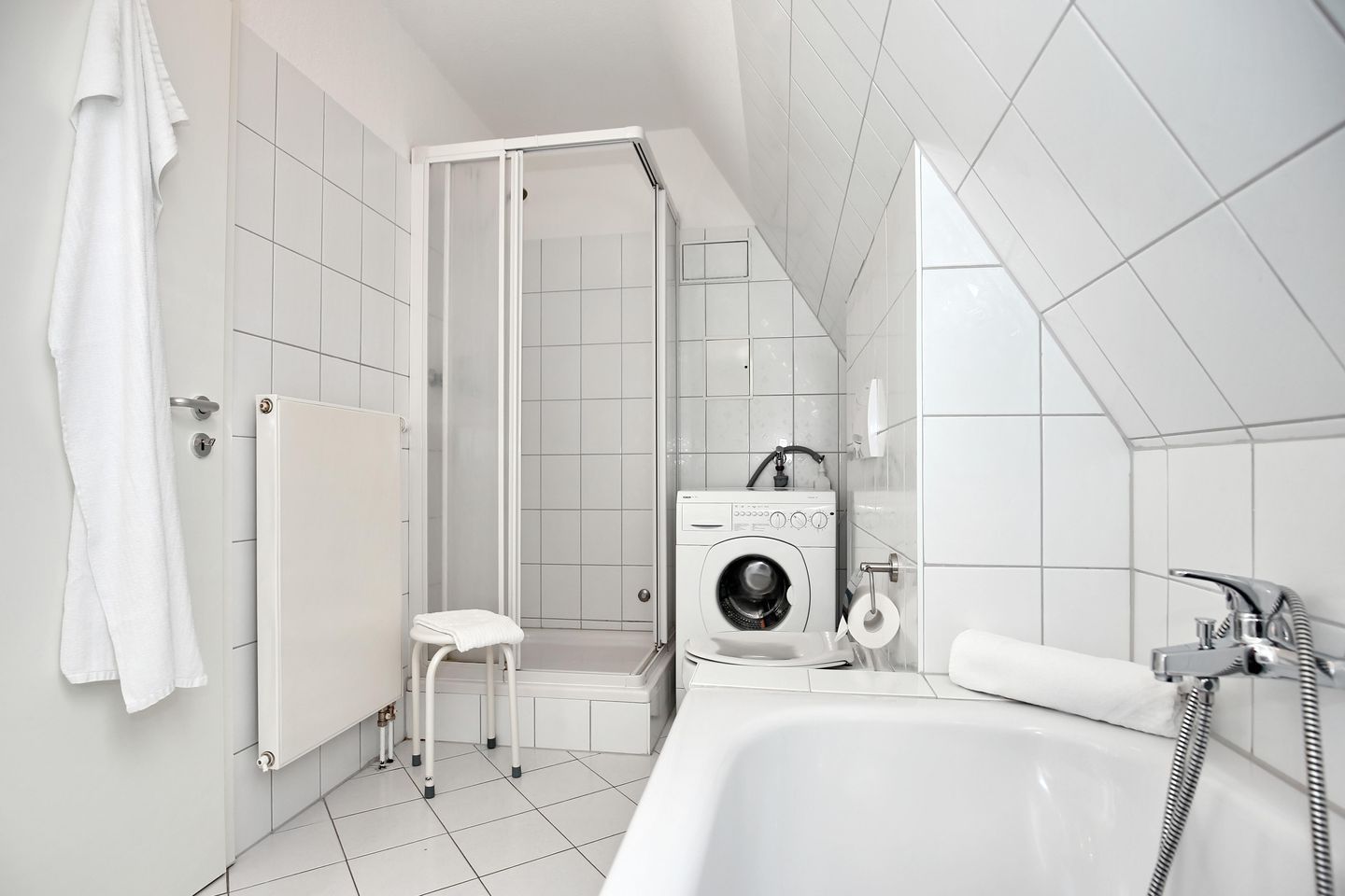 Im Badezimmer finden Sie eine Waschmaschine, ein WC, eine Dusche sowie eine Badewanne. Außerdem gehört ein Föhn zur Ausstattung. Als Bodenbelag wurde in der gesamten Wohnung hochwertiger Fliesenbelag gewählt. Nur in den Schlafzimmern sorgt Teppichboden für zusätzliche Behaglichkeit.