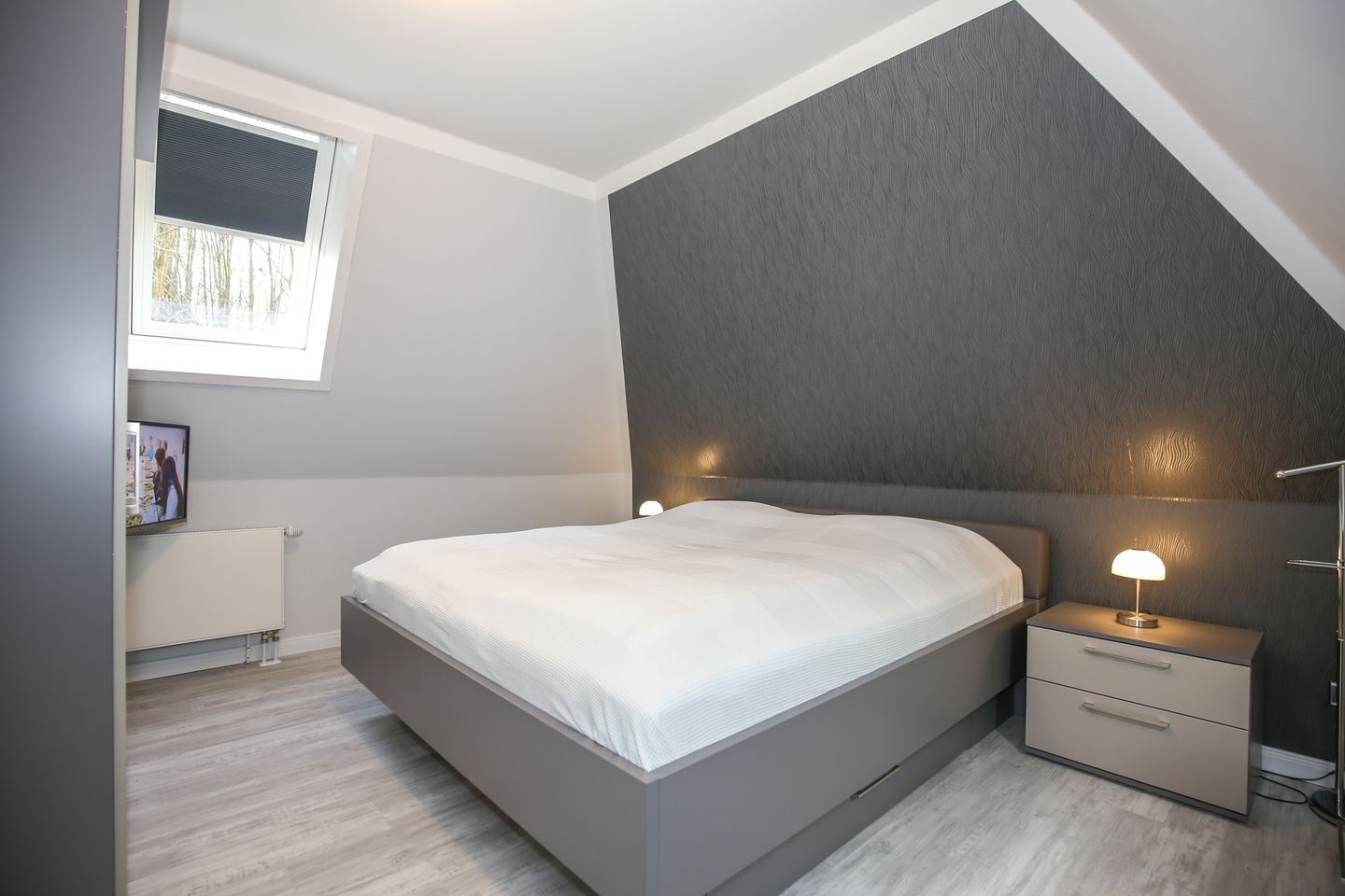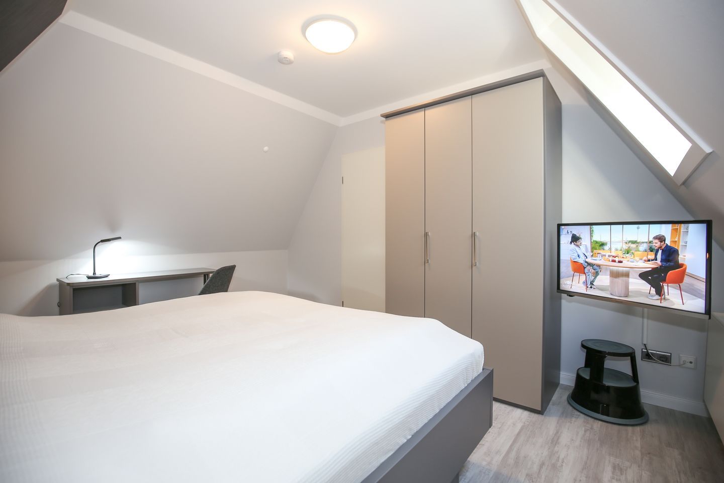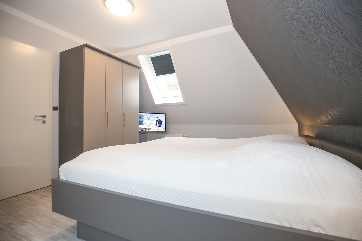 Im Schlafzimmer der Ferienwohnung stehen ein gemütliches Doppelbett, ein Kleiderschrank, ein Schreibtisch sowie ein zweiter TV für Sie bereit. Die 3. Person kann bequem auf dem Schlafsofa (140 x 200 cm) übernachten. Dieses befindet sich auf dem Vorflur des 1. Schlafzimmers. Zur Verdunkelung wurden an den Fenstern Rollos angebracht.