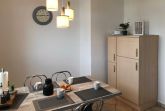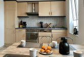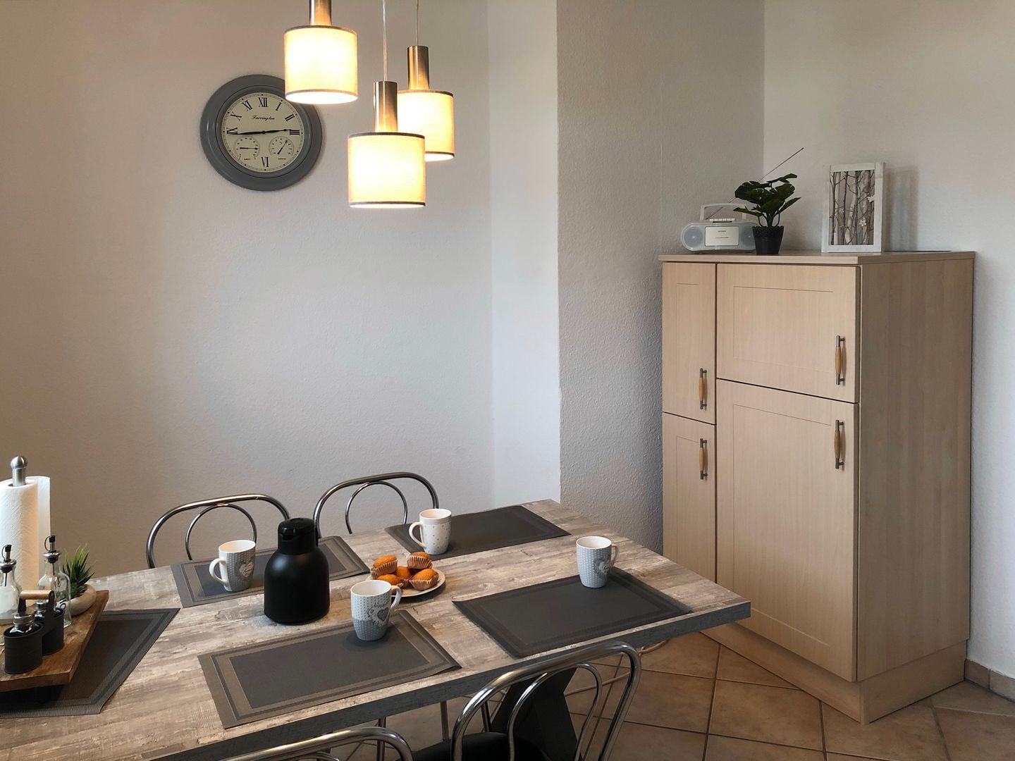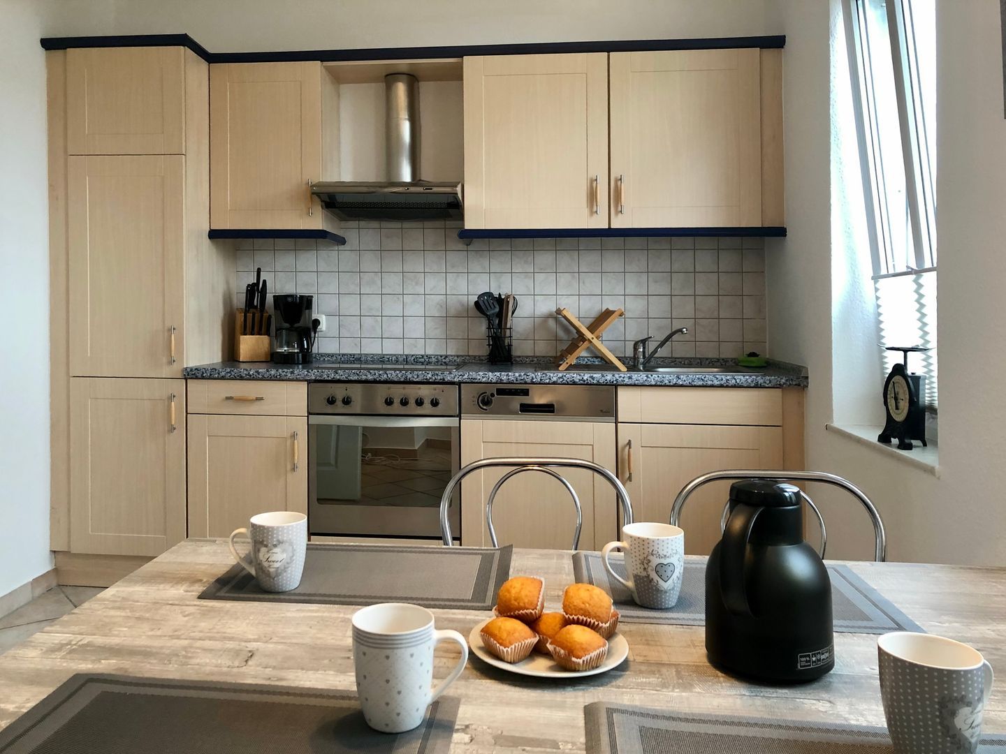Die Küchenzeile ist mit einem Geschirrspüler, einem Kühlschrank inklusive Gefrierfach, einem Herd mit Backofen sowie einem 4-Platten-Cerankochfeld ausgestattet. Ein Wasserkocher, eine Kaffeemaschine und ein Toaster vervollständigen die Küchenausstattung.