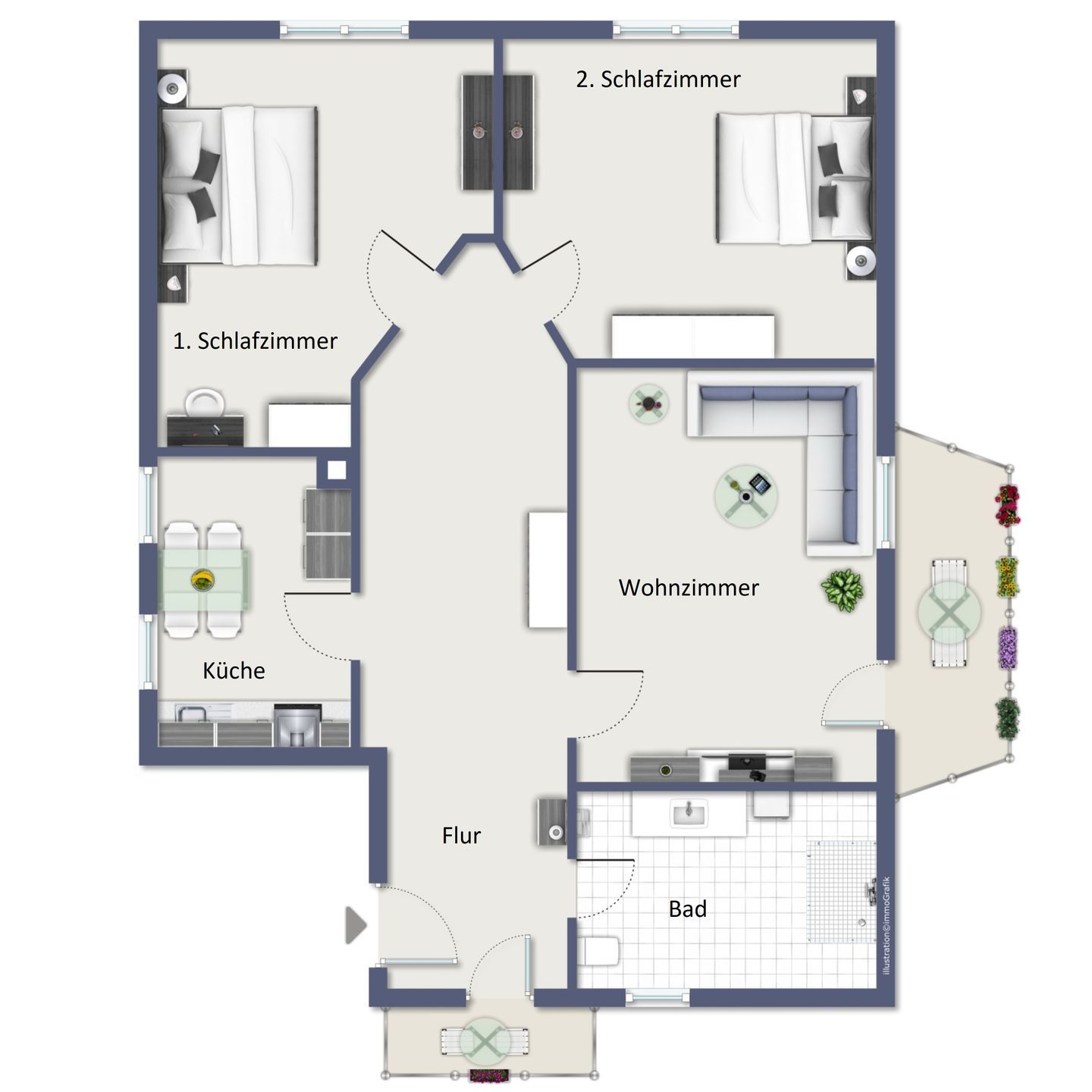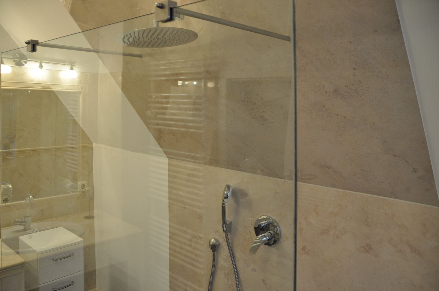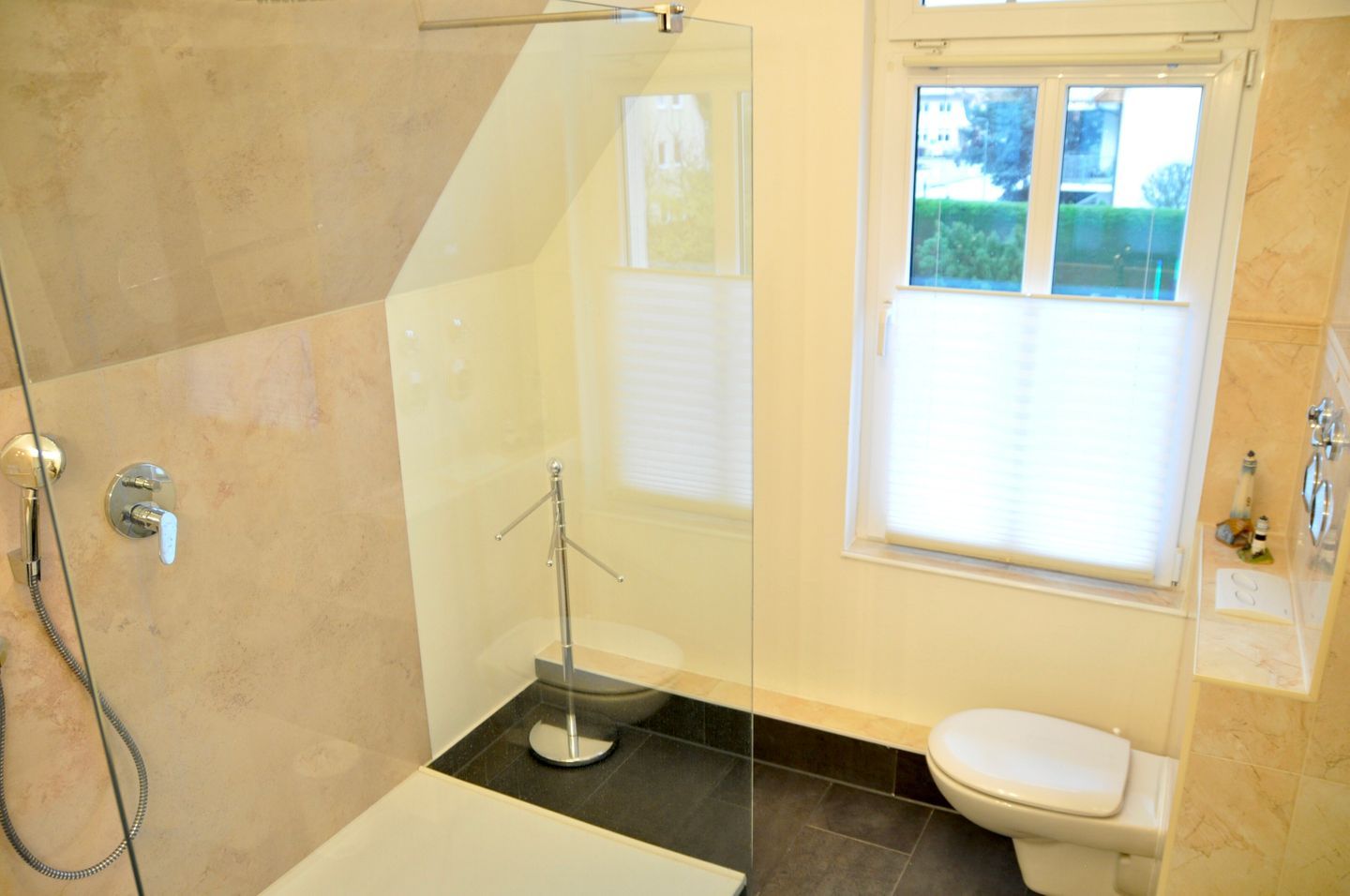 Das geräumige Tageslichtbad ist mit einer bodengleichen Dusche, einem WC und einem kleinen Schrank für Ihre Waschutensilien ausgestattet. Das Bad ist gefliest und verfügt über eine Handtuchheizung. Die Wohn- und Schlafbereiche sind mit Laminat ausgelegt. In dieser Nichtraucherwohnung sind Haustiere erlaubt.