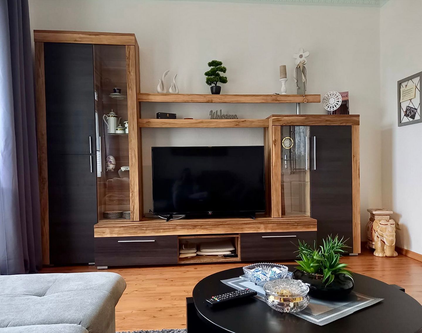 Der Wohnbereich lädt Sie mit einer schönen Sitzecke, einer bequemen Couch, zwei Sesseln und einem Couchtisch zu gemütlichen Abenden ein. Zur Unterhaltung stehen Ihnen ein Flachbild-TV, ein CD-Player und ein WLAN-Anschluss zur Verfügung. Der integrierte Essbereich befindet sich zwischen Wohn- und Küchenbereich. Hier haben Sie ausreichend Platz für gemeinsame Mahlzeiten.