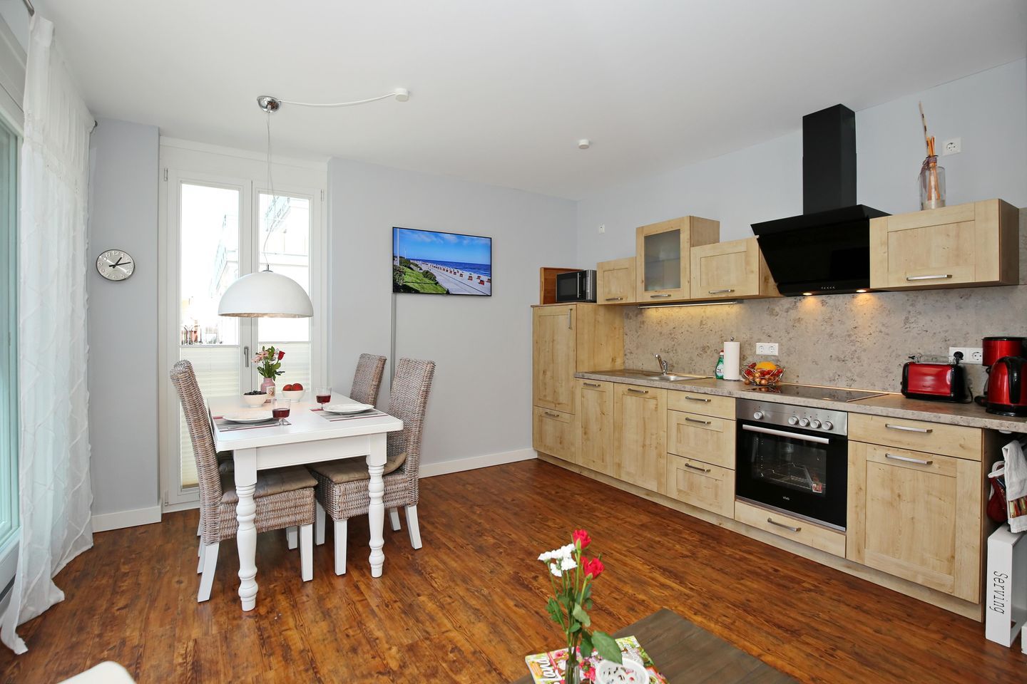 Die offene Küche, direkt am Essbereich gelegen, ist vollständig ausgestattet. Ihnen stehen ein Kühlschrank, ein Geschirrspüler, eine Mikrowelle sowie ein 4-Platten-Cerankochfeld mit Backofen zur Verfügung. Vervollständigt wird die Ausstattung durch Toaster, Wasserkocher und Filterkaffeemaschine.