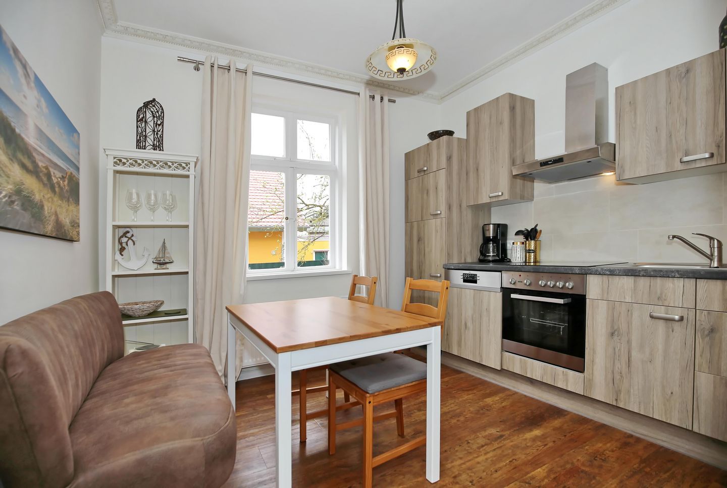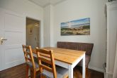 Die angrenzende Küche ist vollständig ausgestattet: Herd mit 4-Cerankochfeldern, Backofen, Geschirrspüler, Kühlschrank mit Gefrierfach, Toaster, Kaffeemaschine und Wasserkocher gehören dazu. Gemeinsame Mahlzeiten können Sie in der gemütlichen Essecke genießen.