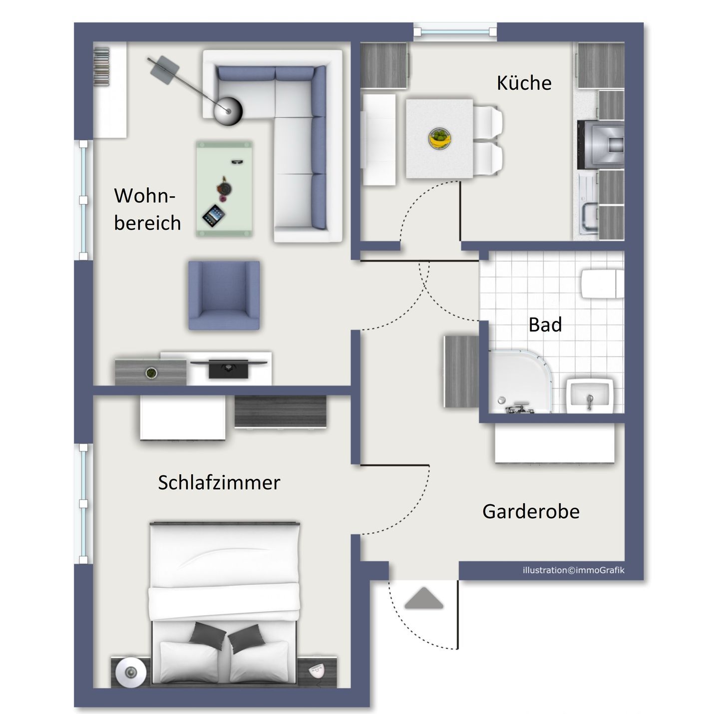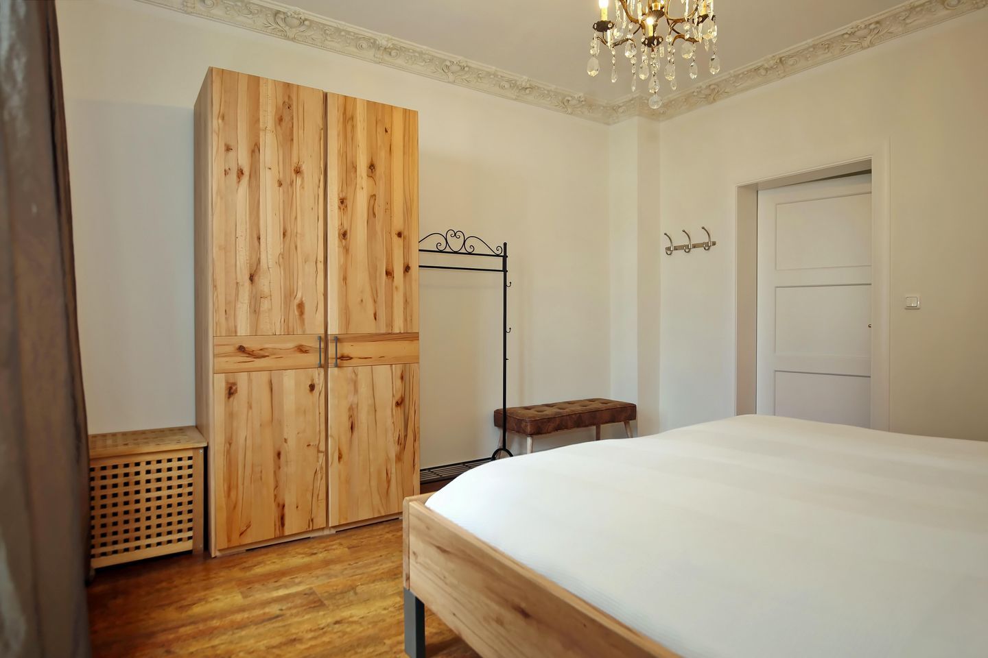 Im Schlafzimmer finden Sie ein komfortables Doppelbett sowie einen geräumigen Kleiderschrank für Ihre Reiseutensilien. Vorhänge in Wohn- und Schlafzimmer sorgen für Verdunkelung und Sichtschutz.