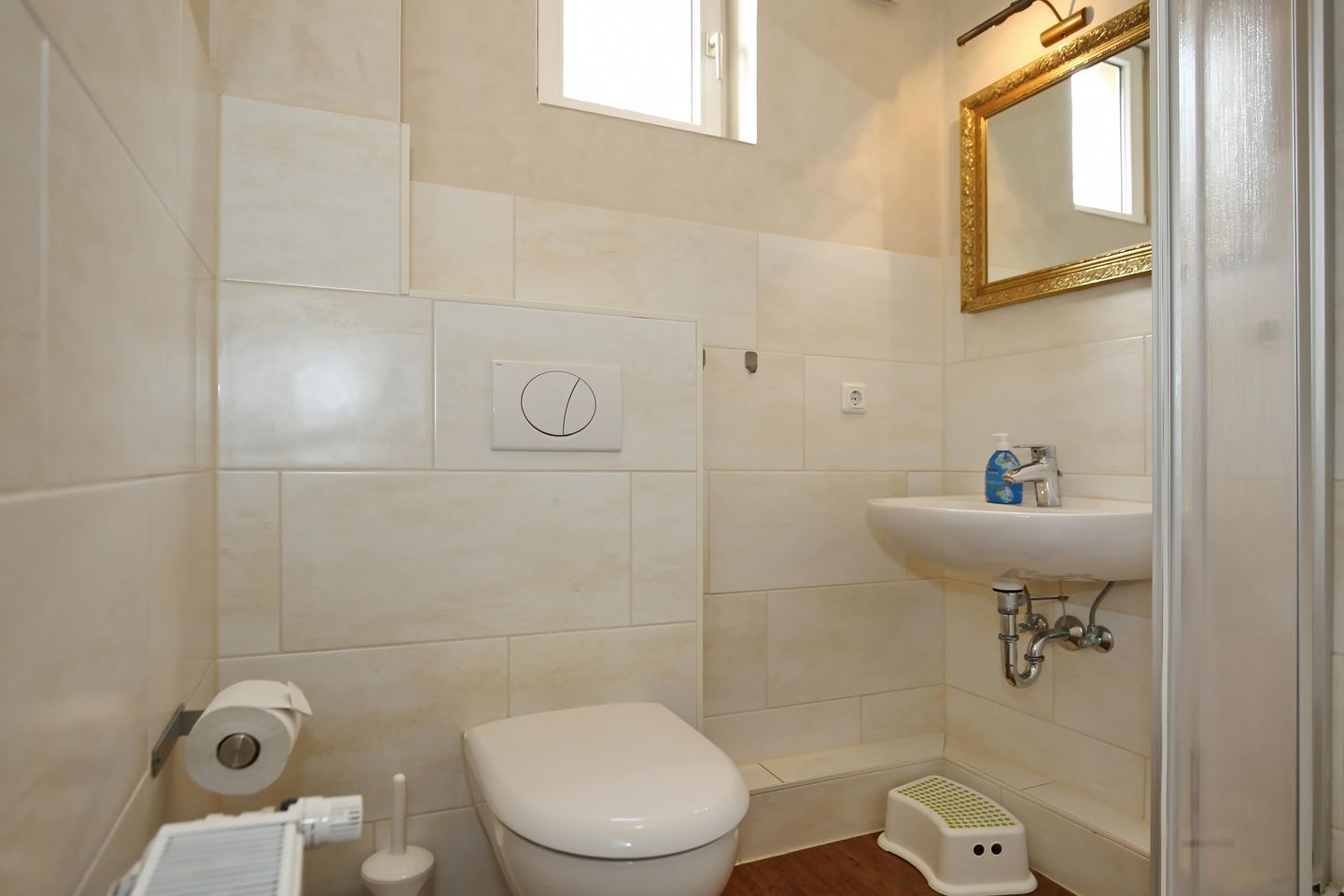 Das Badezimmer ist mit Dusche, WC, Waschbecken und Spiegel ausgestattet. Fliesen wurden sowohl im Bad als auch in der Küche verlegt, während die restliche Wohnung mit hochwertigem Vinylboden versehen ist.