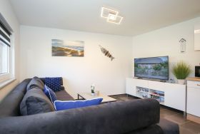 Im Wohnbereich des Bungalows laden eine moderne Doppelschlafcouch, ein Flatscreen-TV sowie ein Radio zu gemütlichen Abendstunden ein. Zur Verdunkelung dienen Rollos.
