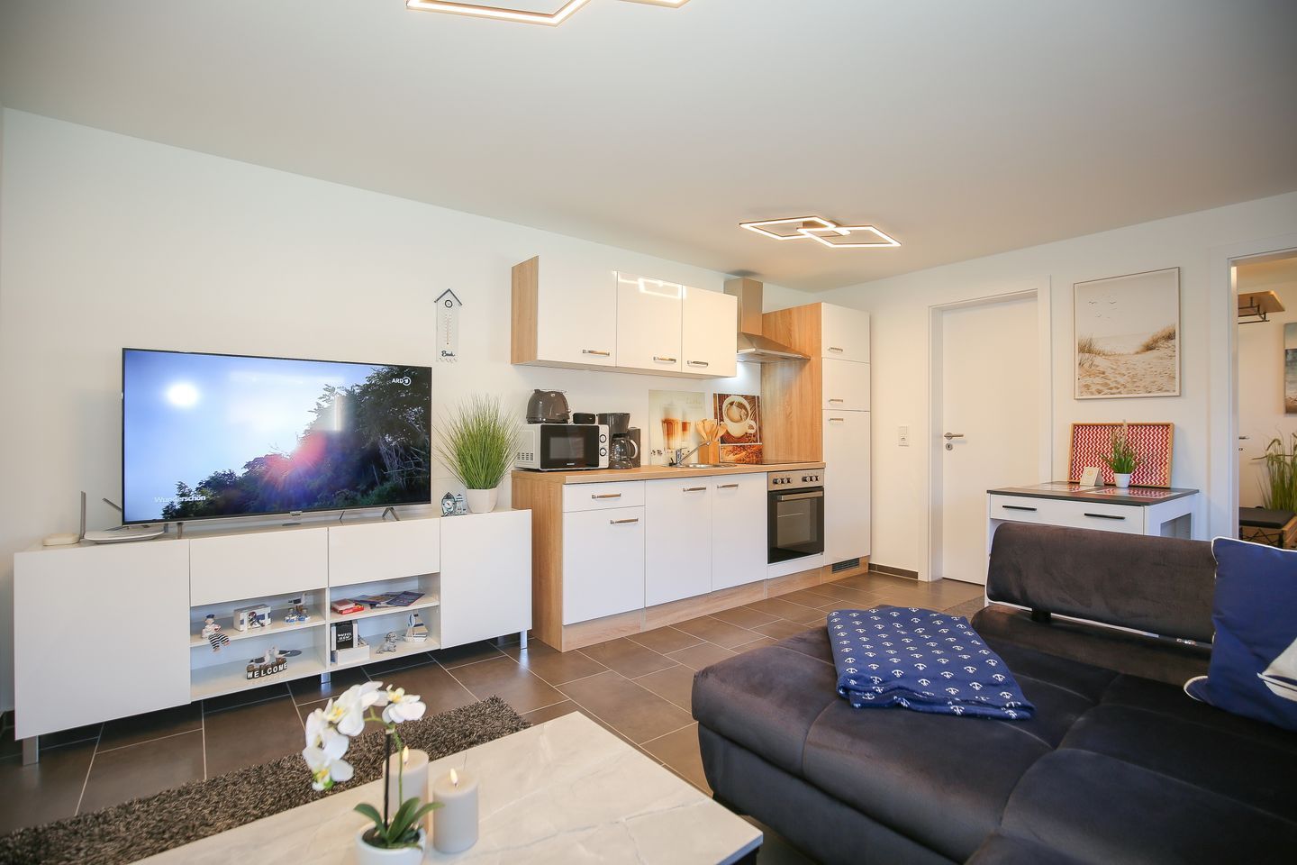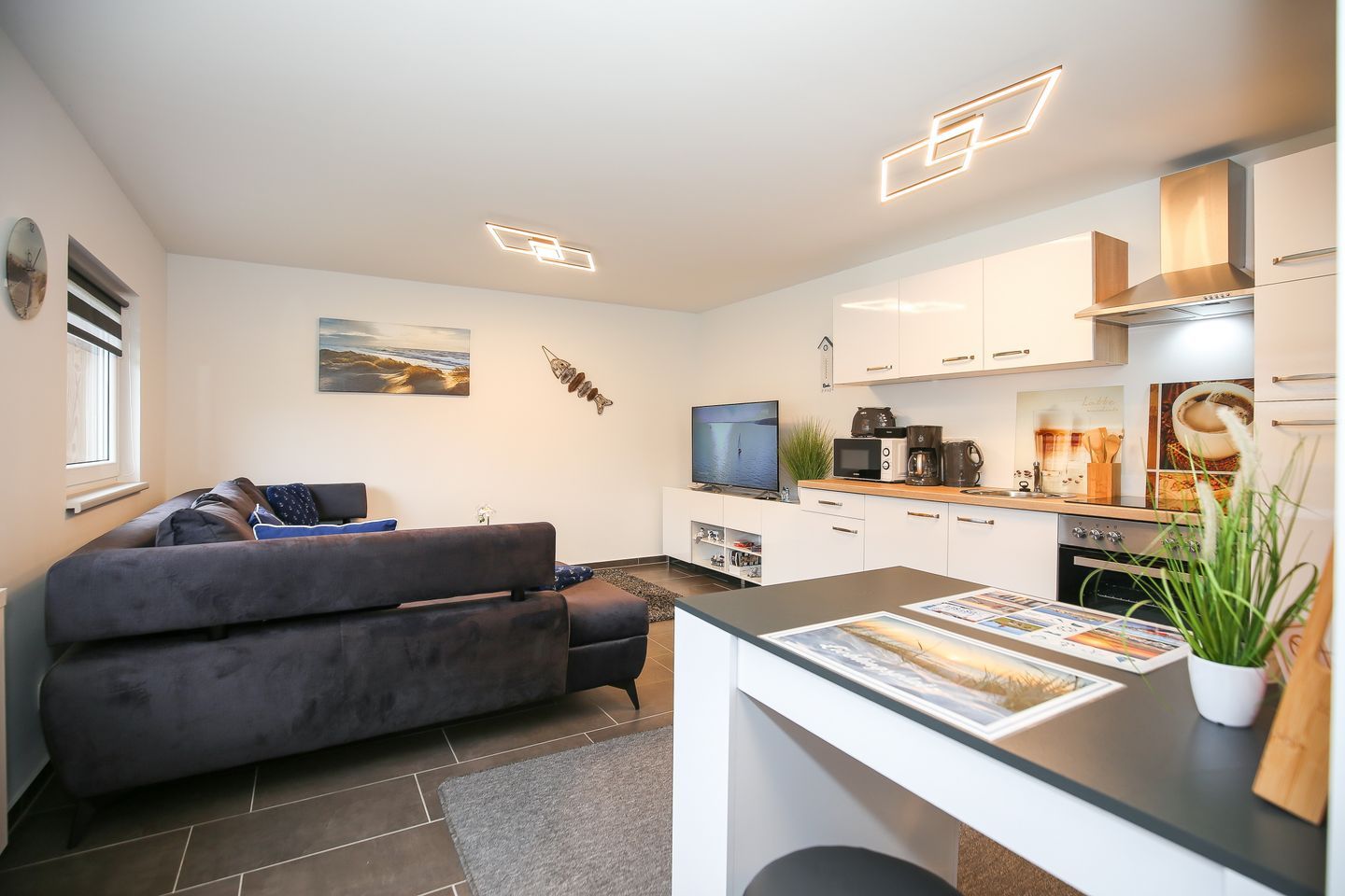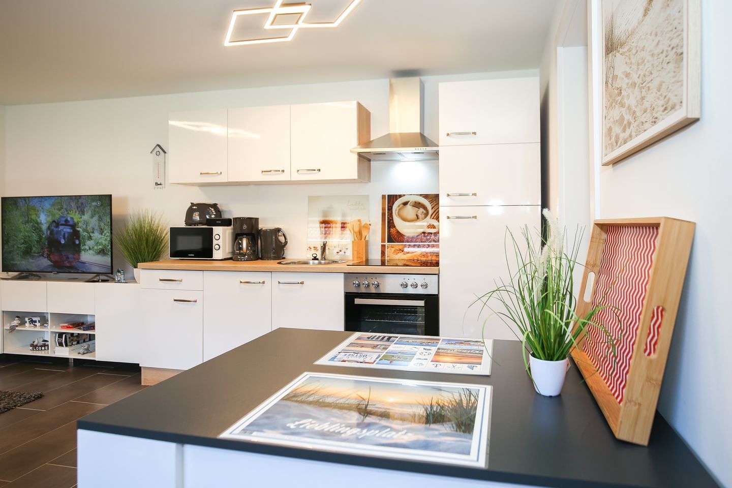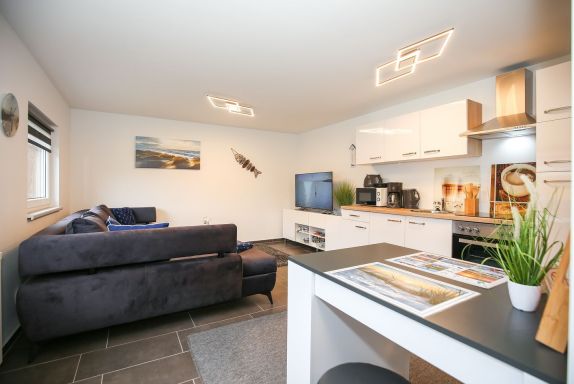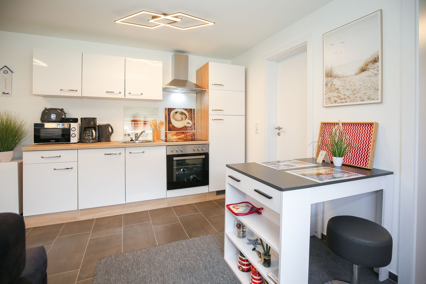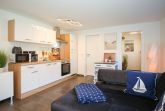 Die angrenzende Küchenzeile ist mit einem 4-Platten-Herd, einem Backofen, einem Kühlschrank mit Gefrierfach, einer Kaffeemaschine, einem Wasserkocher und einem Toaster voll ausgestattet. Der gegenüberliegende Esstisch gewährt Ihnen Platz für entspannte Mahlzeiten. WLAN steht Ihnen kostenfrei zur Verfügung (ohne Gewähr).