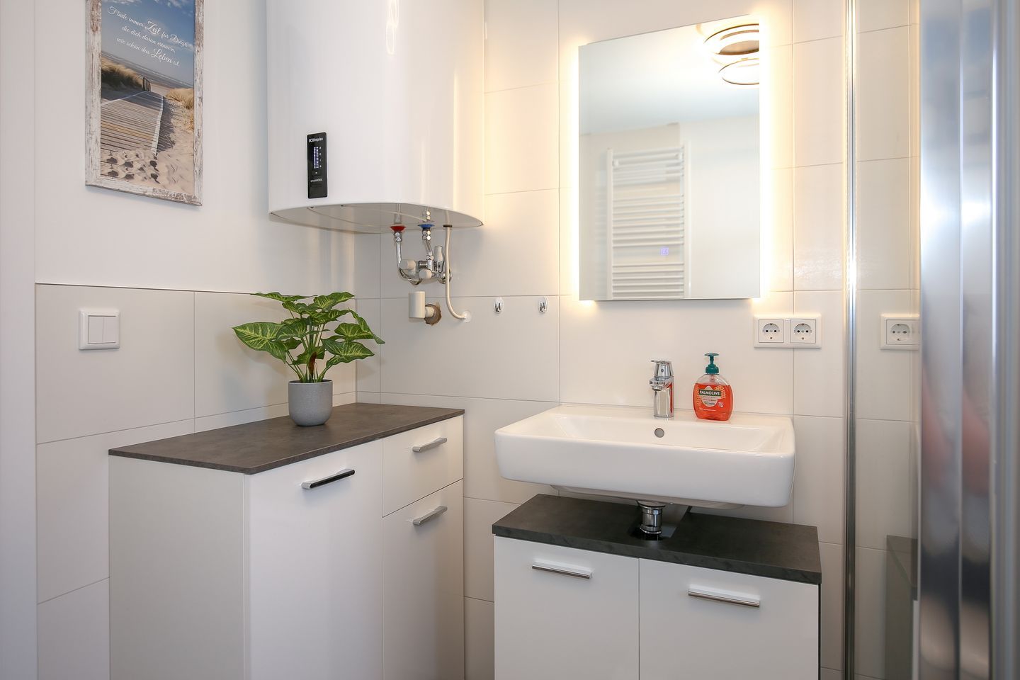 Das Bad mit ebenerdiger Dusche verfügt über ein WC, einen Spiegel, einen Waschtisch und ausreichend Ablagemöglichkeiten.
