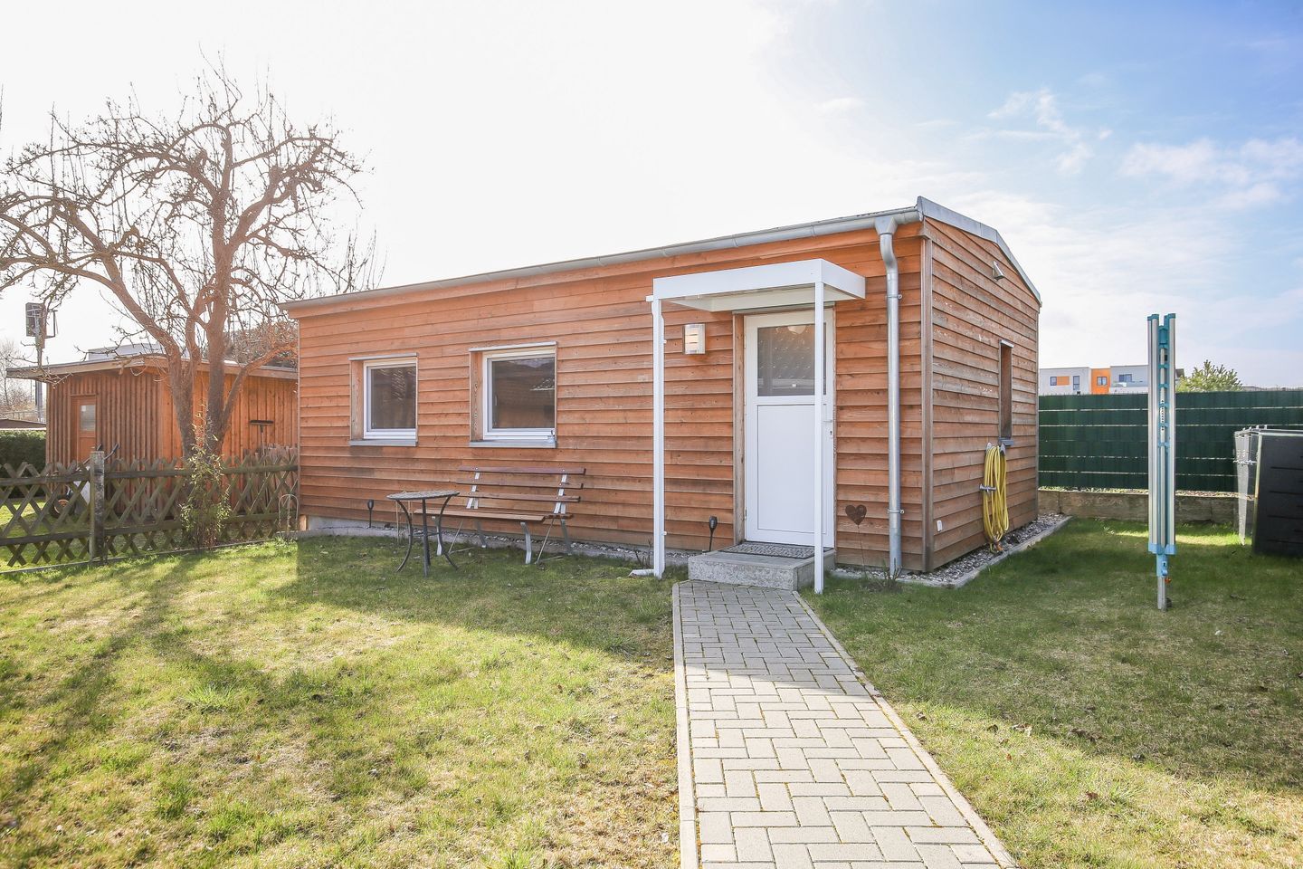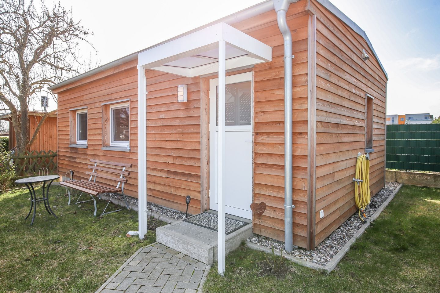 Unsere Gäste können sich in dem Bungalow auf ca. 30 m² wohlfühlen. Der ebenerdige Wohnbereich sowie der Gartenanteil vor dem Bungalow mit Nordostausrichtung lädt dich zu einer erholsamen Auszeit ein.