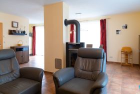 Der offen gestaltete Wohn- und Essbereich mit angrenzender Küche lädt zum Verweilen ein. Große Fensterflächen bringen viel Licht ins Haus und bieten einen schönen Blick ins Grüne. Der Wohnbereich ist komfortabel eingerichtet perfekt für gemütliche Abende mit Familie oder Freunden.