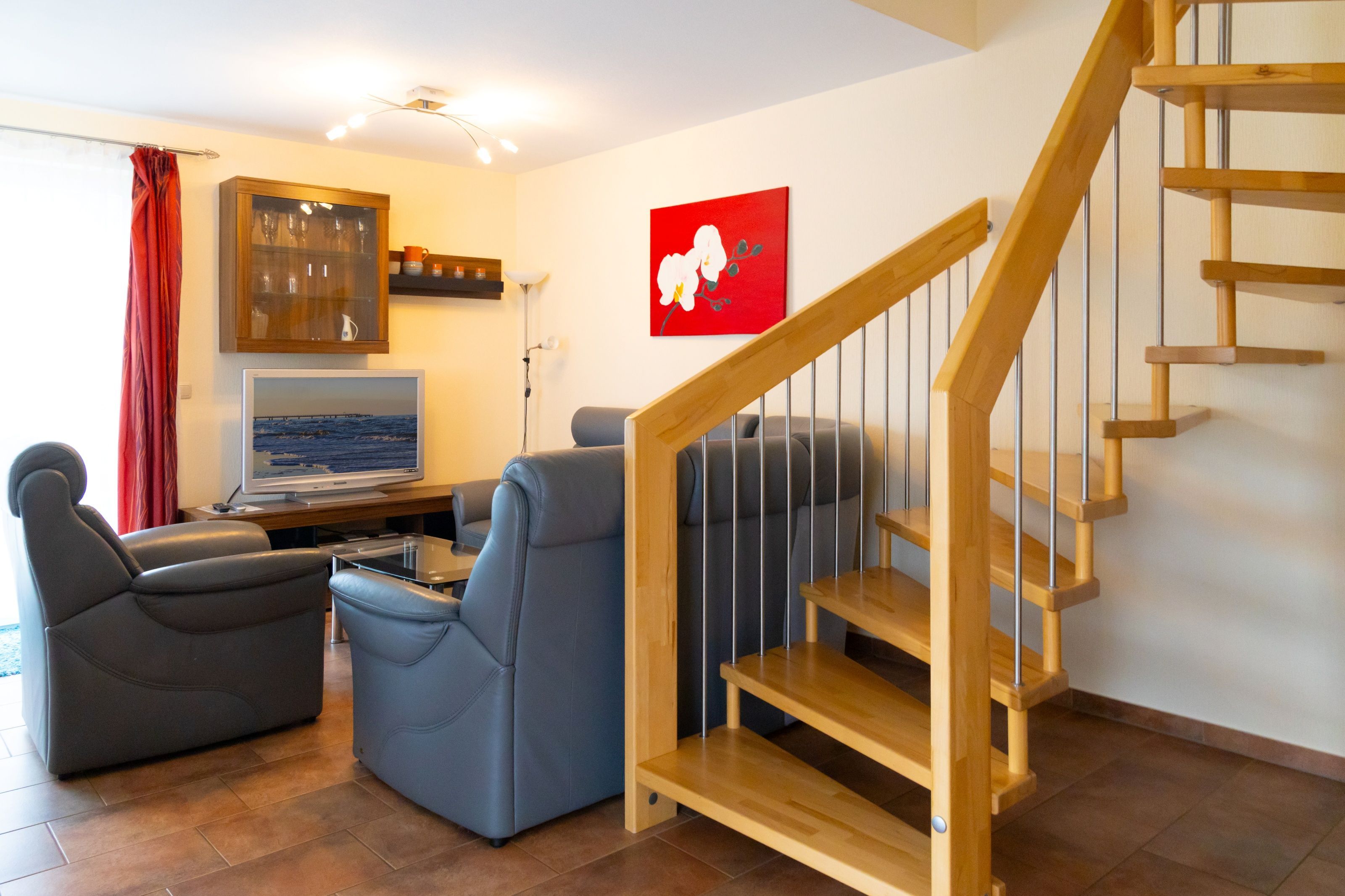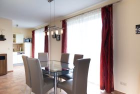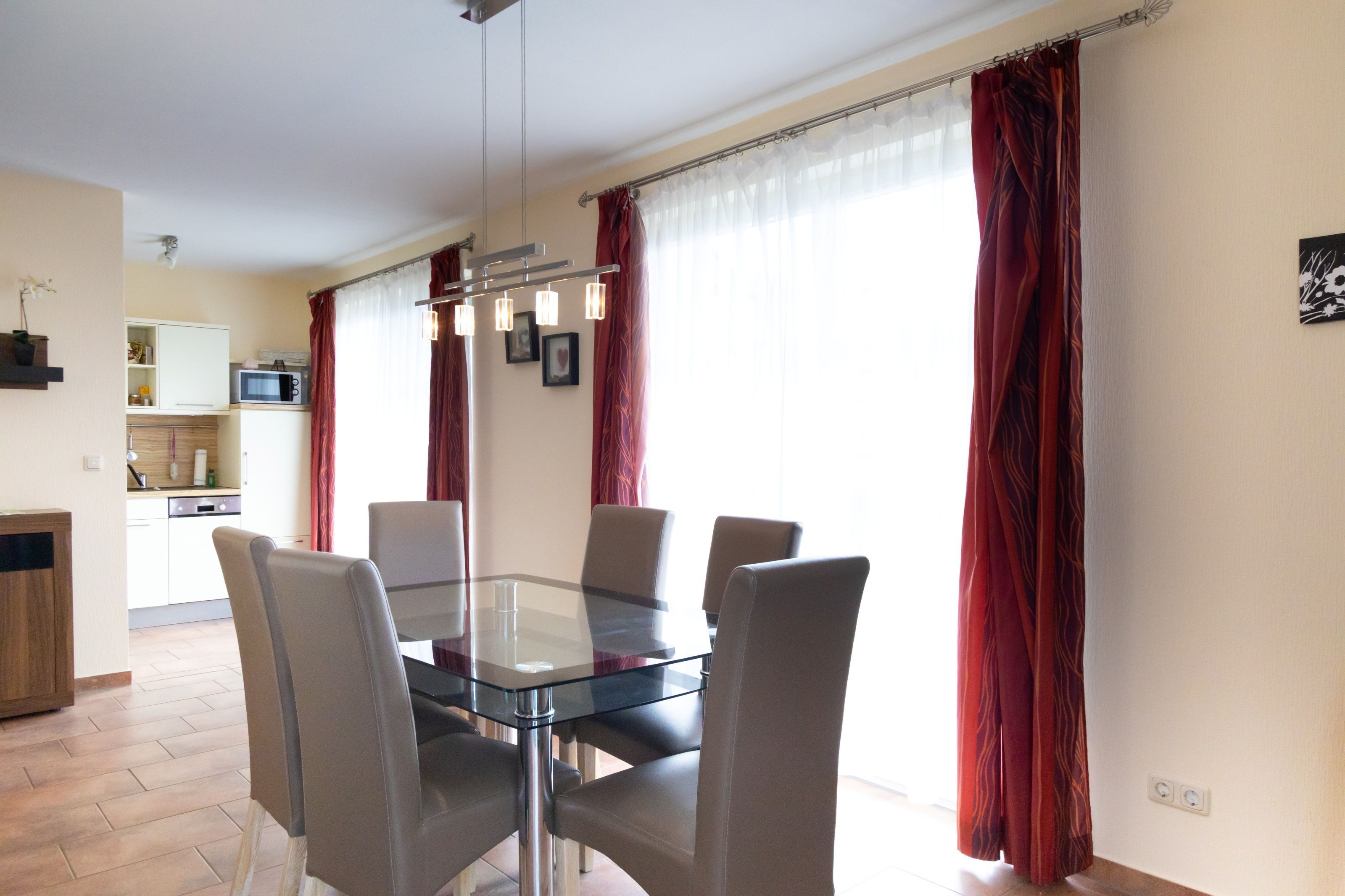 Unser stilvoll eingerichteter Wohnbereich lädt zum Entspannen ein. Hier finden Sie eine bequeme Ledersitzgarnitur, eine moderne Wohnwand, eine HiFi-Stereoanlage und Kabel-TV. Der helle Erker im Essbereich bietet einen gemütlichen Ort zum Verweilen. Die komplett ausgestattete Küche verfügt über ein Induktionskochfeld, Backofen, Spülmaschine, Kühlschrank mit Gefrierfach, Kaffeemaschine, Toaster, Wasserkocher und weitere Kleingeräte alles, um Ihren Aufenthalt so angenehm wie möglich zu gestalten.
