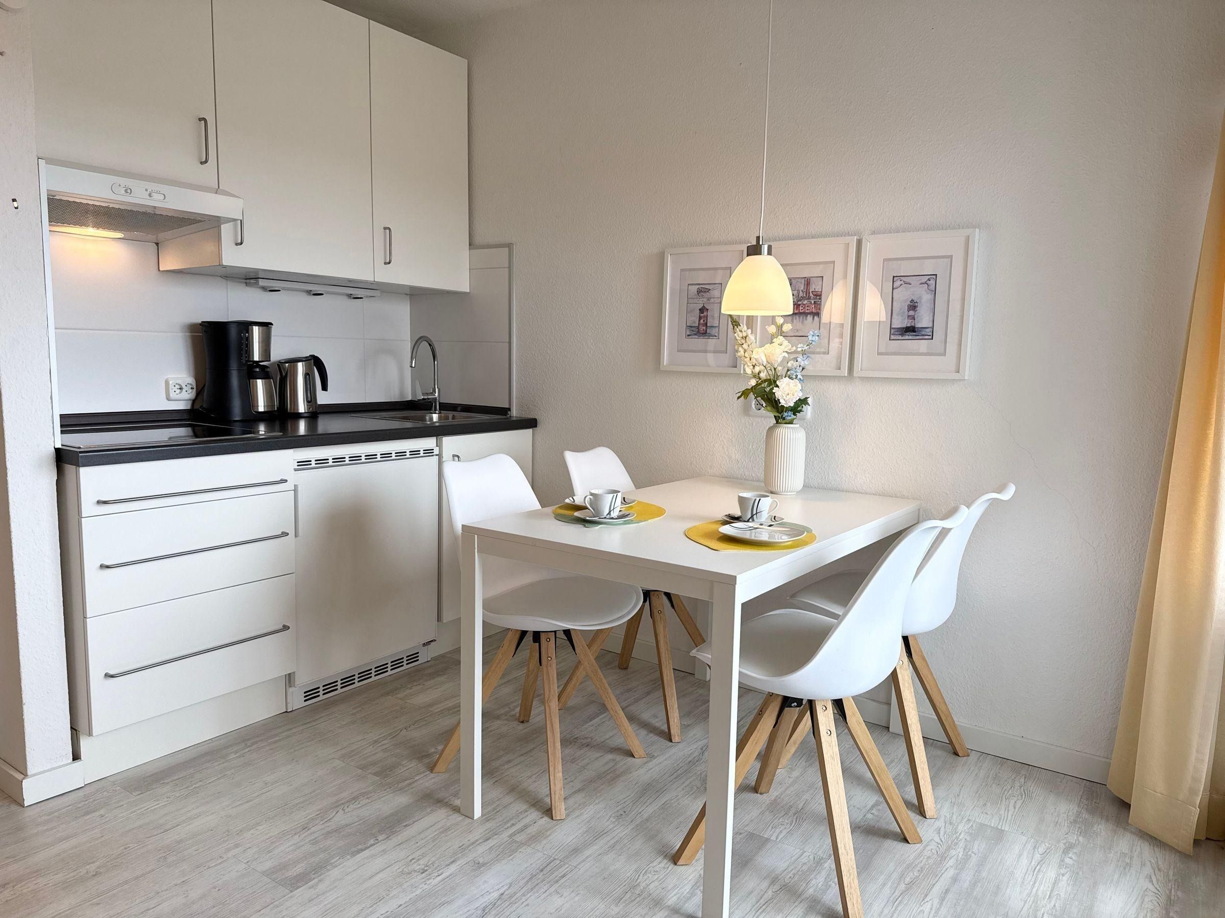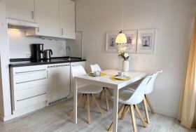Die Ferienwohnung im Haus Poseidon, Nr. 28, befindet sich im 3. Stock und ist bequem mit dem Aufzug erreichbar. Sie bietet Platz für bis zu 4 Personen und zeichnet sich durch eine offene Wohnküche aus, die an den einladenden Wohnbereich mit Sofaecke und TV angrenzt. Im separaten Schlafzimmer steht ein 180 cm breites Bett bereit. Die gut ausgestattete Küchenzeile umfasst Herd, Kühlschrank, Kaffeemaschine, Wasserkocher und Toaster. Ein modernes Badezimmer mit Dusche, Waschbecken und WC sowie ein möblierter überdachter Balkon ergänzen die Ausstattung. Für die Erholung stehen eine gemeinschaftliche Sauna und ein Ruheraum zur Verfügung, ebenso eine Waschmaschine und ein Trockner. Eine Garage für das Fahrzeug ist ebenfalls vorhanden. Ideal für einen entspannten Aufenthalt in der Nähe des Sandstrandes von Cuxhaven-Duhnen.