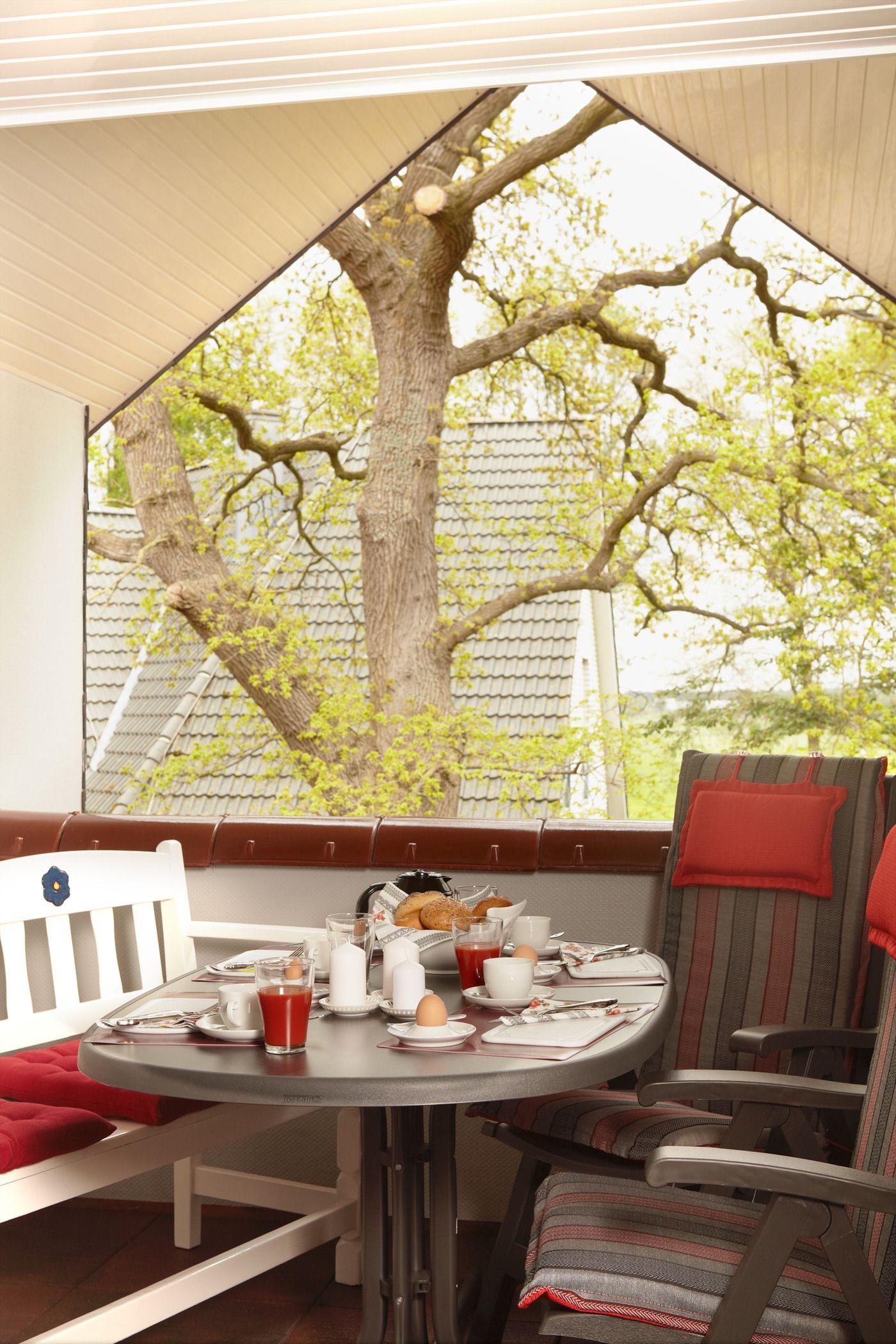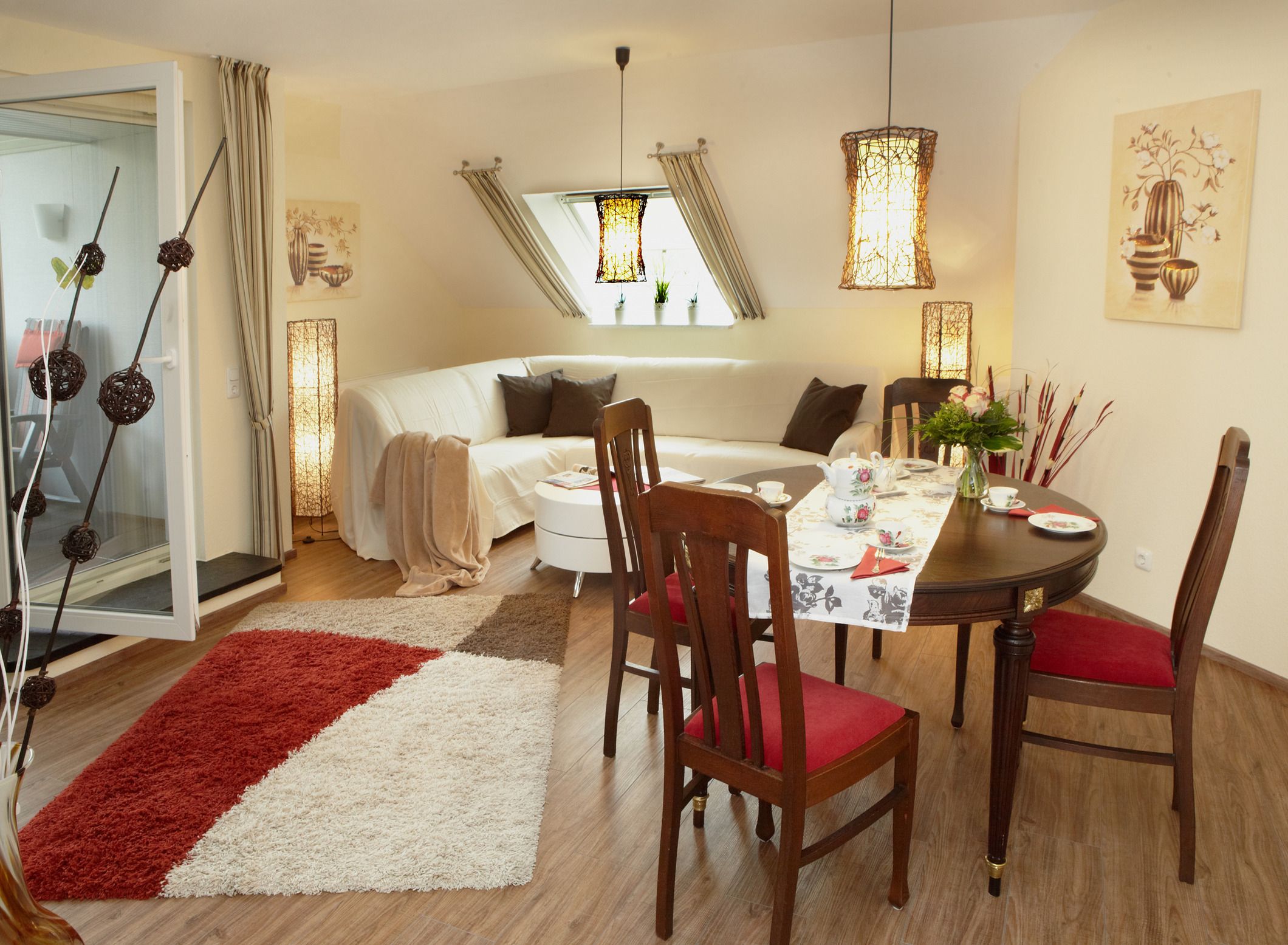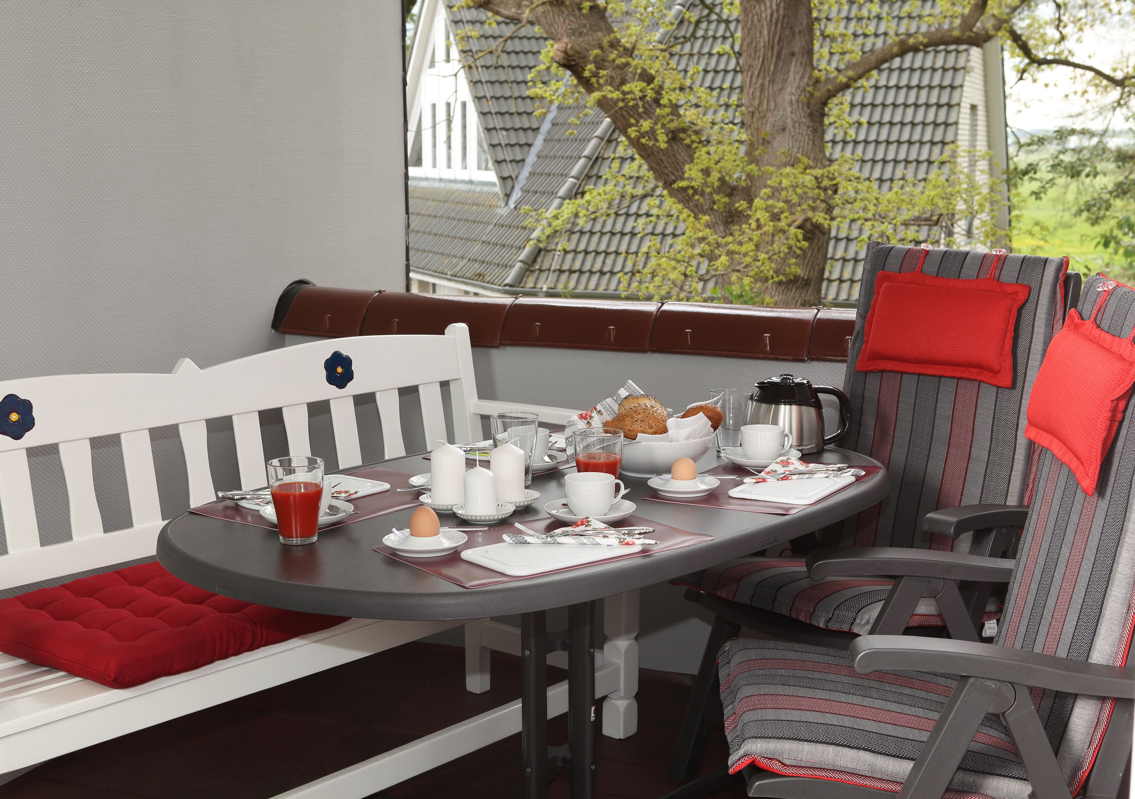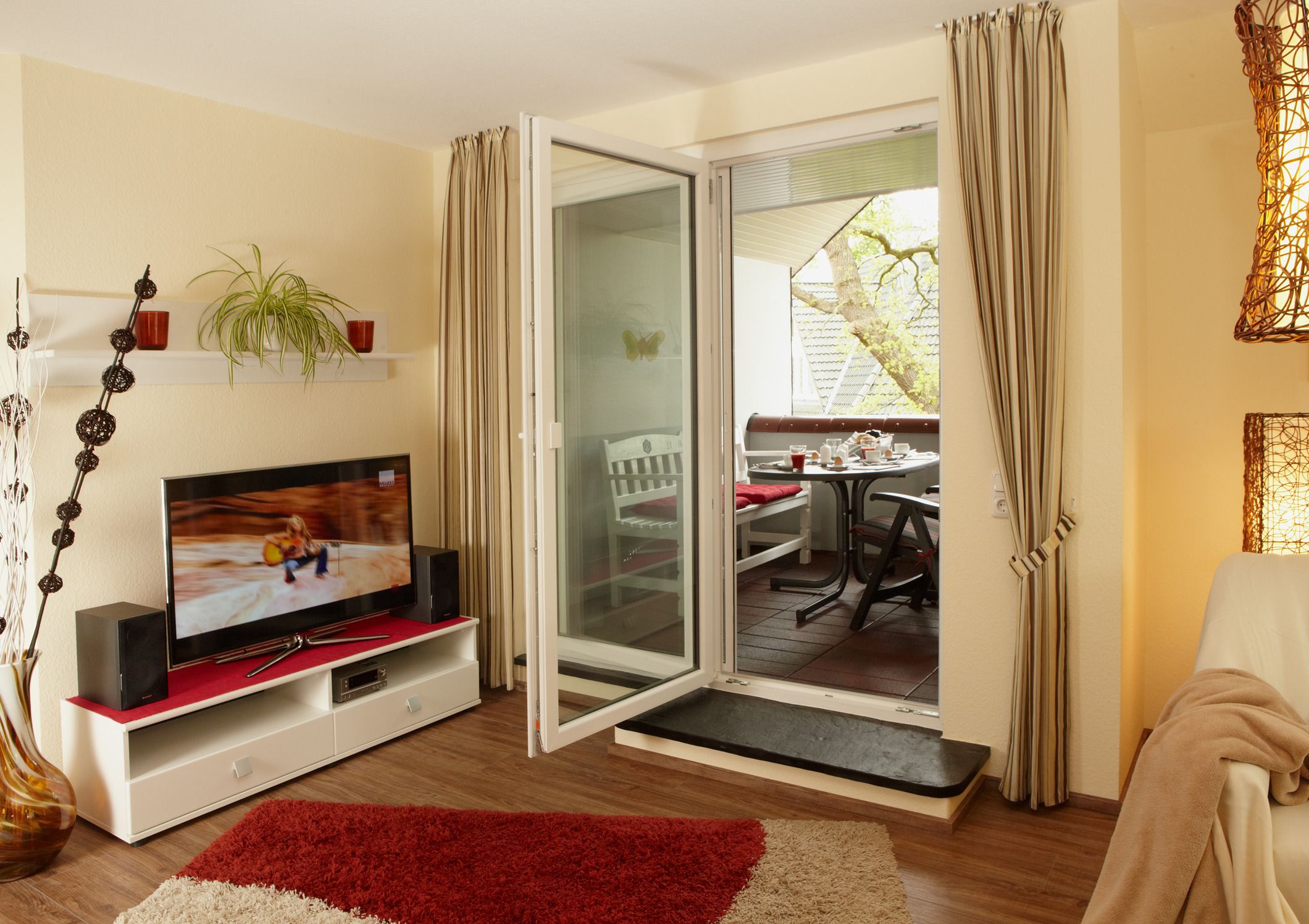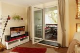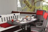 Im gemütlichen Wohnzimmer steht Ihnen ein Kuschelbereich mit Flachbild-Fernseher, DVD-Player, Stereoanlage mit CD-Player sowie extra Esszimmermöbel zur Verfügung. Die angrenzende, überdachte Loggia mit Gartenmöbel und Auflagen lädt zum Verweilen ein.