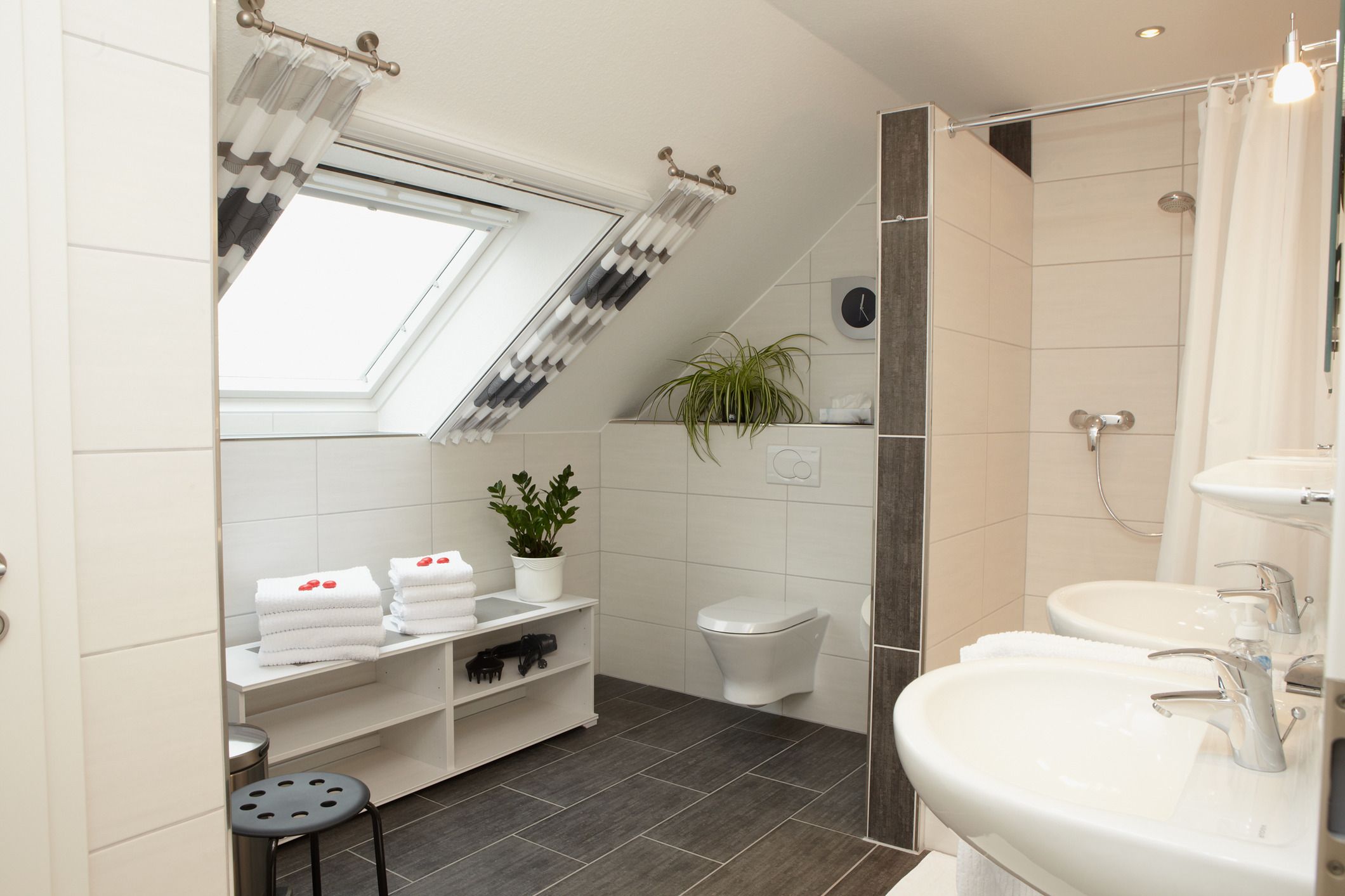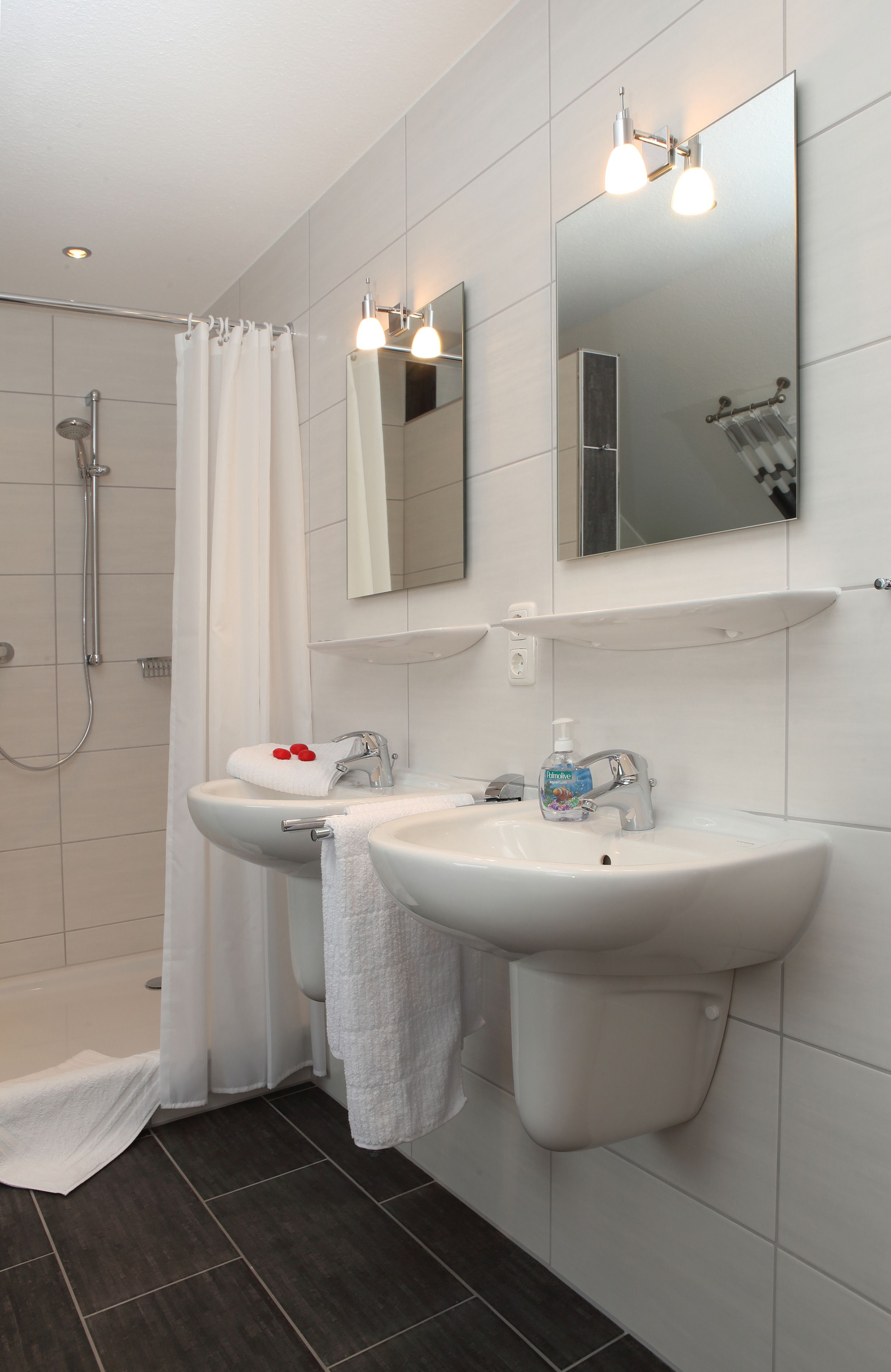 Das Badezimmer verfügt über Dusche, WC, sowie zwei Waschbecken.