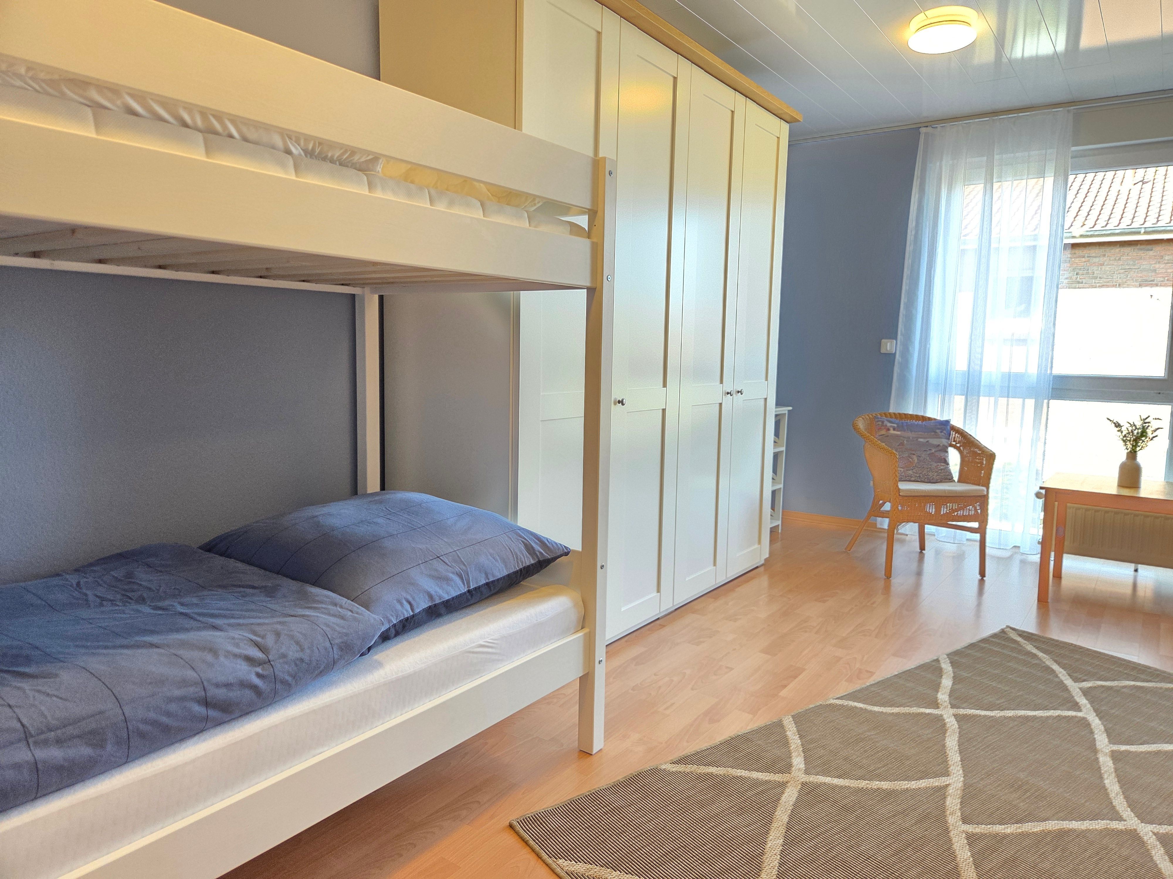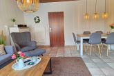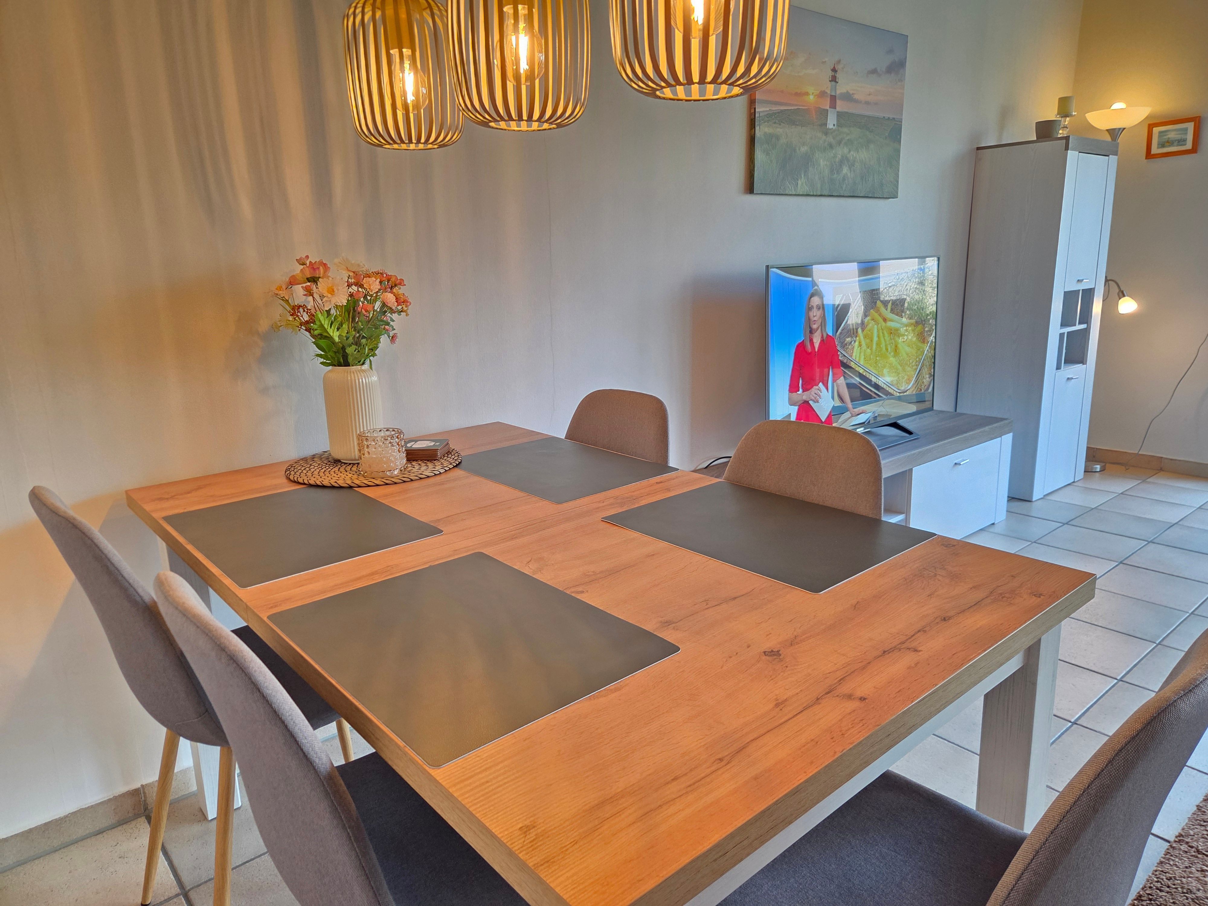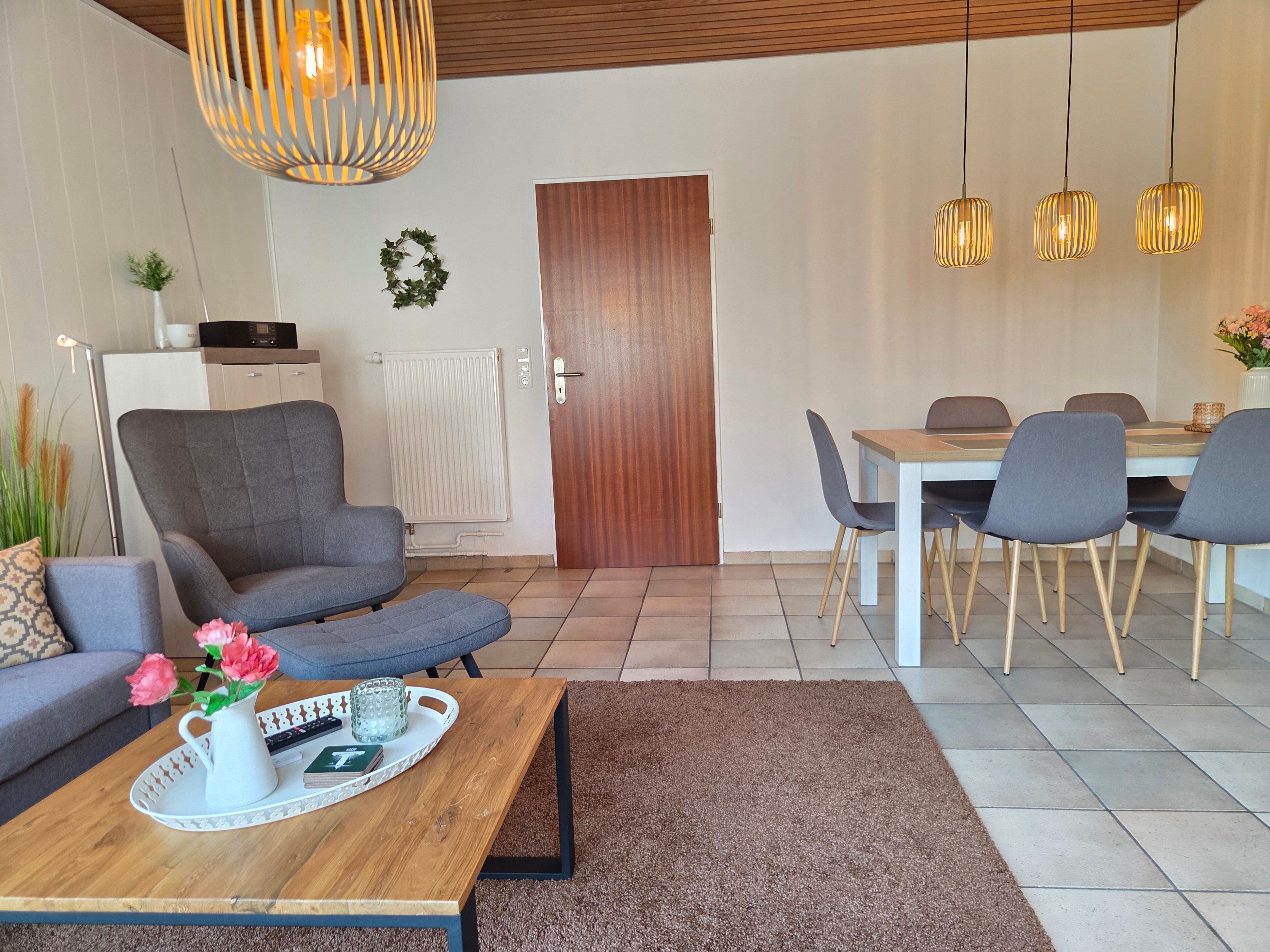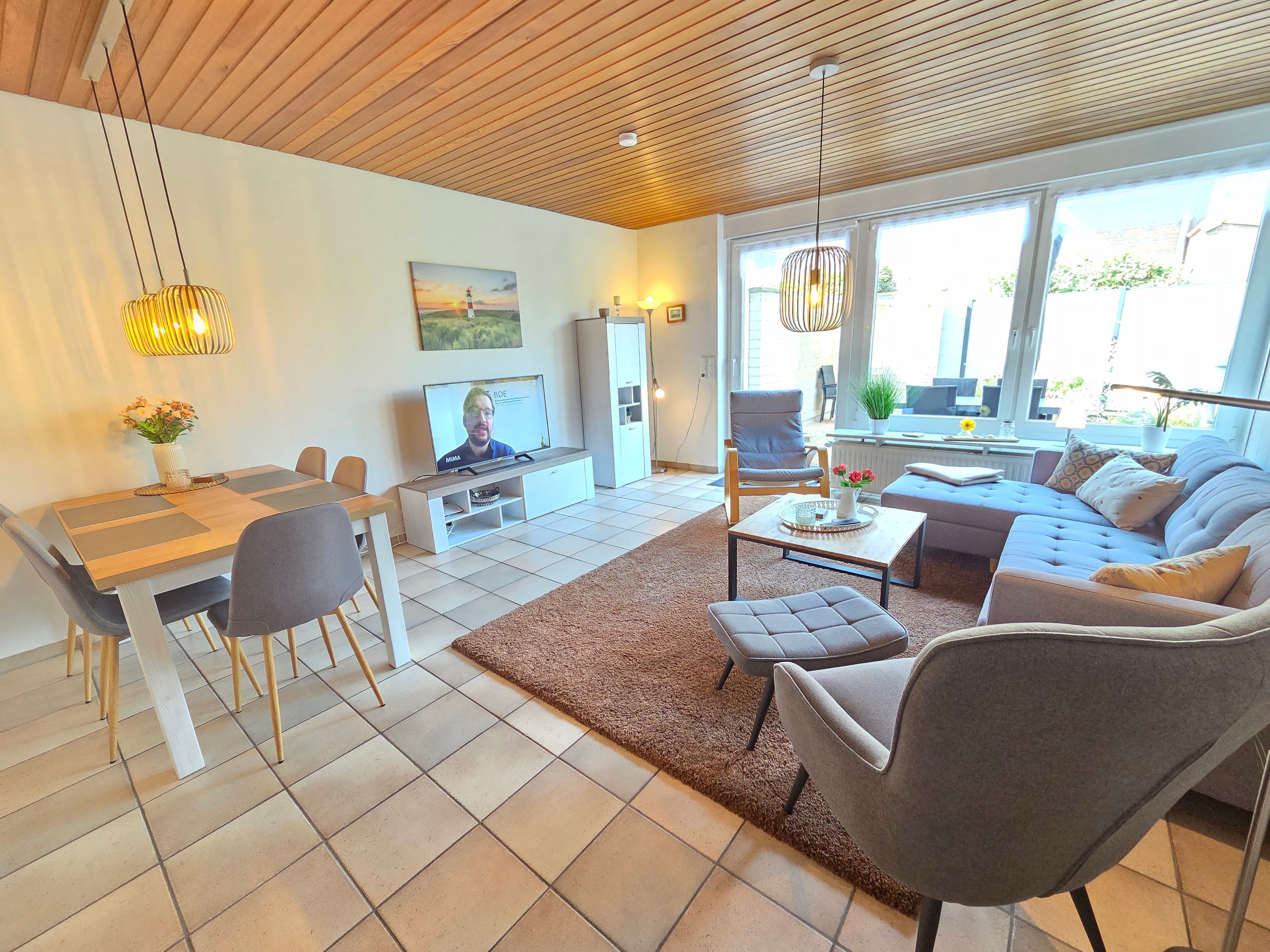 Neben einem geräumigen Wohn- und Essbereich, sowie einer vollausgestattenen Küche stehen Ihnen zwei Schlafzimmer (1 Schlafzimmer mit Doppelbett, 1 Schlafzimmer mit 2 Einzelbetten, einem Etagenbett und TV) zur Verfügung. Zudem ist ein Duschbad sowie ein Gäste-WC vorhanden.