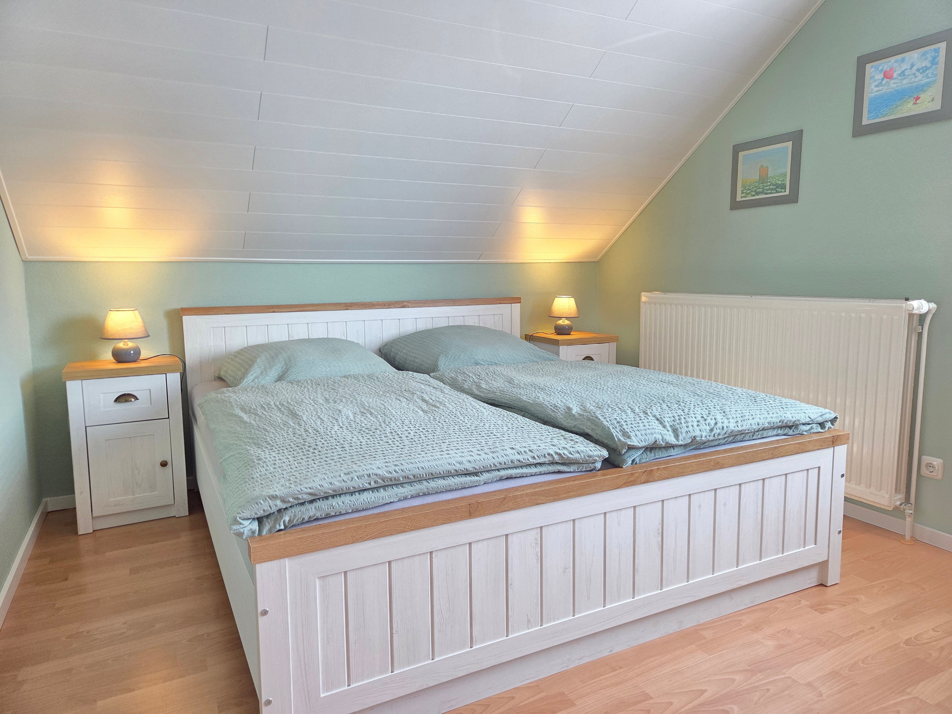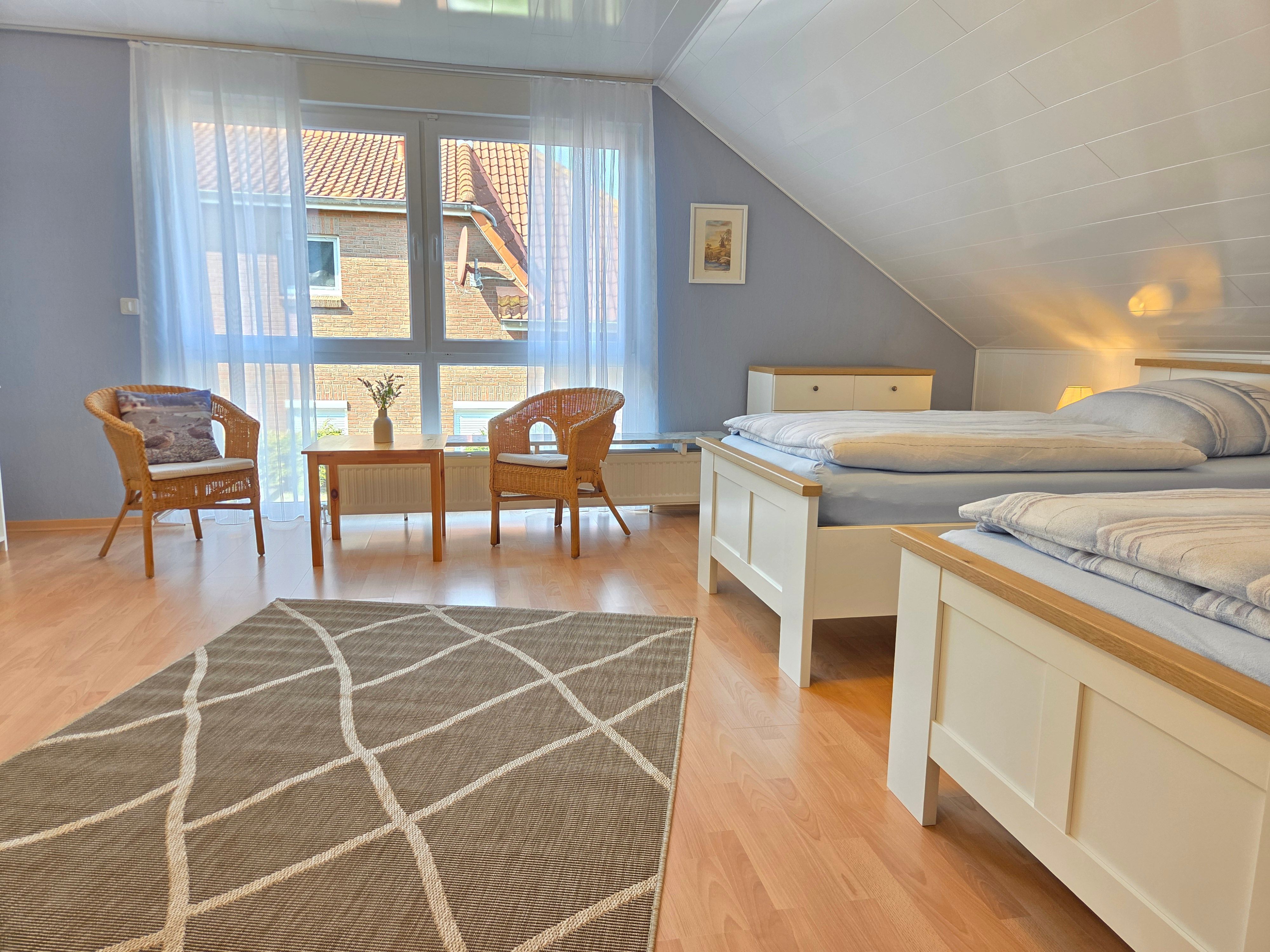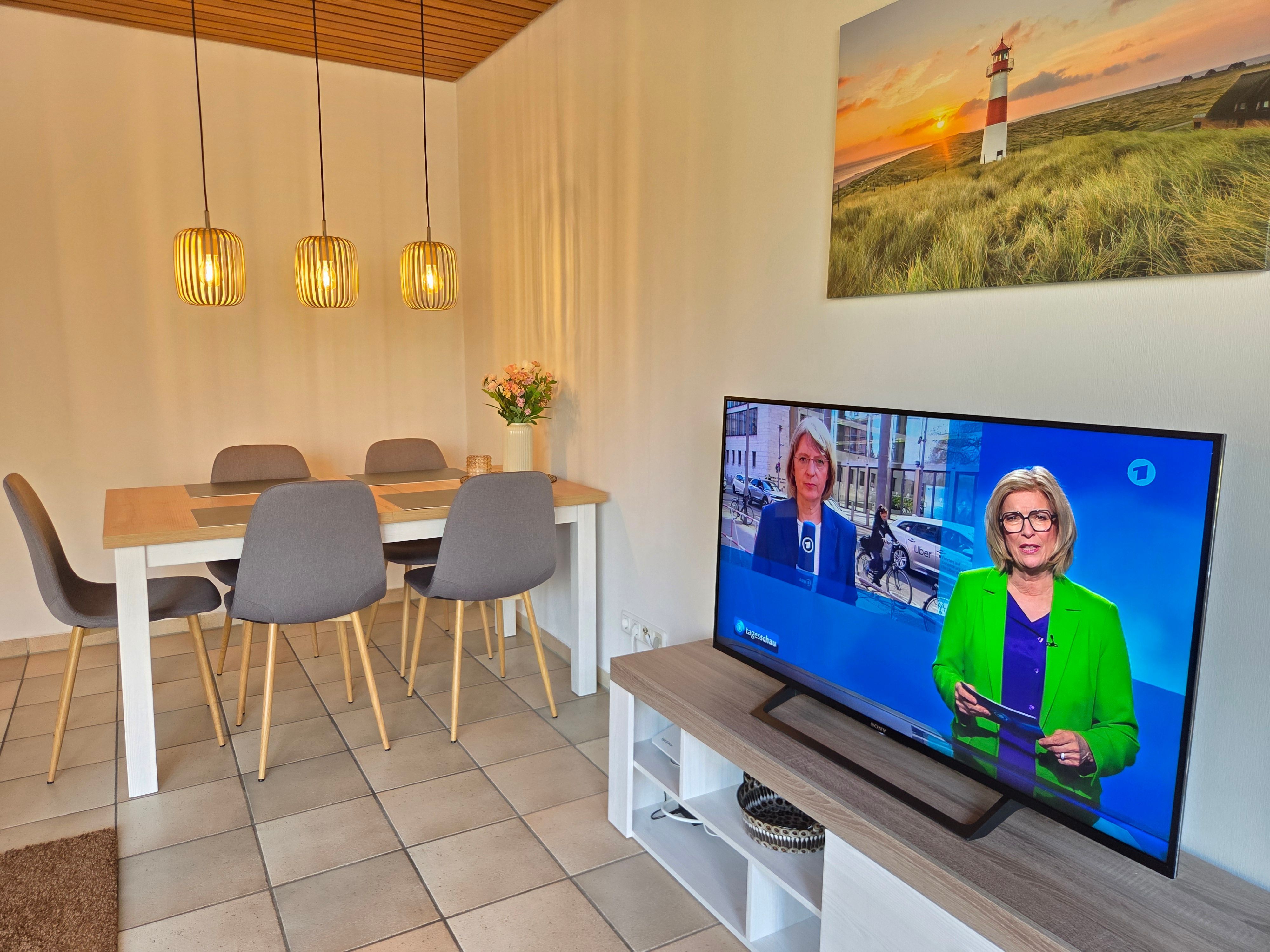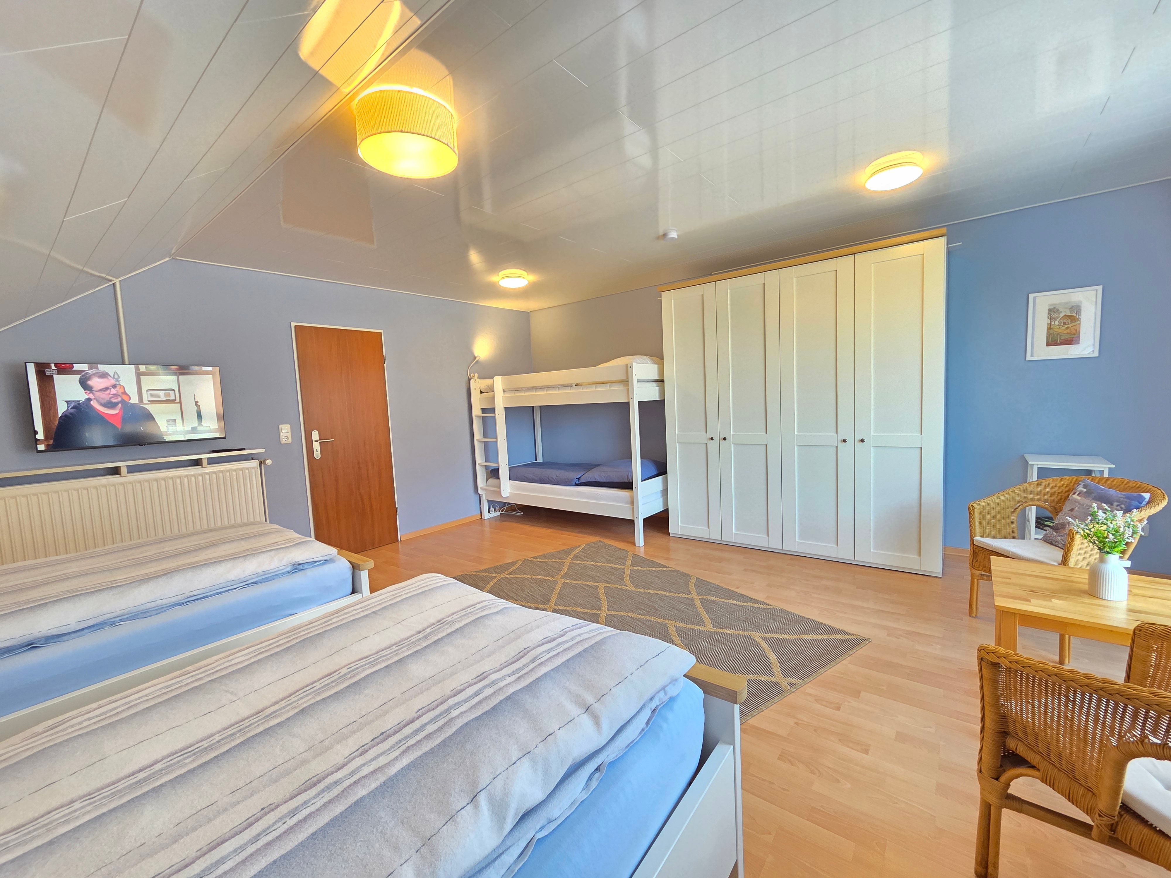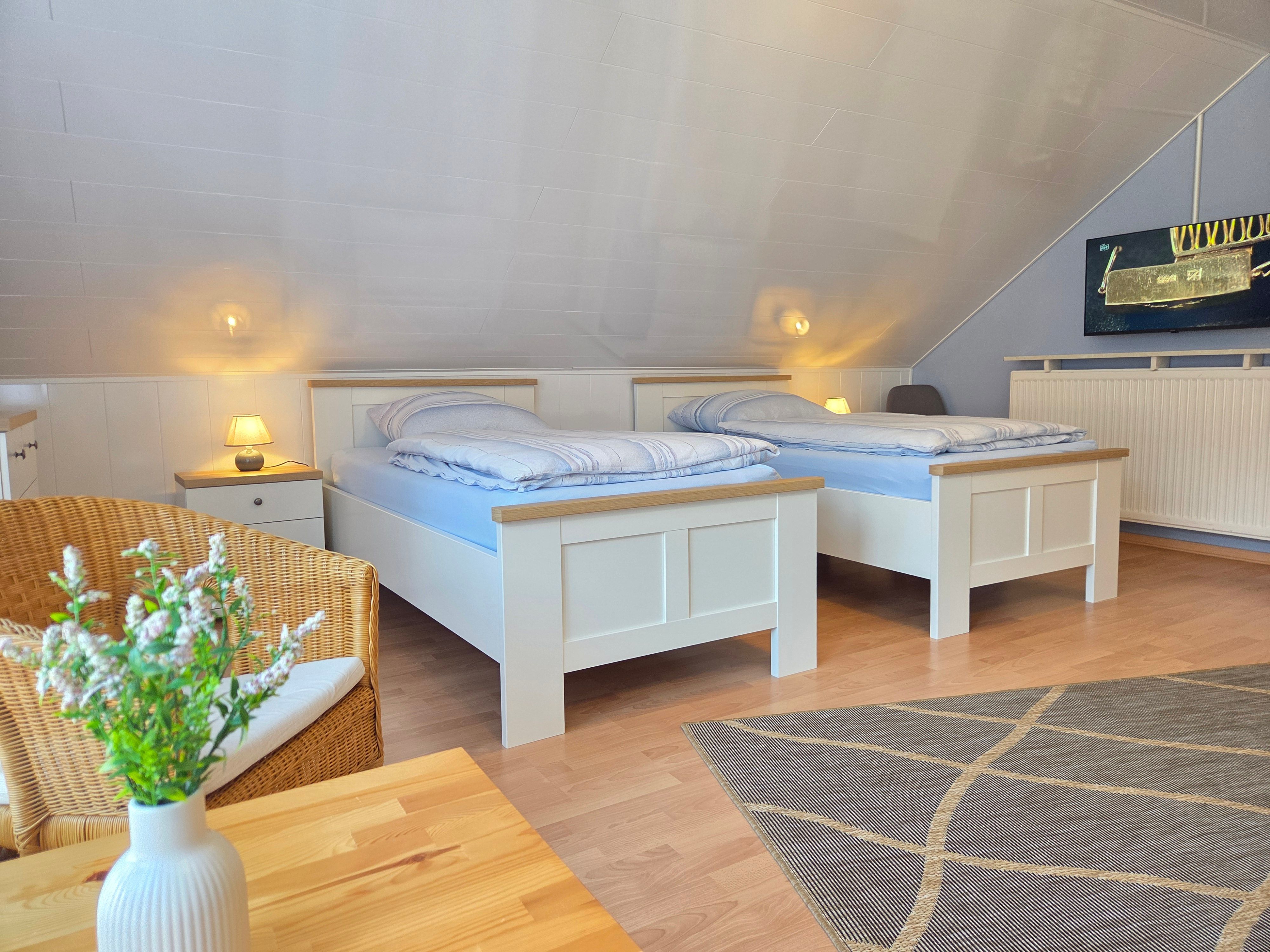 Neben einem geräumigen Wohn- und Essbereich, sowie einer vollausgestattenen Küche stehen Ihnen zwei Schlafzimmer (1 Schlafzimmer mit Doppelbett, 1 Schlafzimmer mit 2 Einzelbetten, einem Etagenbett und TV) zur Verfügung. Zudem ist ein Duschbad sowie ein Gäste-WC vorhanden.