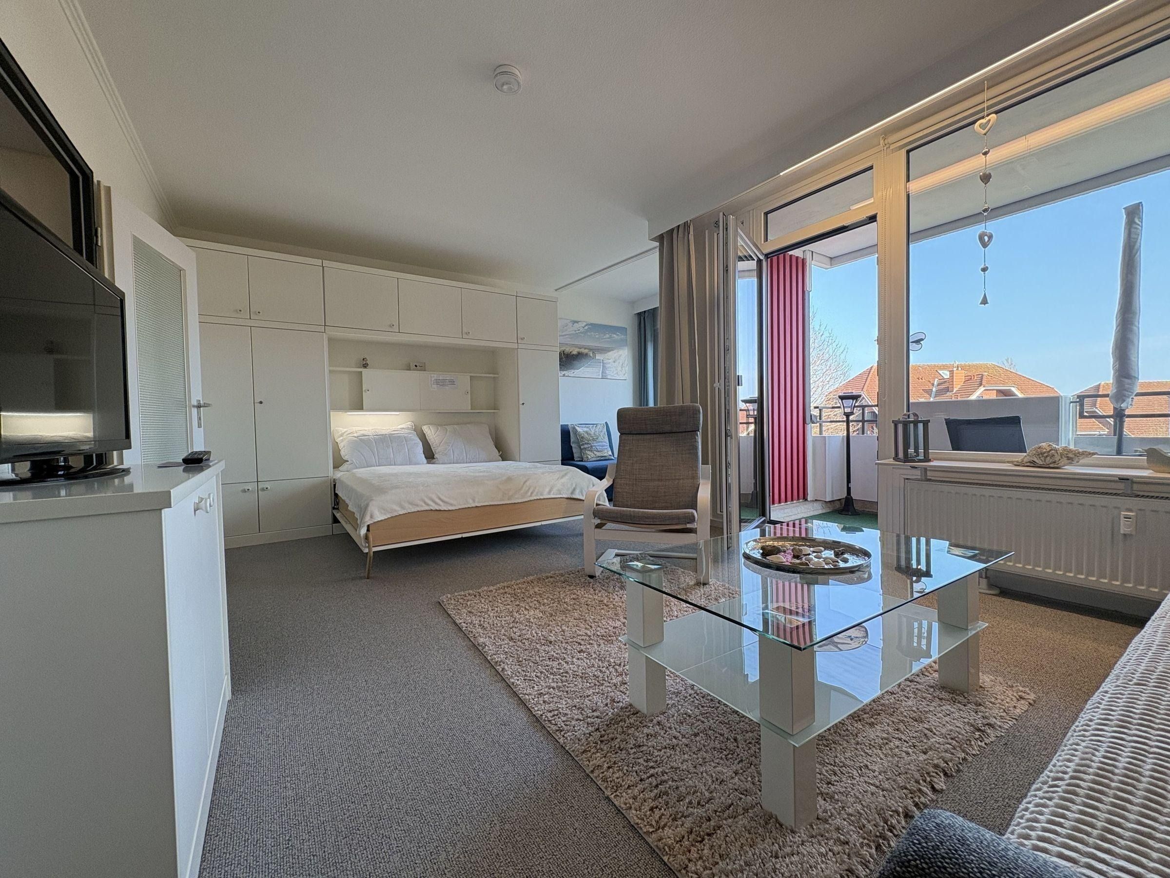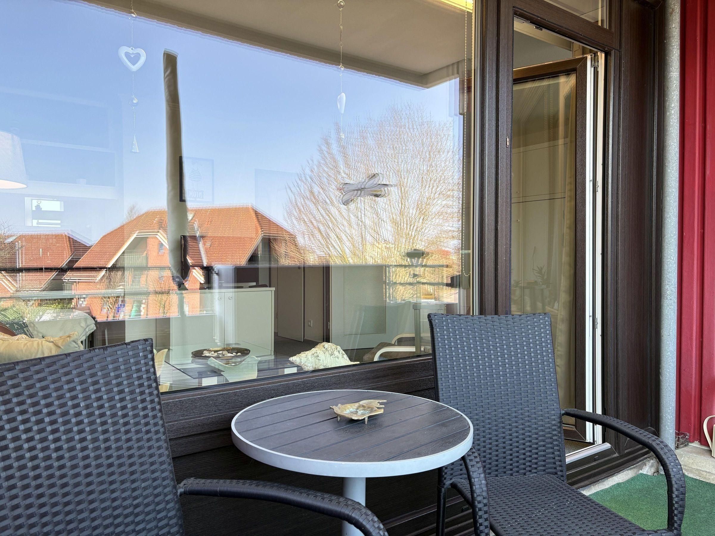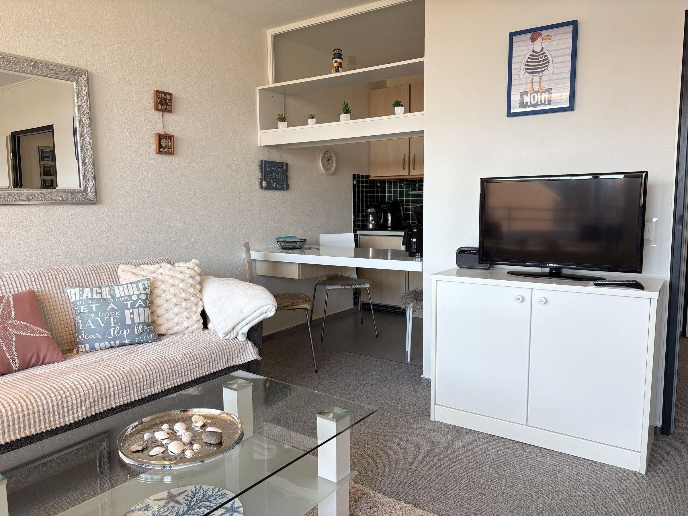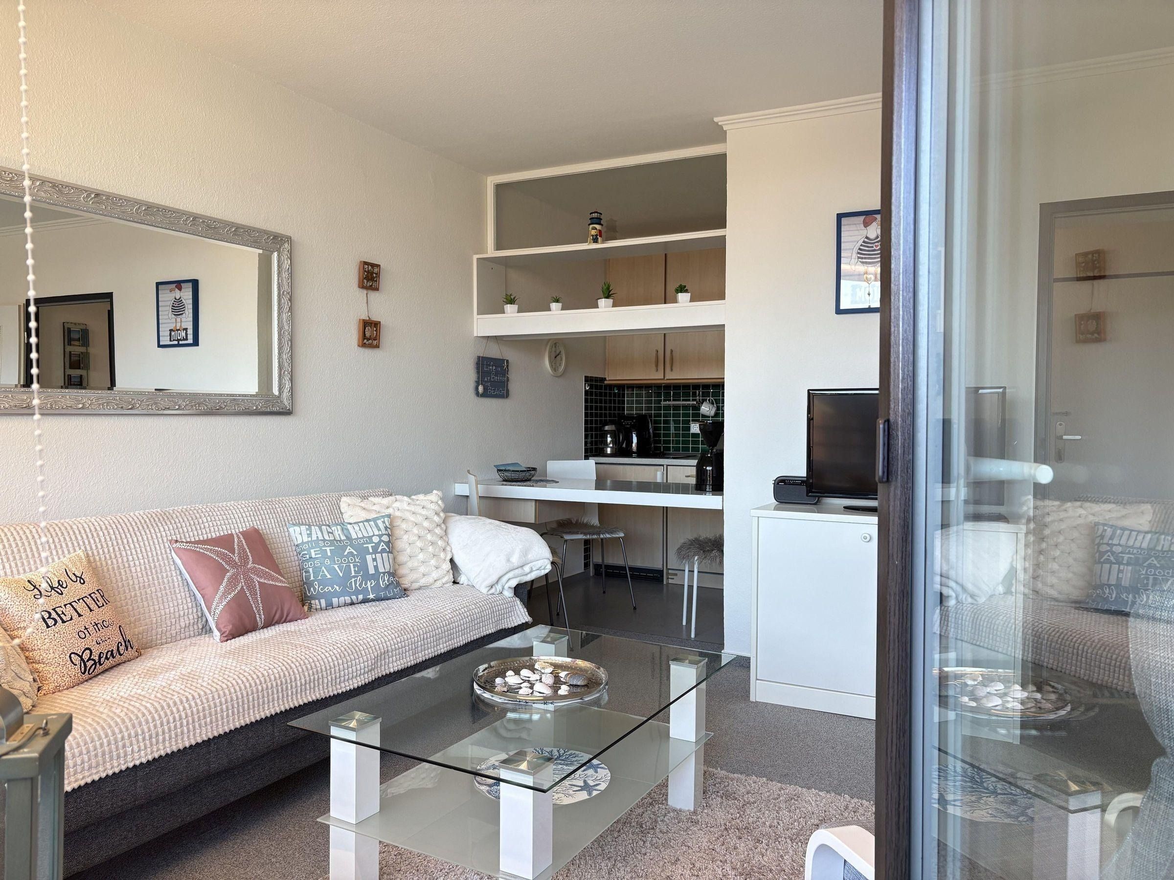 Das 1-Zimmer-Appartement in Dahme bietet Platz für 2 Personen, einen überdachten Balkon, hauseigenes Schwimmbad und direkten Zugang zum 6,5 km langen Sandstrand – ideal für erholsame Urlaubstage!