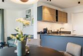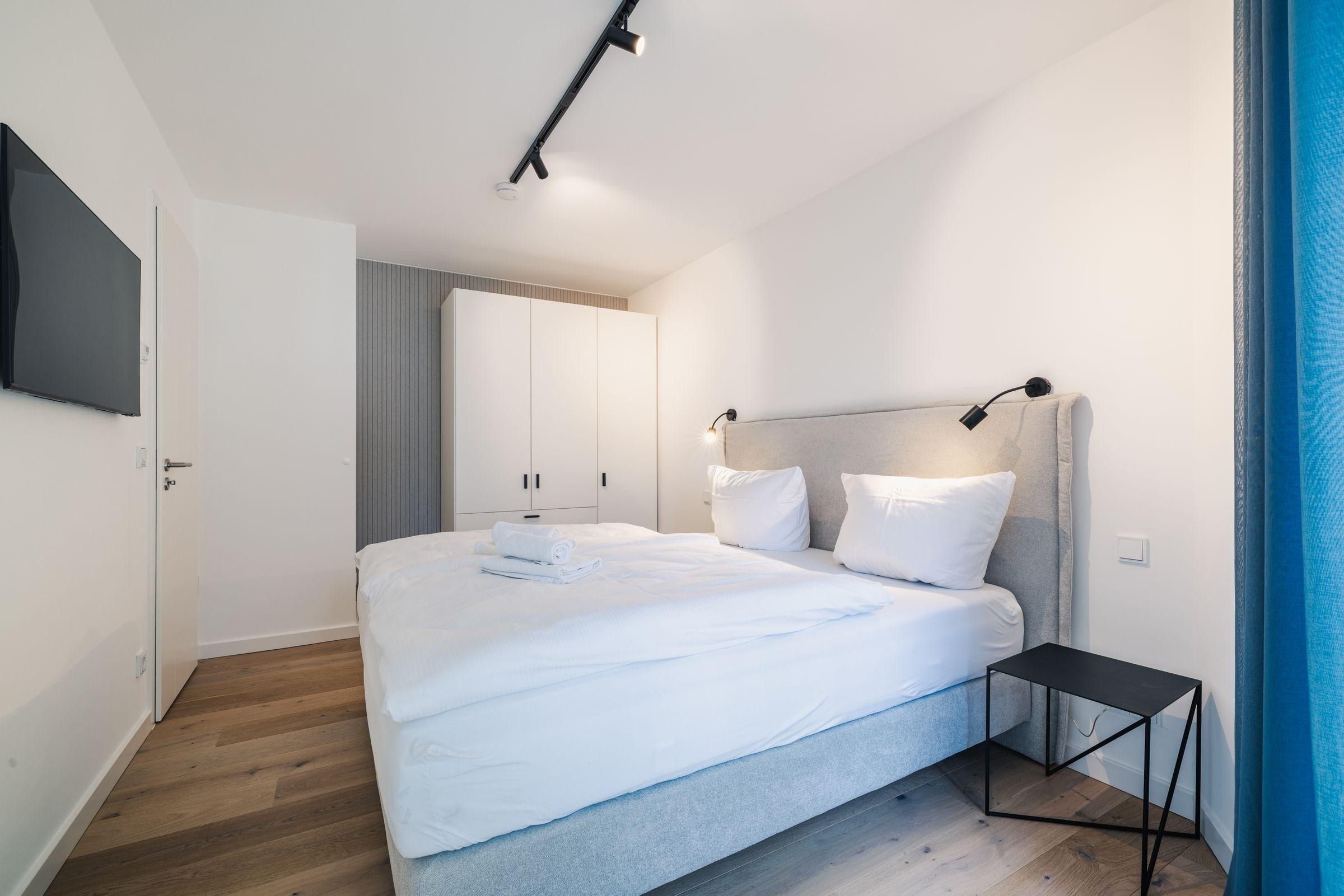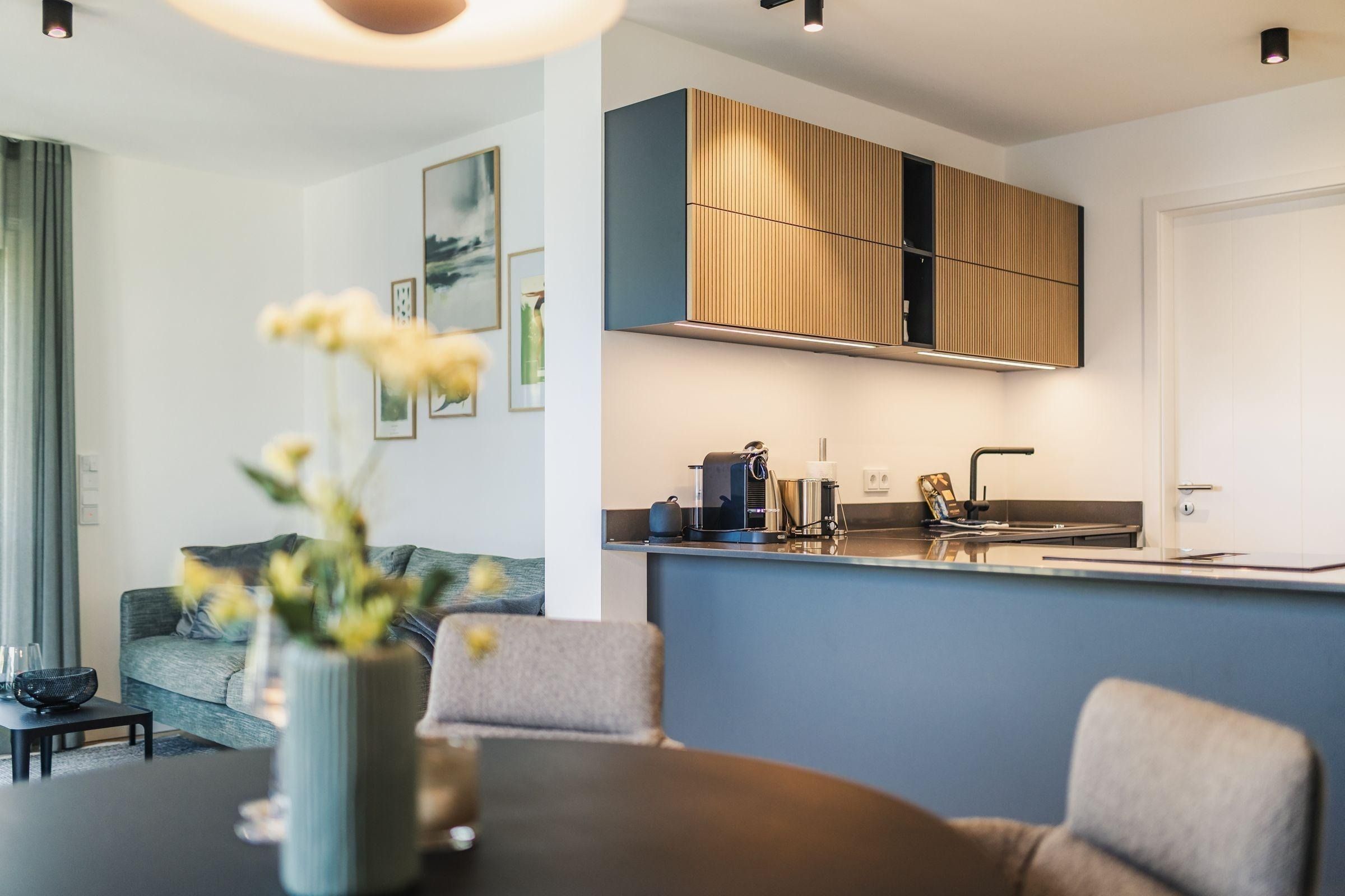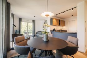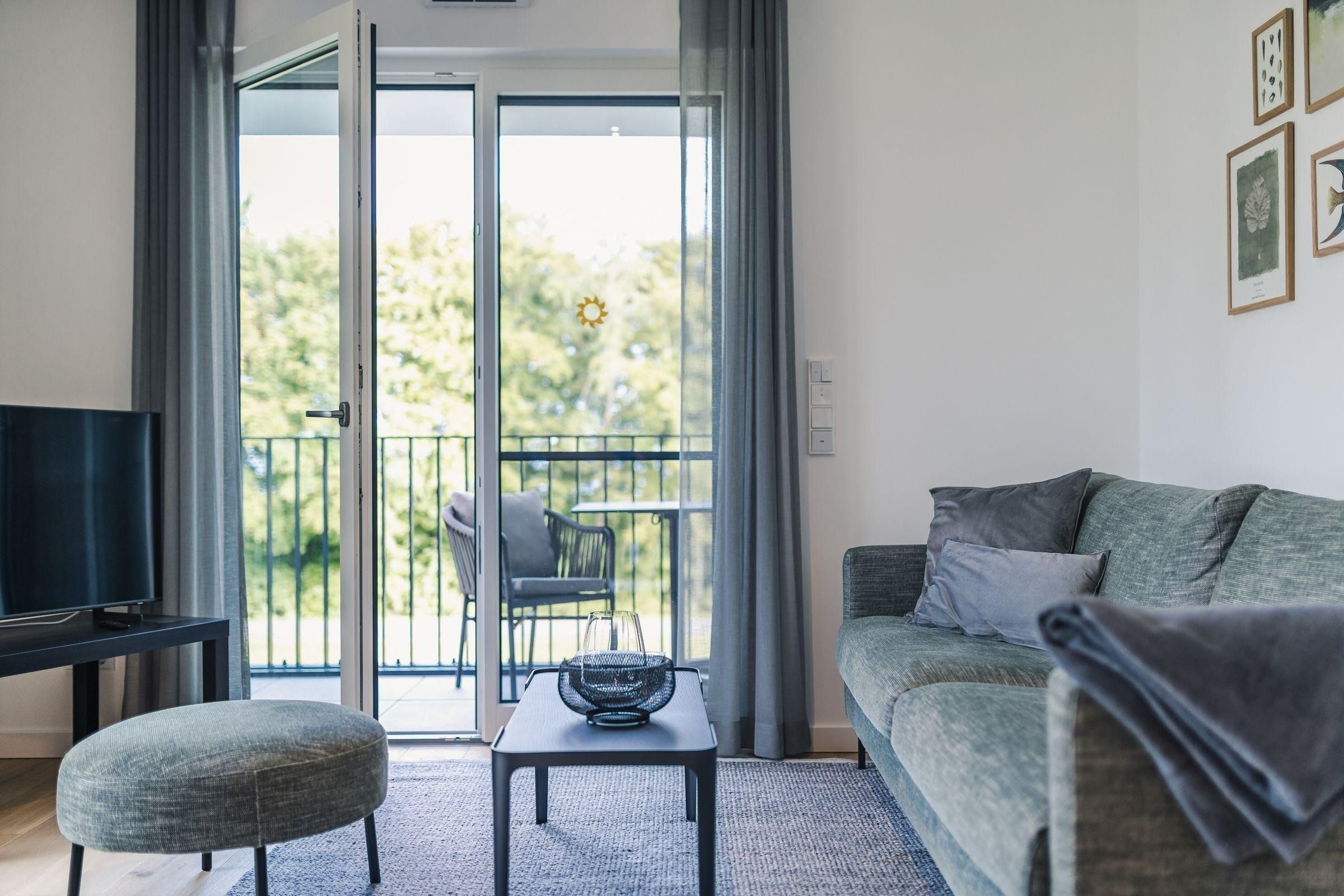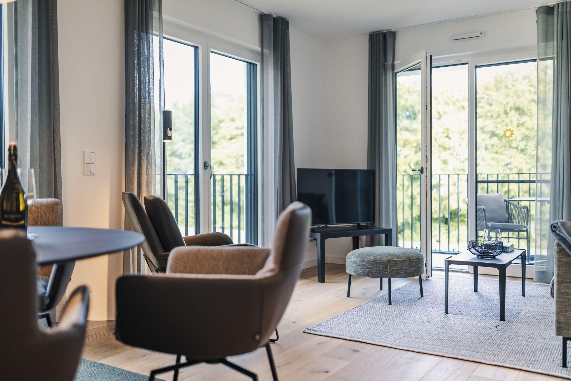 Die Ferienwohnung Strandvilla Zingst - AP 11 ist eine komfortable Unterkunft im 2. Stock eines neu erbauten Hauses in direkter Strandlage. Auf 60 m² bietet sie Platz für zwei Personen in einem Schlafzimmer mit einem Doppelbett (180x200 cm), einem Badezimmer sowie einem Wohn- und Essbereich mit offener Küche. Der Wohnbereich ist modern mit Sofa, Sessel, Esstisch und TV ausgestattet. Die offene Küche ist hochwertig mit Induktionsherd, Backofen, Kühlschrank mit Gefrierfach und sämtlichem Küchenzubehör eingerichtet. Das Badezimmer verfügt über eine bodengleiche Dusche und praktische Accessoires. Eine eigene Sauna ermöglicht entspannende Wellnessmomente. Zur Ausstattung gehören zudem eine Waschmaschine, ein Trockner sowie ein überdachter Balkon mit Gartenmöbeln. Ein Aufzug erleichtert den Zugang, und es stehen Parkplätze sowie Ladesäulen für Elektroautos zur Verfügung.