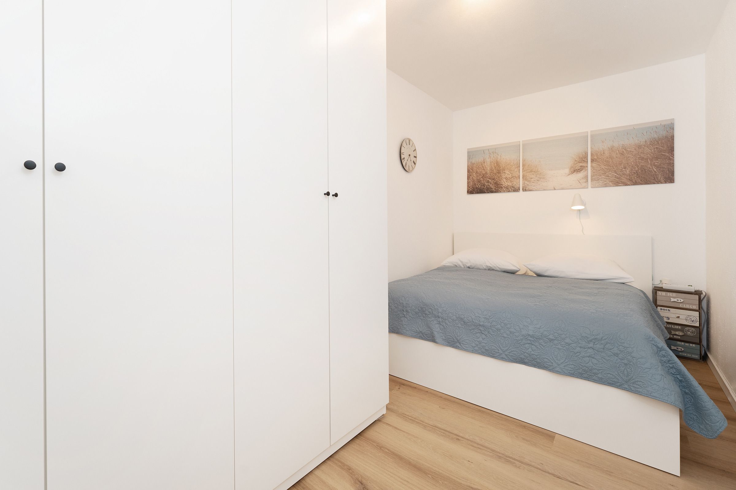 Schlafzimmer: 2x Einzelbett (2x 80 x 200 cm), Kleiderschrank, Verdunkelung: Wabenplissee, Platz für ein Babybett vorhanden