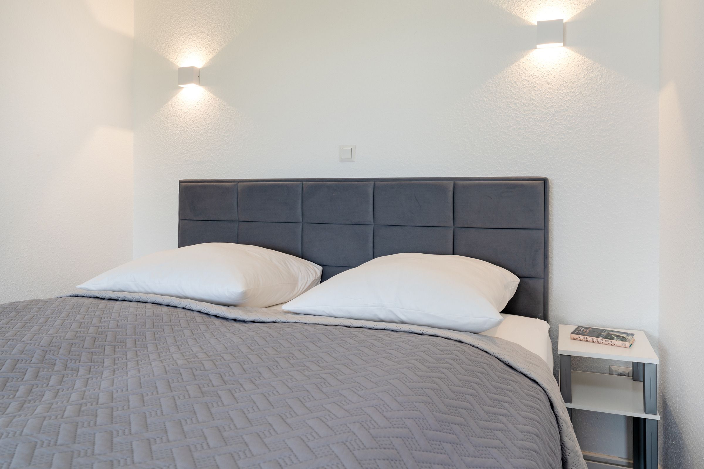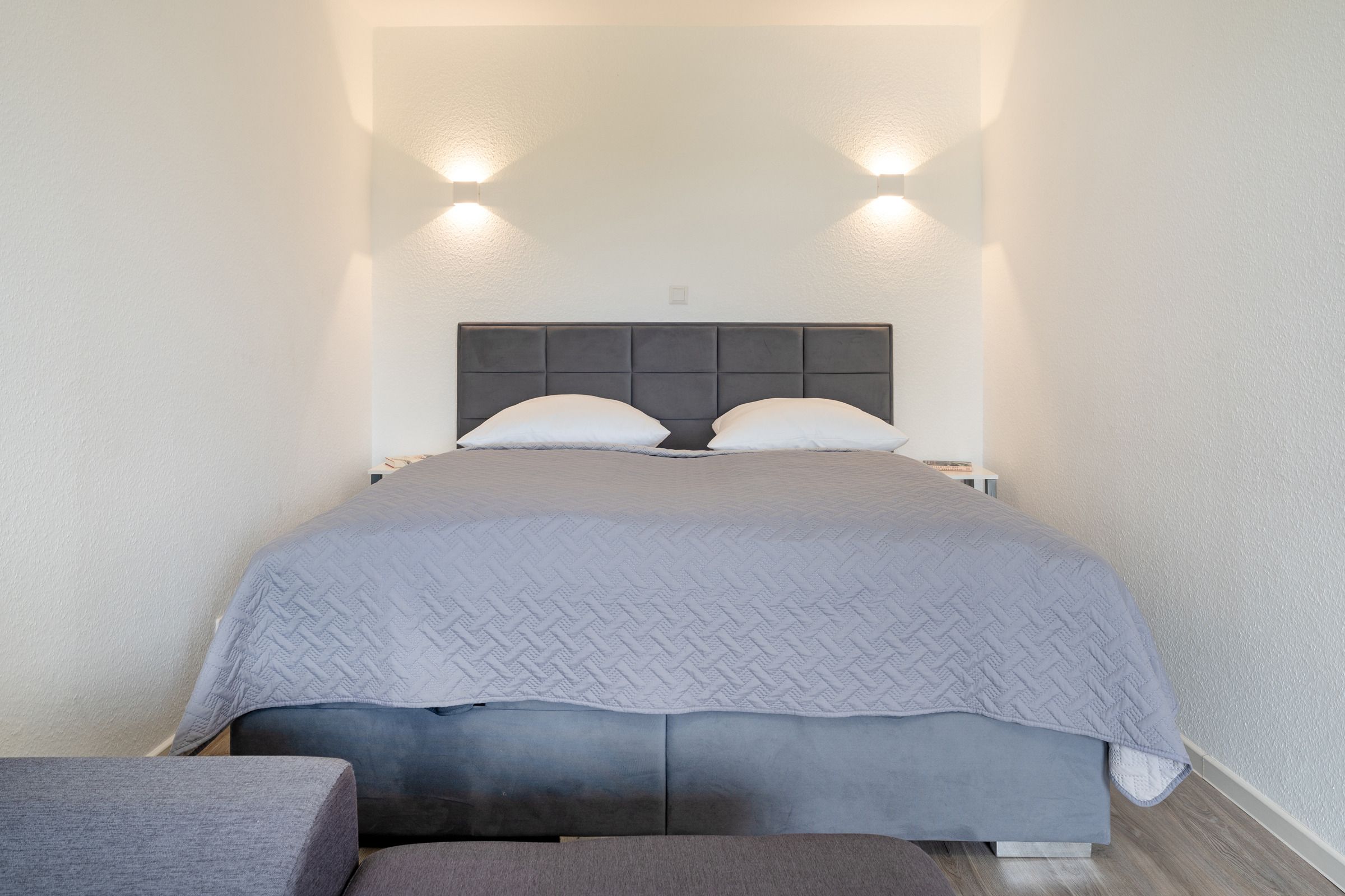 Wohn-/Schlafzimmer: 1 Boxspring-Doppelbett (2 × 90 x 200 cm, durchgehender Topper), Kleiderschrank, Verdunkelung: Plissees und Vorhänge, Platz für ein Babybett vorhanden