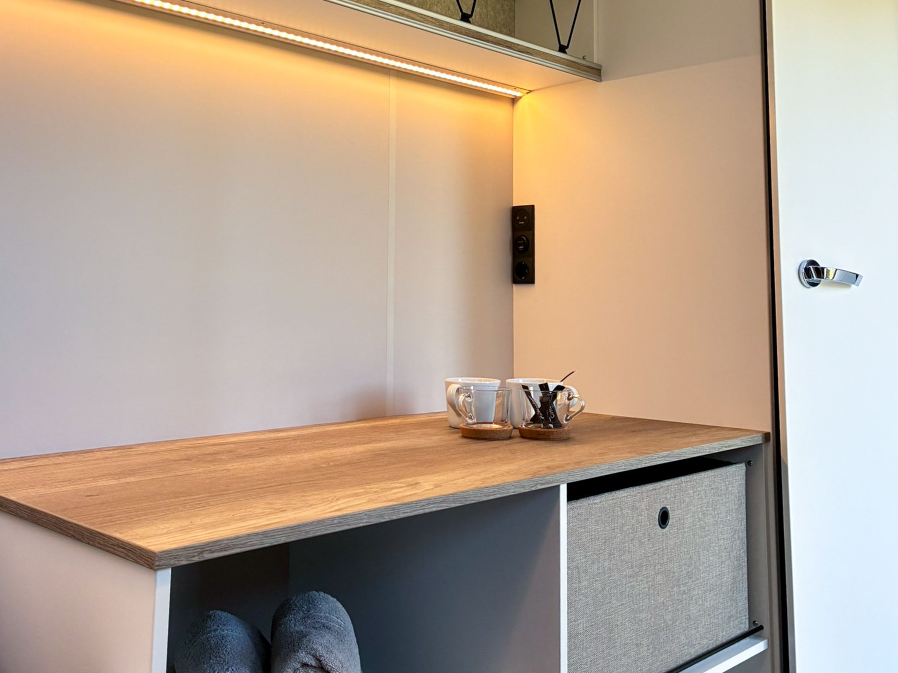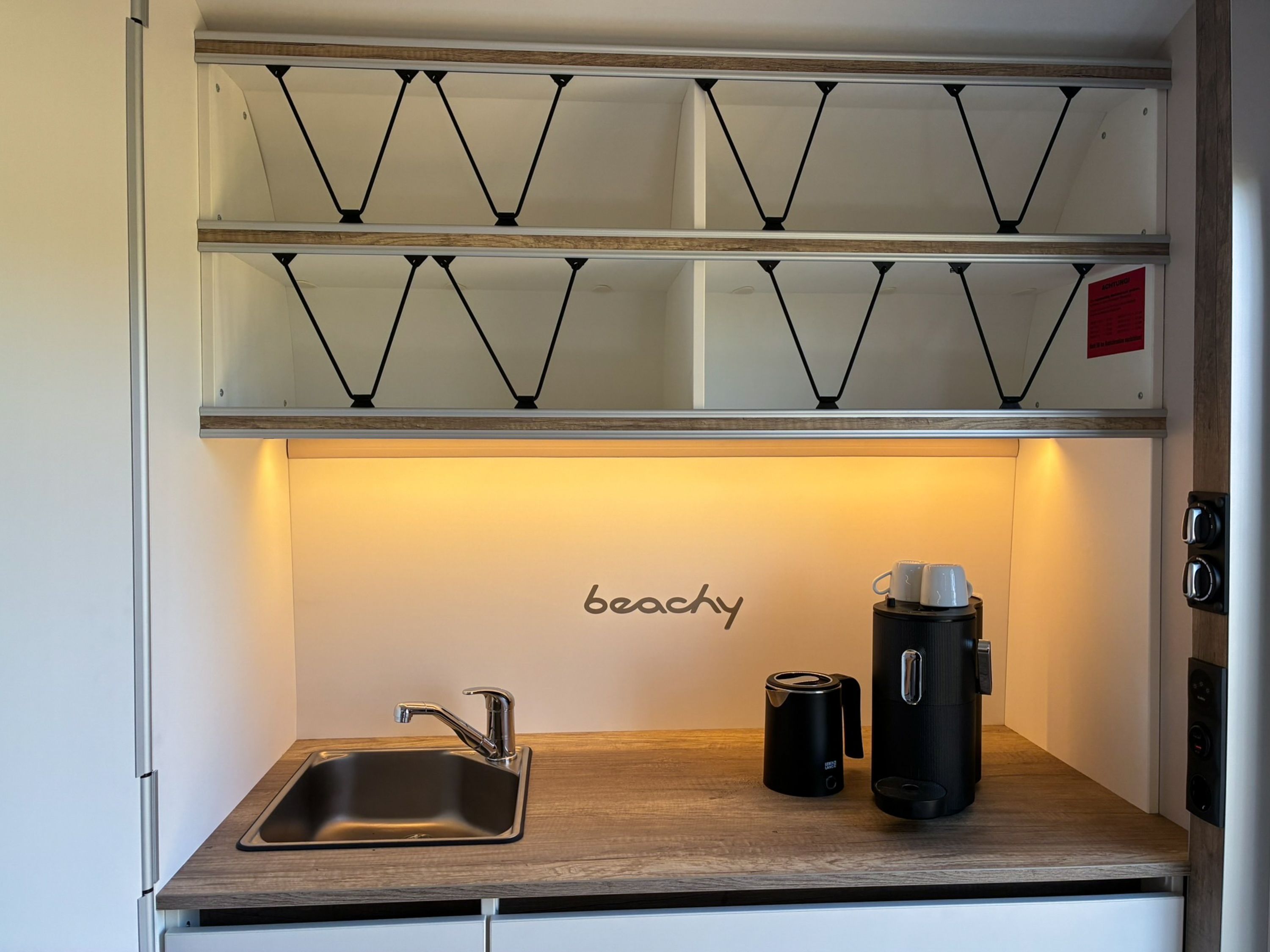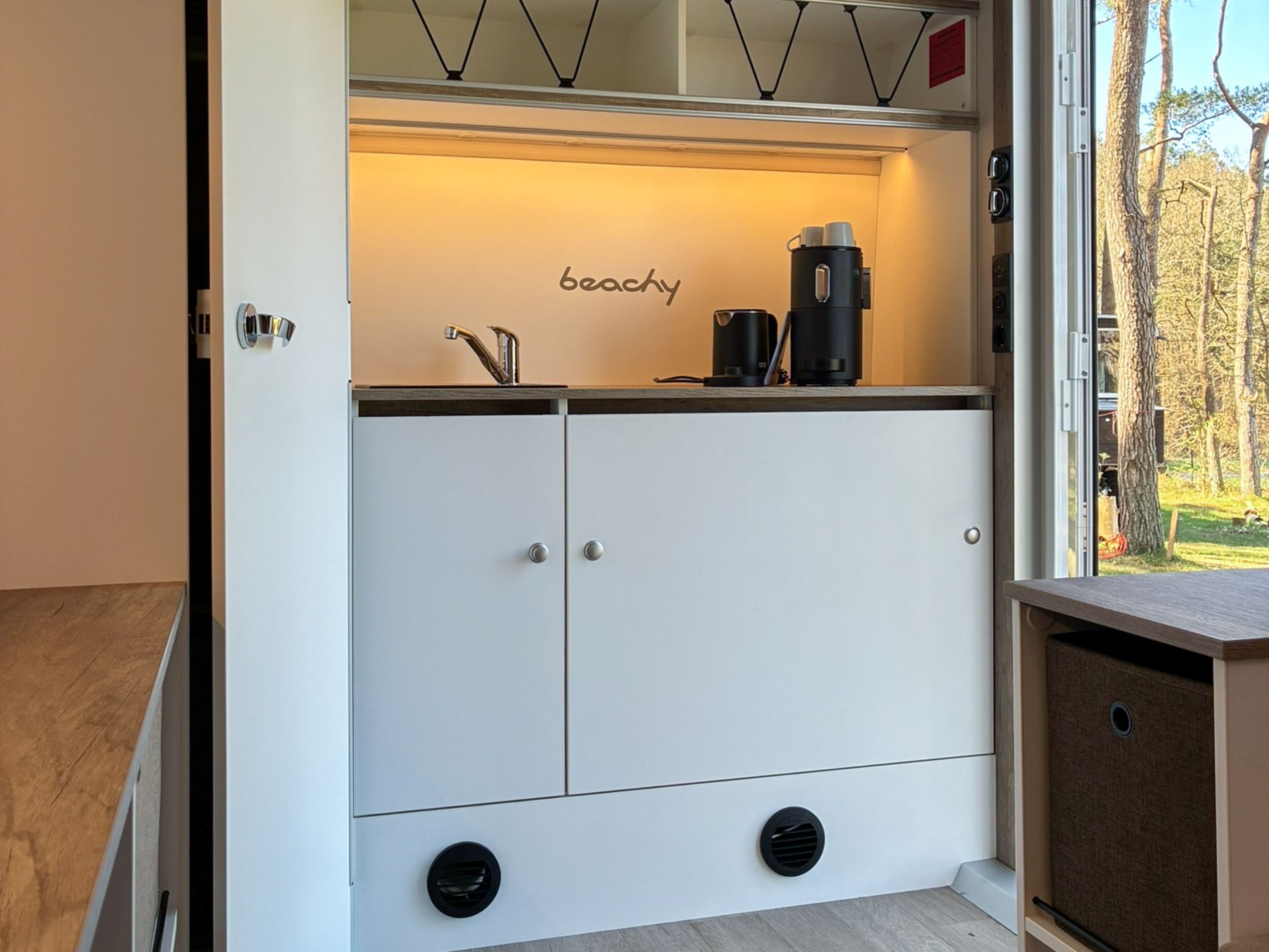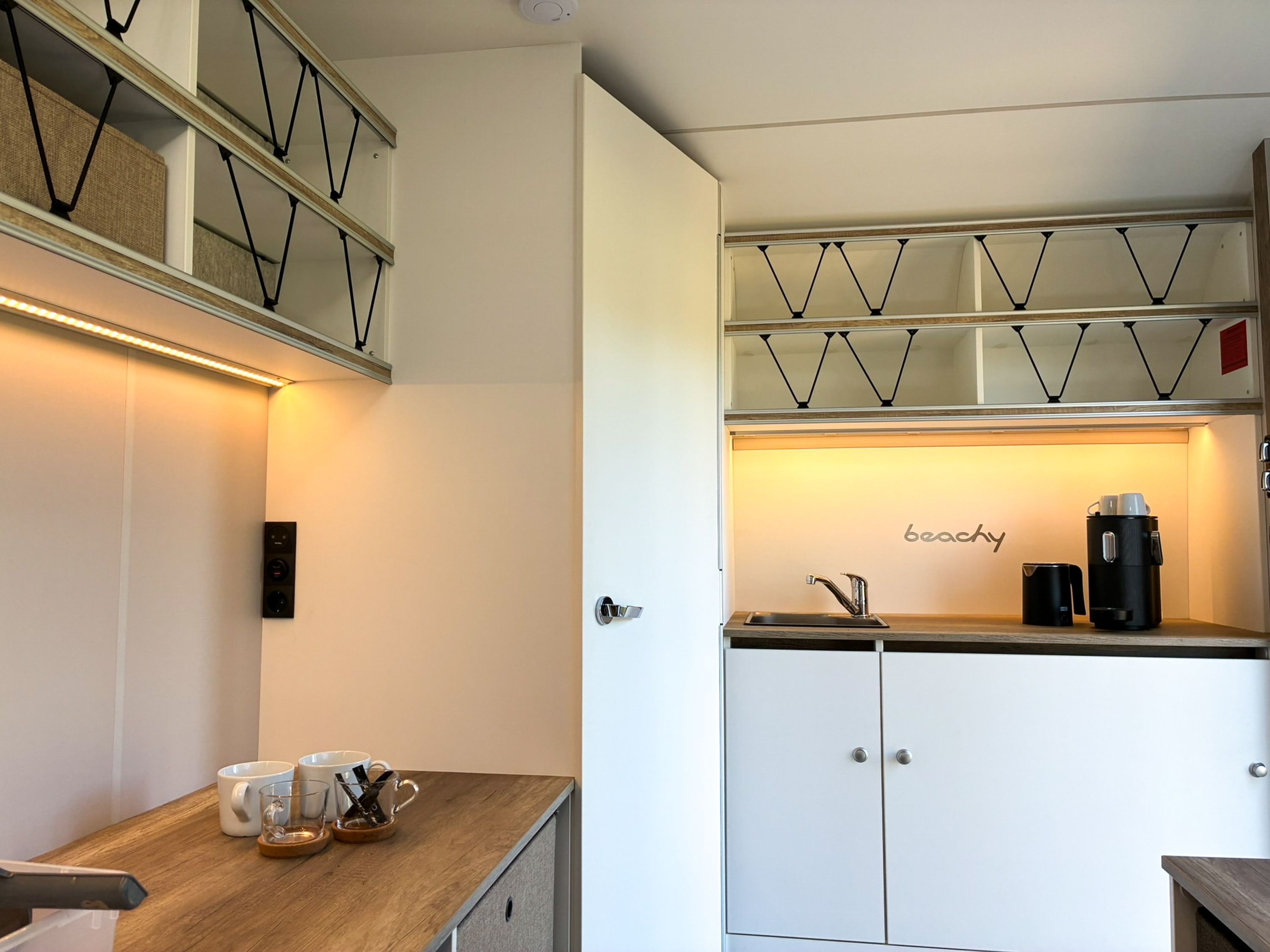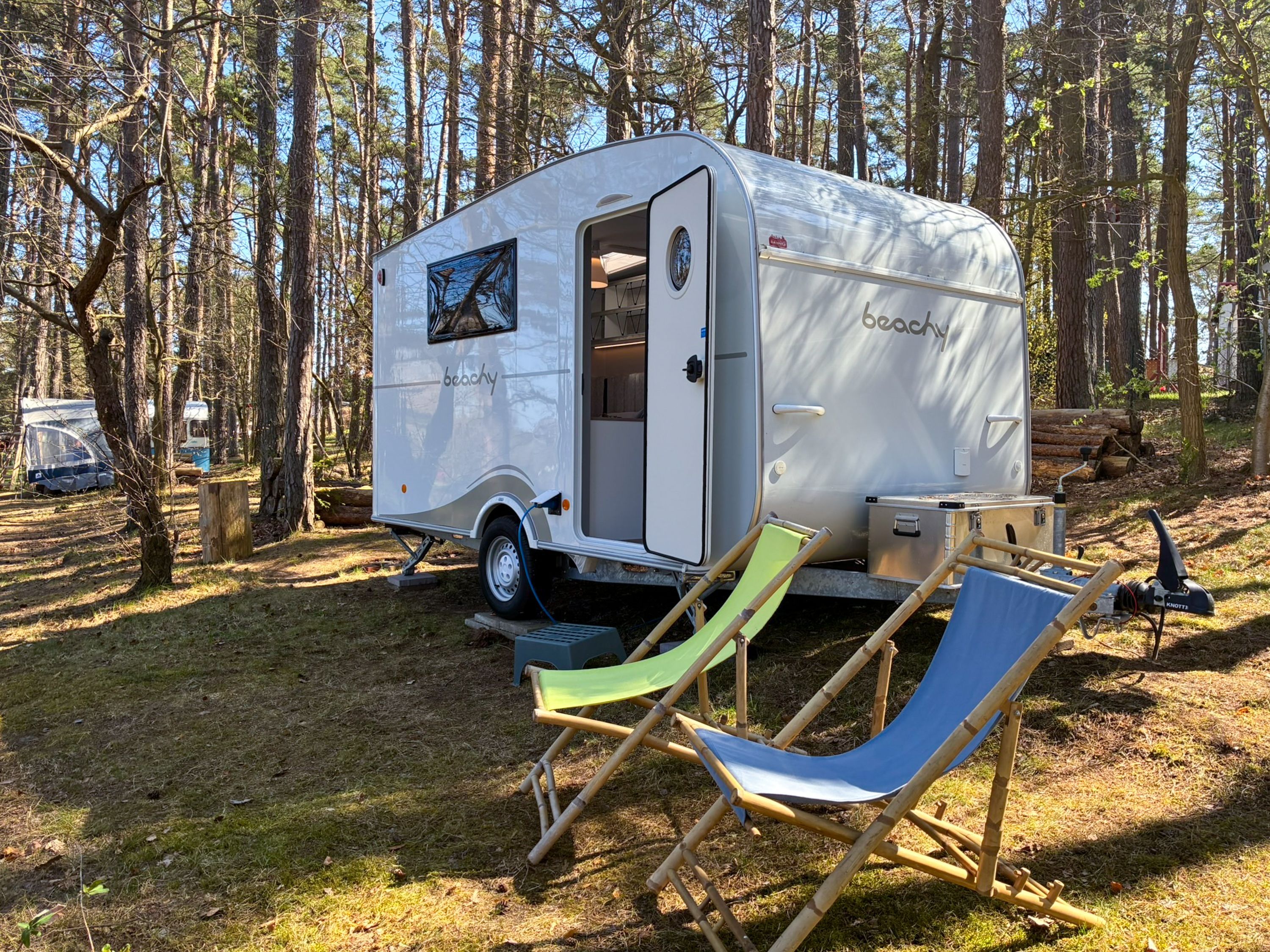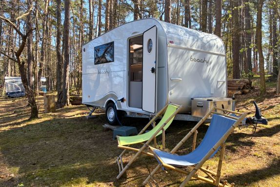 Beachy ist ein kompakter Wohnwagen auf dem Ostseecampingplatz und bietet dir auf 8,5 m² Platz für bis zu 2 Erwachsene und 1 Kind bis 14 Jahre. Du schläfst im gemütlichen Familienbett (180x200), für Komfort sorgen Strom, Licht und eine Elektroheizung. Kaffeemaschine und Wasserkocher stehen bereit, eine Kühlbox ist ebenfalls vorhanden. Draußen nutzt du gern eine Picknickbank und Liegestühle. Das Sanitärgebäude und die Kochhütte sind schnell erreichbar, zum Strand läufst du etwa fünf Minuten.