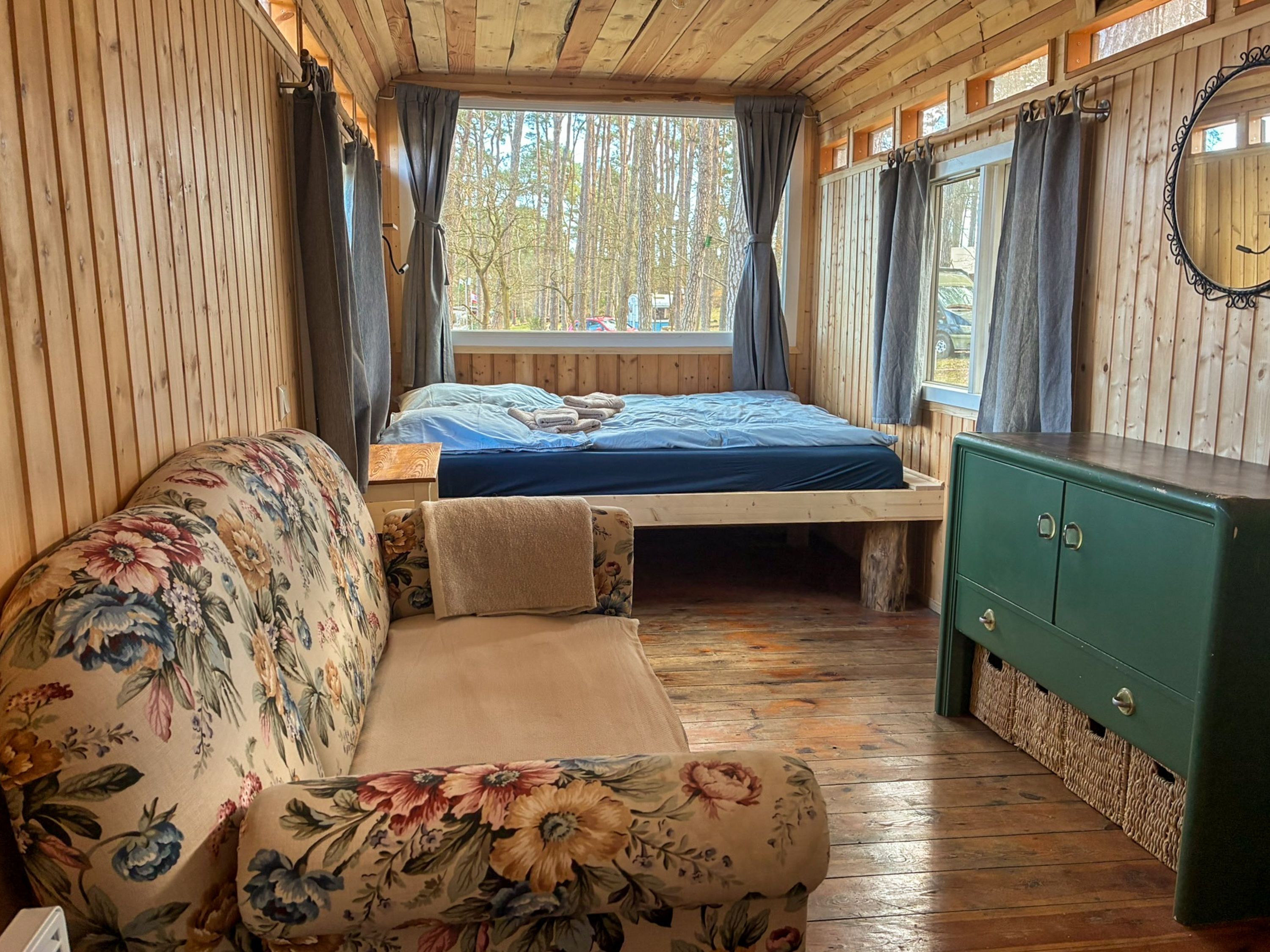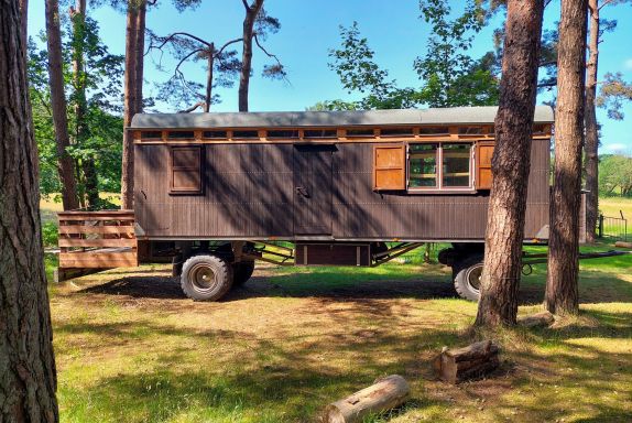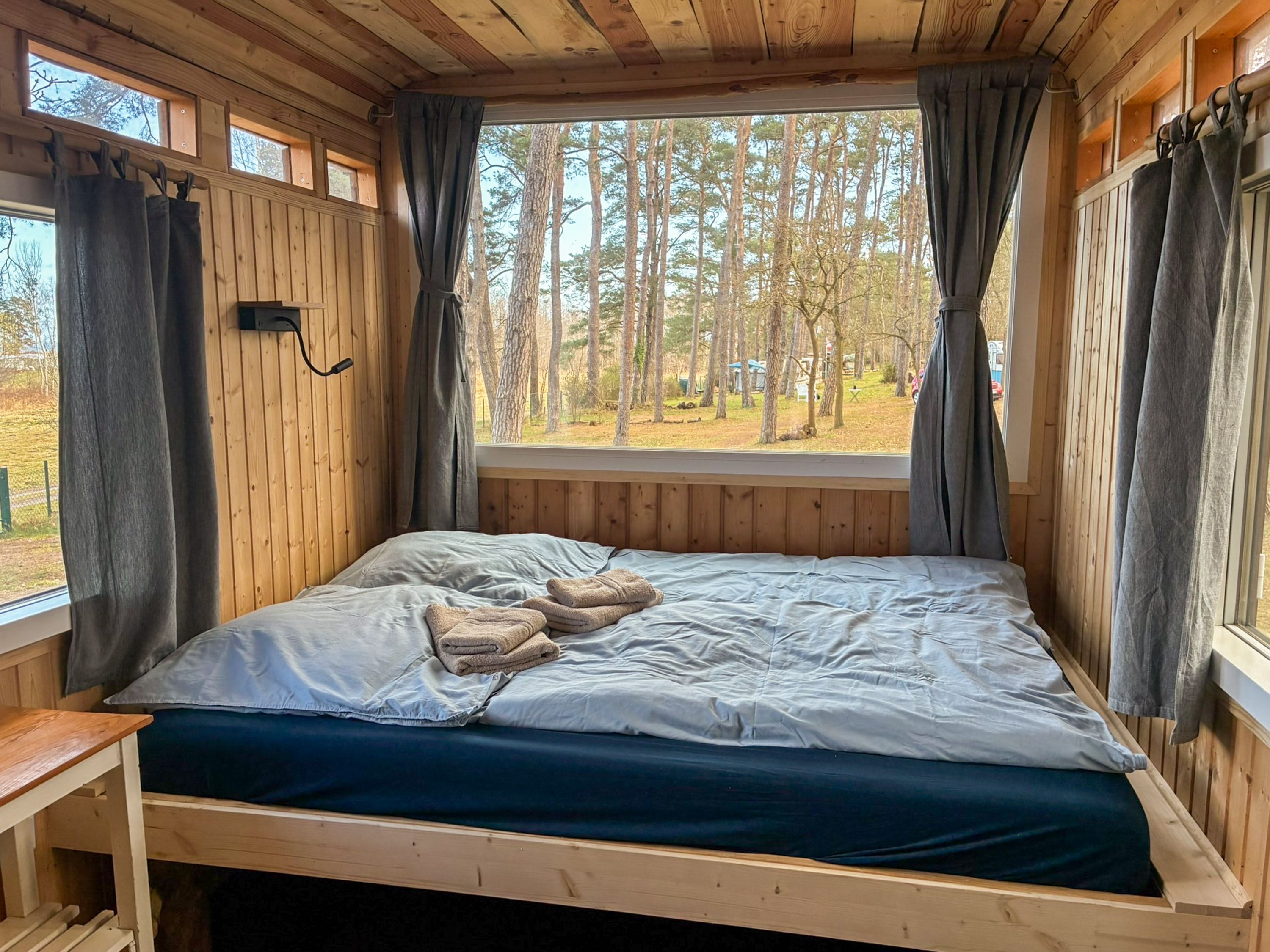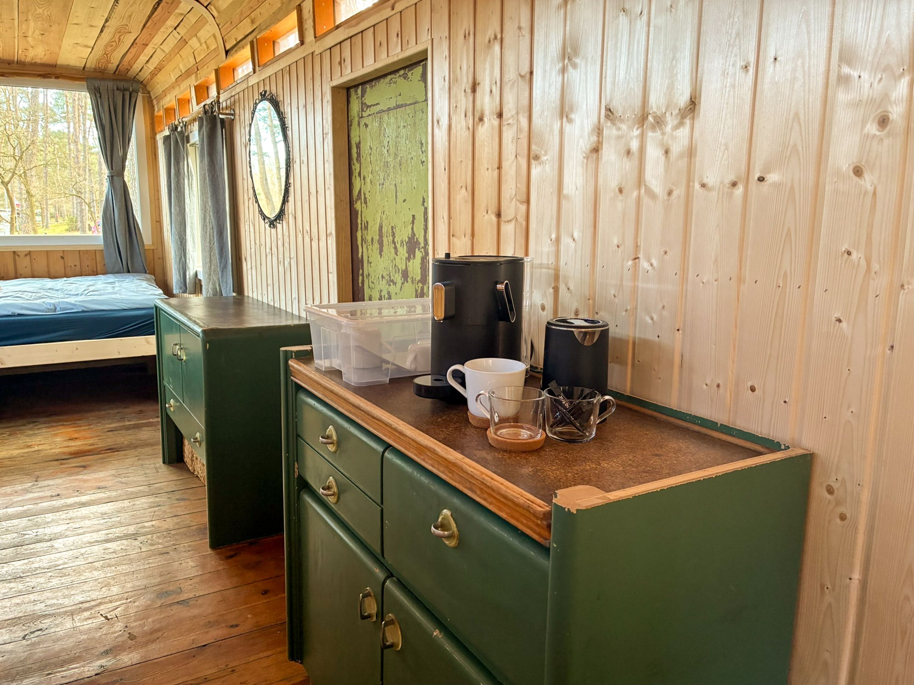 Simson ist ein liebevoll ausgebauter Schäferwagen auf dem Ostseecampingplatz und bietet dir eine gemütliche Auszeit für bis zu 2 Personen und 1 Kind bis 2 Jahre. Drinnen erwartet dich eine bequeme Bettebene (160x200) sowie Sofa, Tisch und Stühle und Stauraum für Kleidung und Kleinkram, dazu kommen Strom und Licht. Für den Start in den Tag stehen Kaffeemaschine und Wasserkocher bereit, eine kleine Elektroheizung sorgt bei kühleren Temperaturen schnell für Wohlfühlwärme. Draußen laden Picknickbank und Liegestühle zum Entspannen ein, der nächste Baum für eine Hängematte ist nicht weit. Die Sanitärgebäude und die Kochhütte erreichst du in wenigen Schritten, bis zum Strand läufst du etwa fünf Minuten.