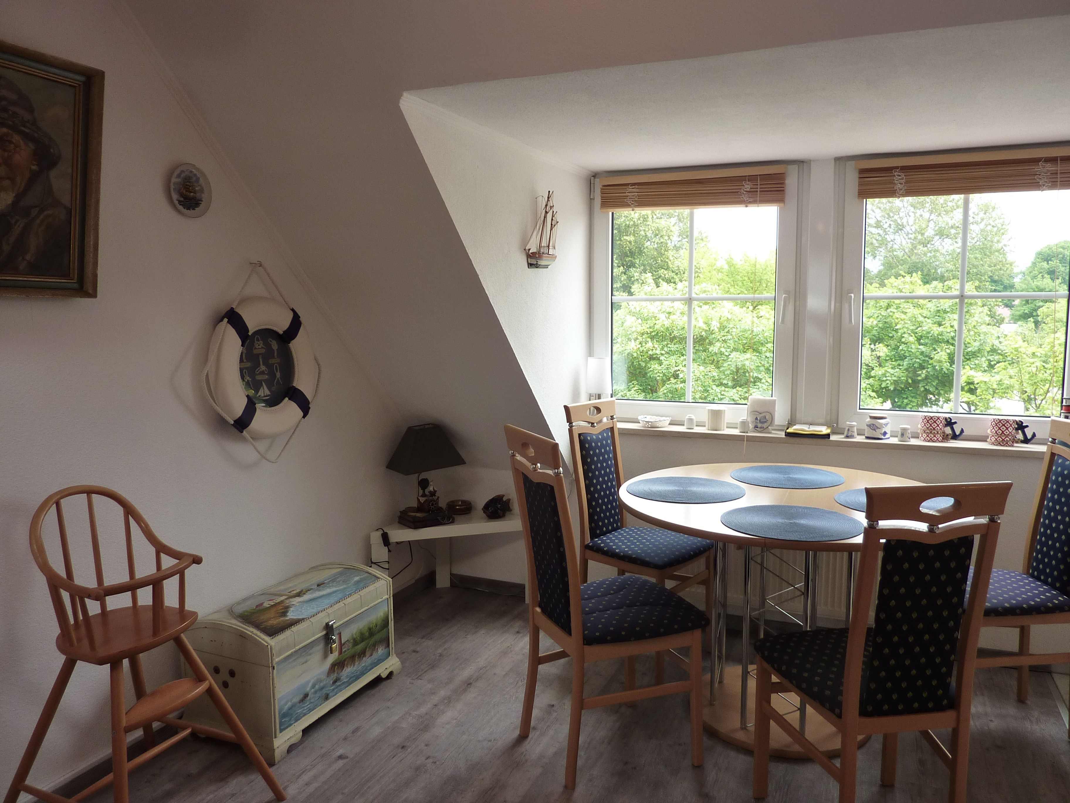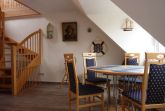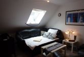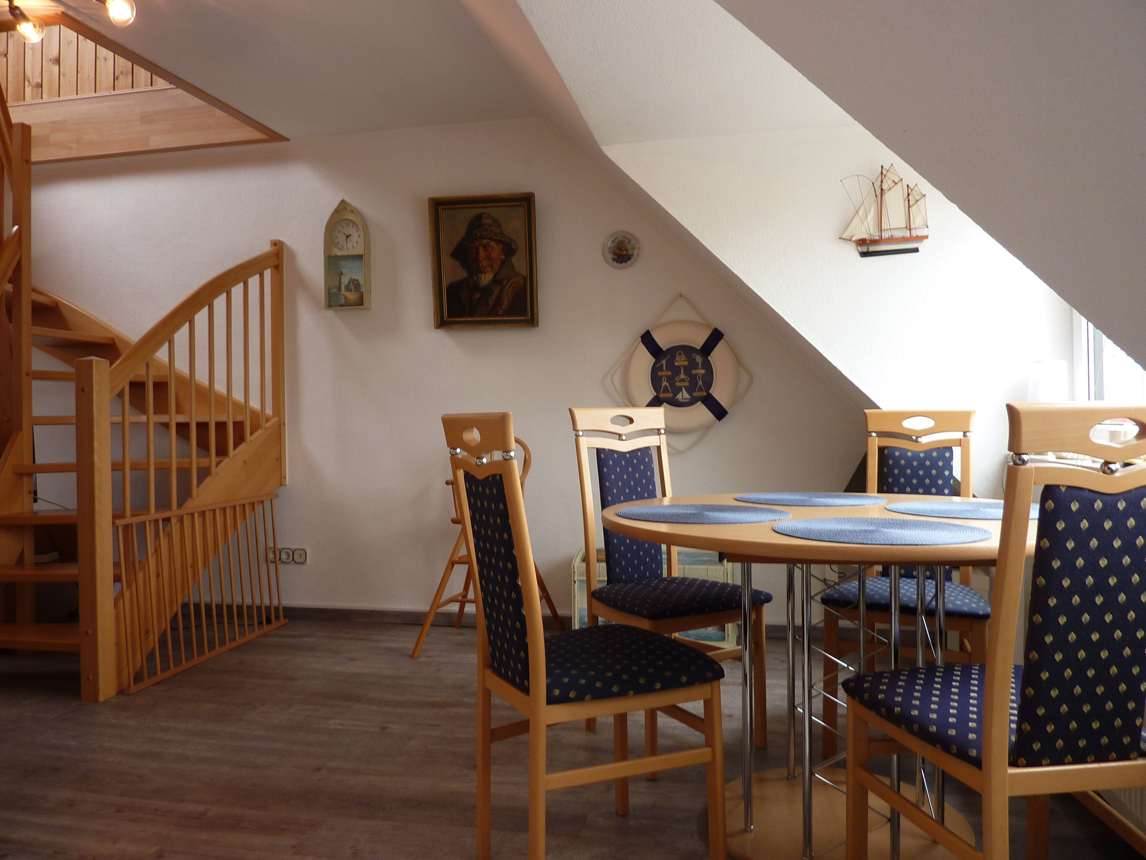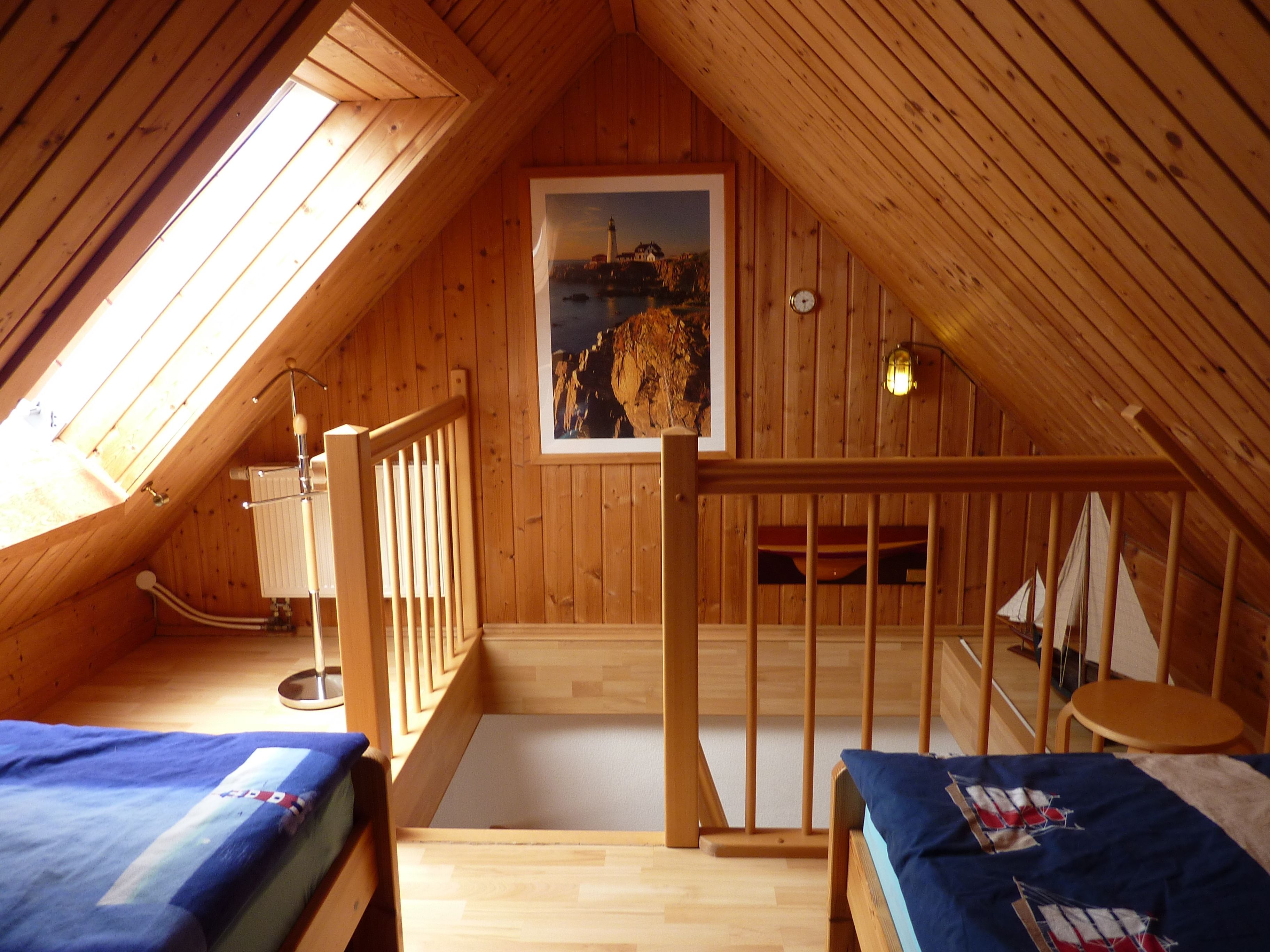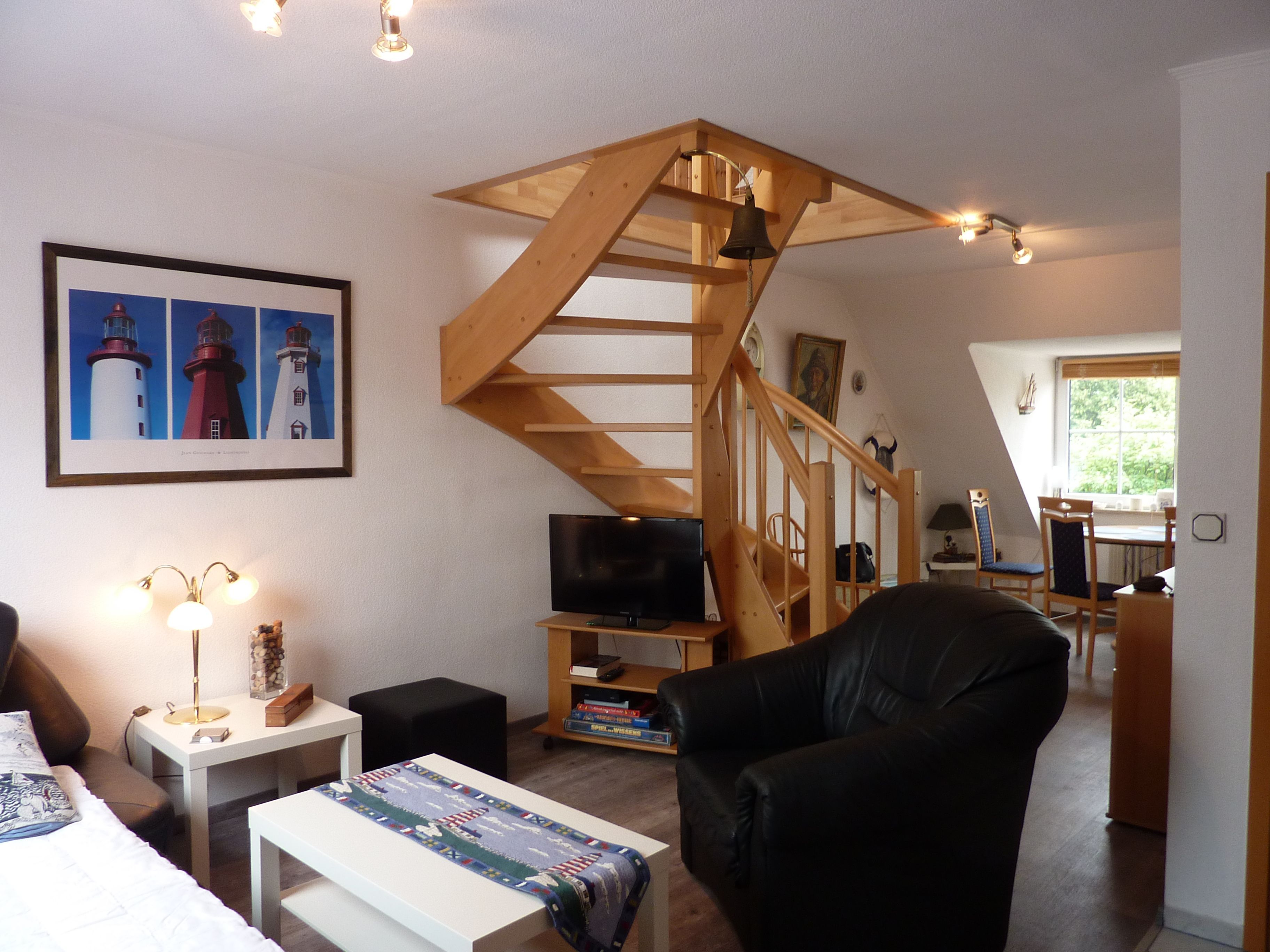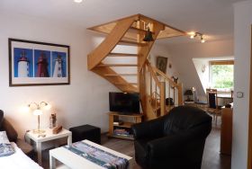 Die Ferienwohnung verfügt über eine Schlafgalerie mit 2 Betten im DG, offen zum Wohnraum, das Sofa im Wohnbereich ist als Schlafcouch jederzeit nutzbar. Des Weiteren finden Sie eine komplett ausgestattete Küchenzeile integriert im Wohnraum, einen Eßplatz für 4 Personen und ein Kinderbett und einen Hochstuhl. Ihr Auto parken Sie bequem auf dem Stellplatz des Grundstückes.