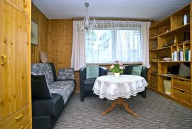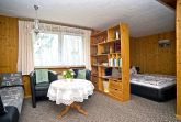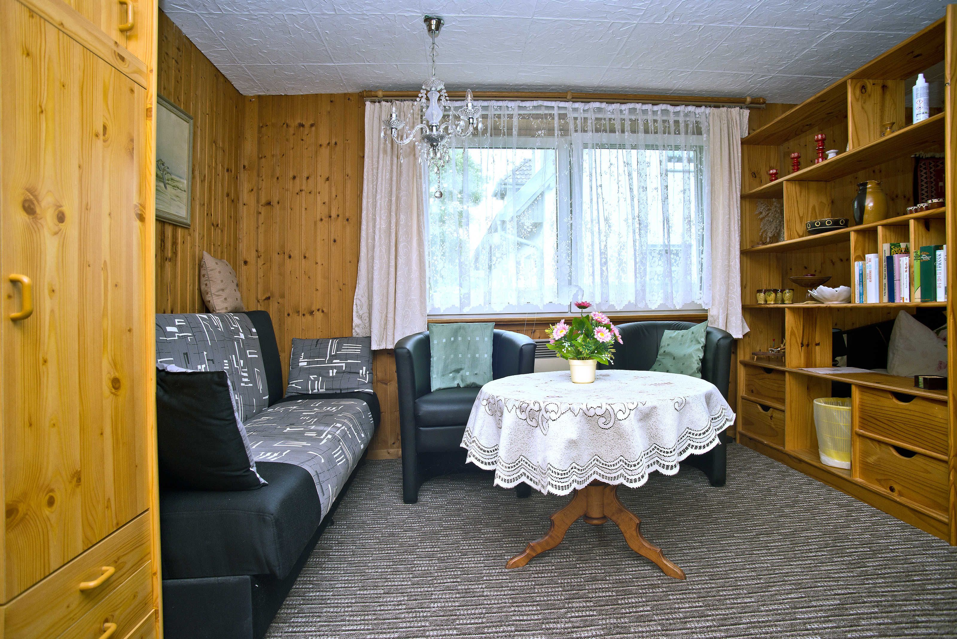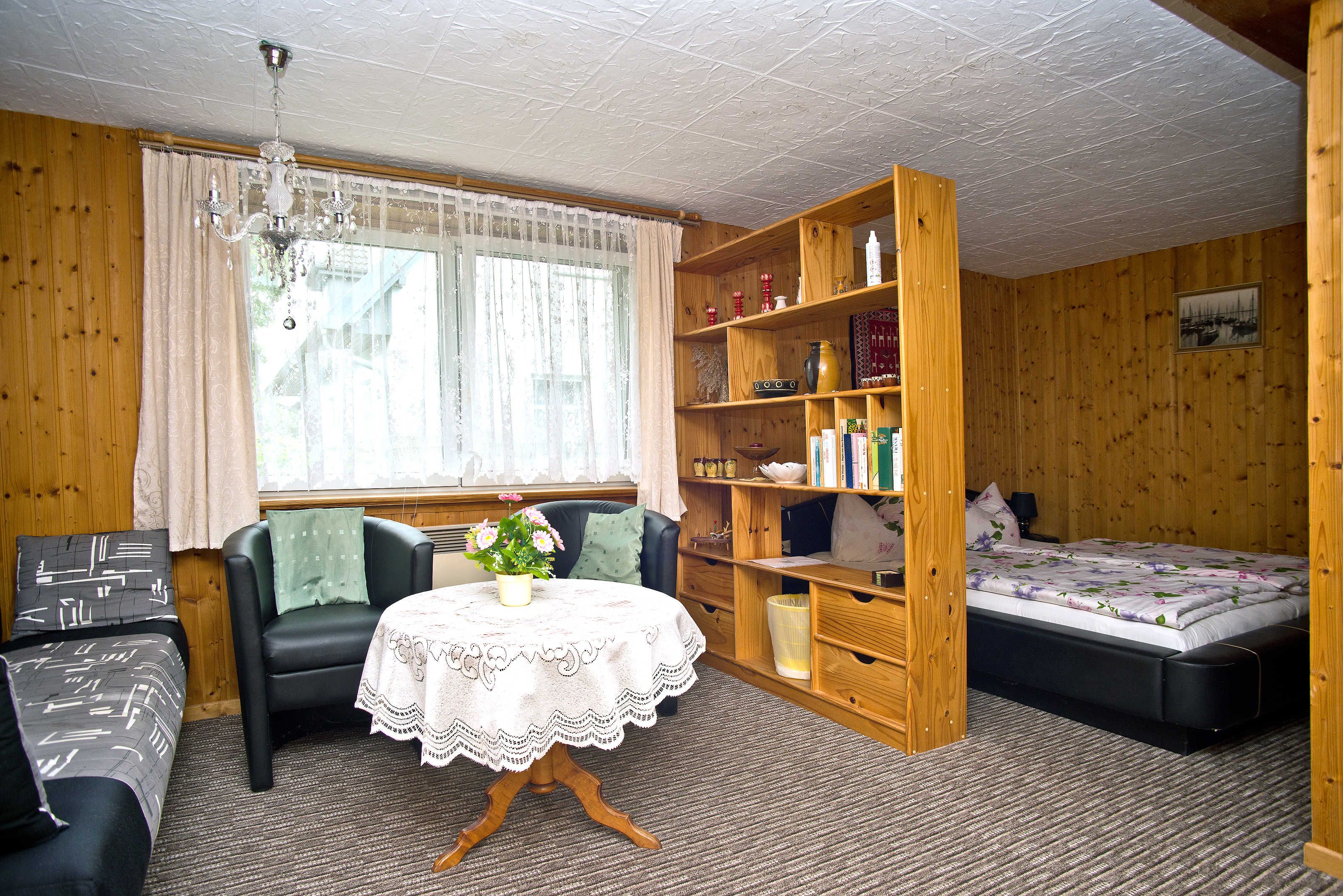 Diese gemütliche, separate Ferienwohnung für zwei Personen befindet sich in der unteren Etage des Ferienhauses und besticht durch ihre behagliche Holzvertäfelung. Der Wohn- und Schlafbereich ist mit einem Raumteiler gestaltet und sorgt so für Gemütlichkeit und Privatsphäre. Eine kleine, liebevoll eingerichtete Kochgelegenheit bietet alles, was Sie für die Zubereitung kleiner Mahlzeiten benötigen. Das Badezimmer ist mit Dusche und WC ausgestattet.
