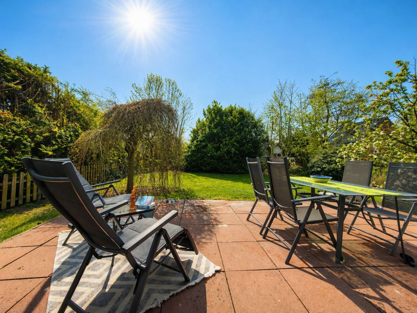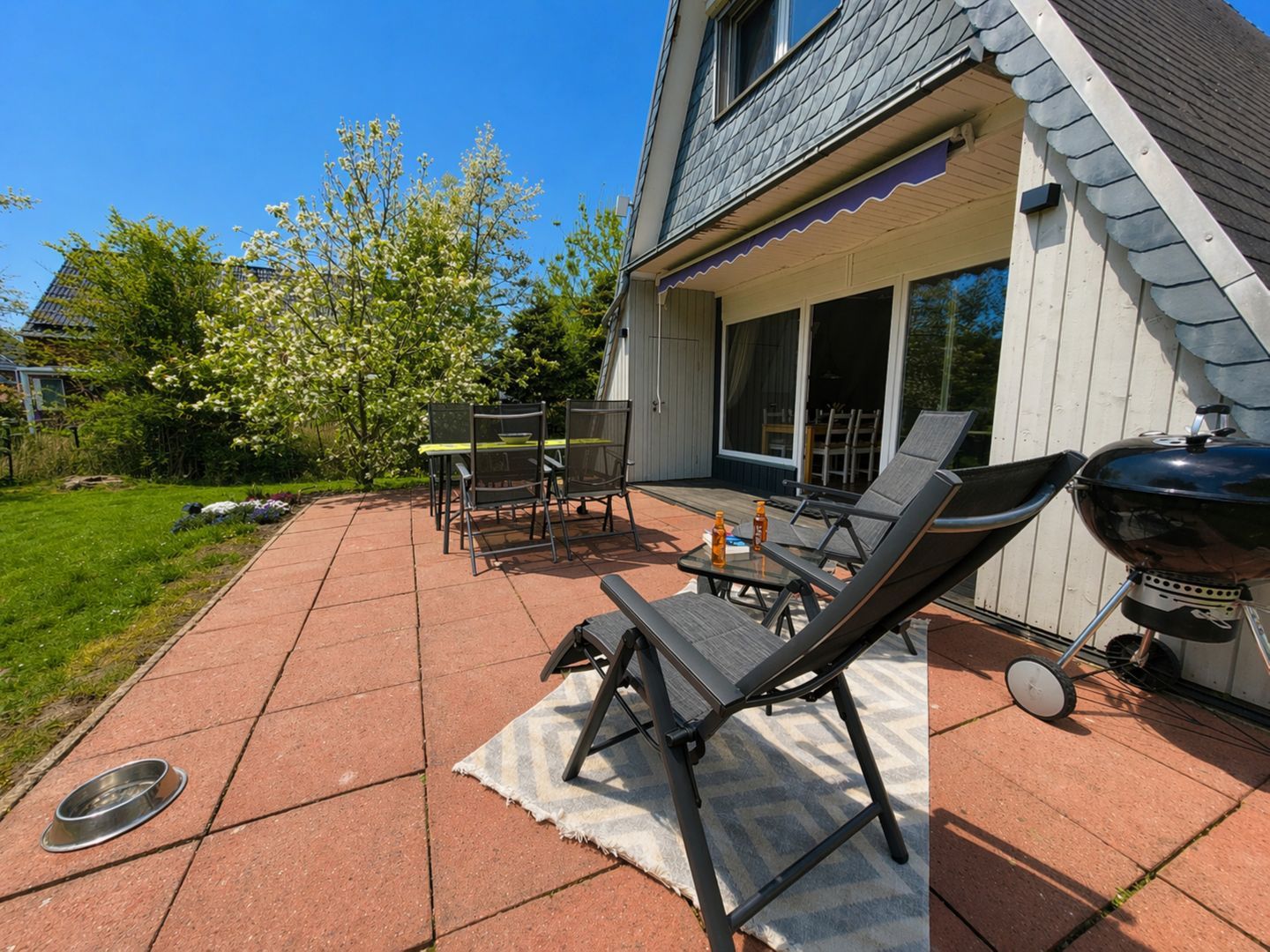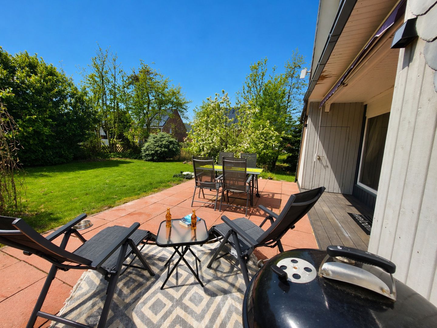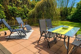 Im Außenbereich erwartet Sie ein gepflegter Garten mit möblierter Terrasse, Markise, Strandkorb und Liegewiese.
