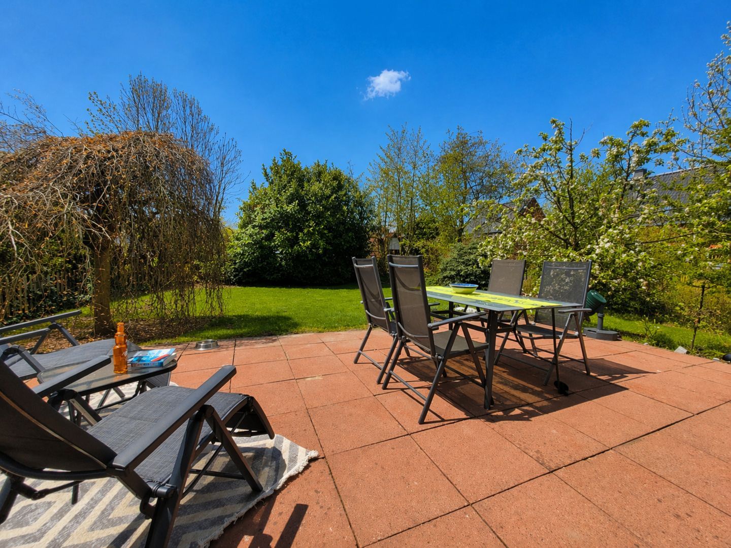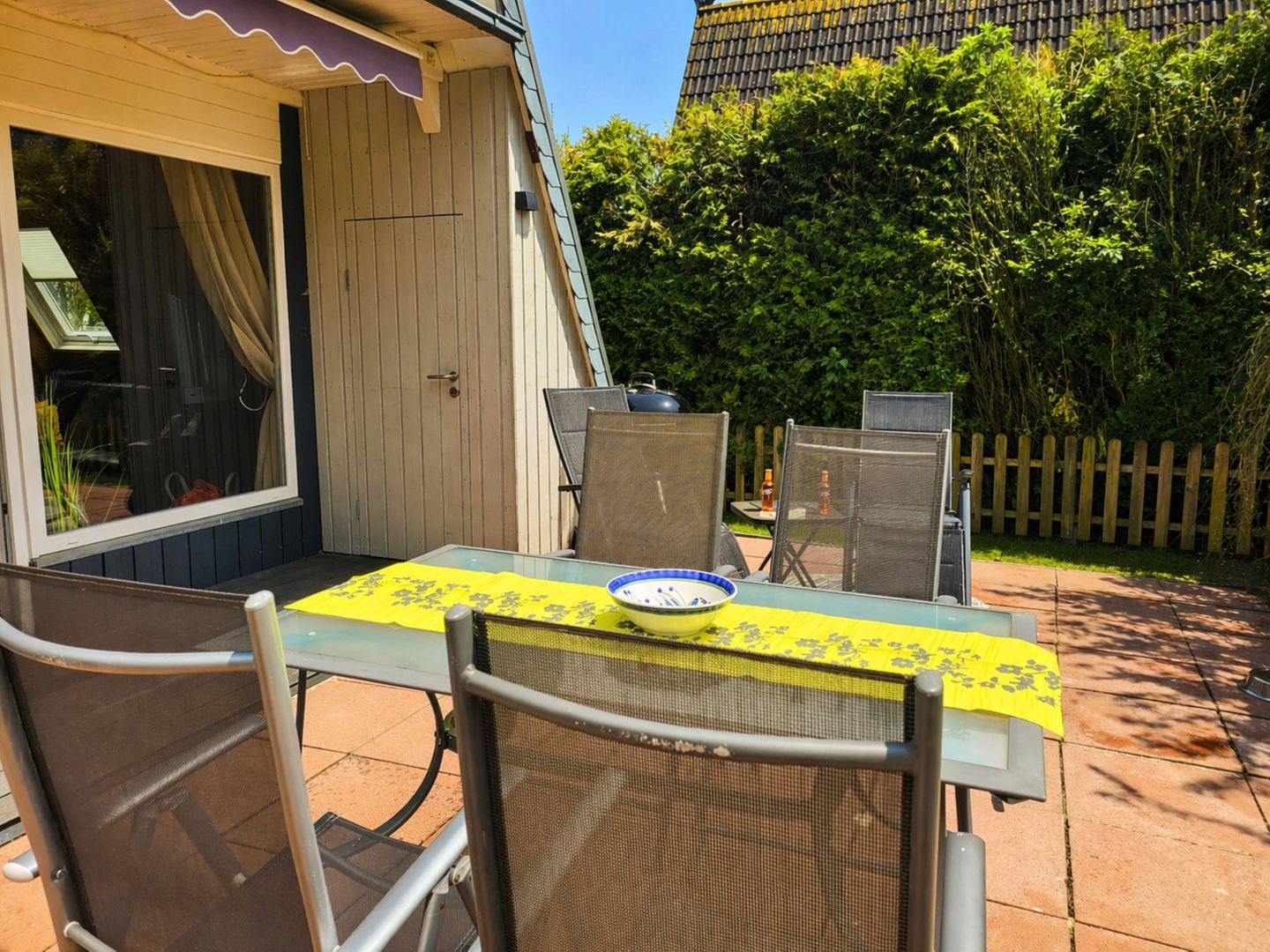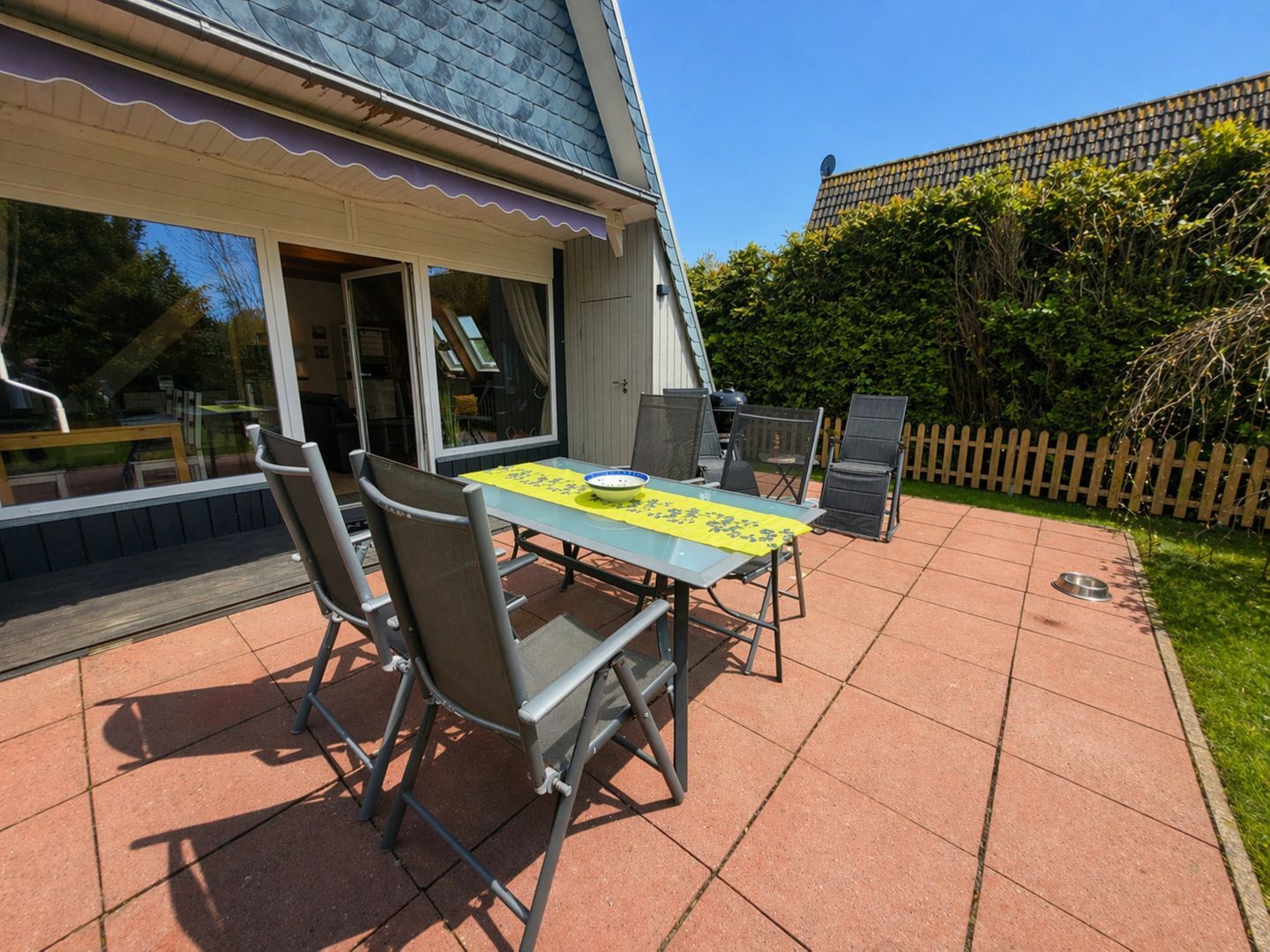 Im Außenbereich erwartet Sie ein gepflegter Garten mit möblierter Terrasse, Markise, Strandkorb und Liegewiese.