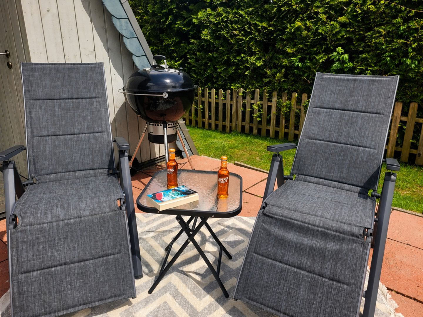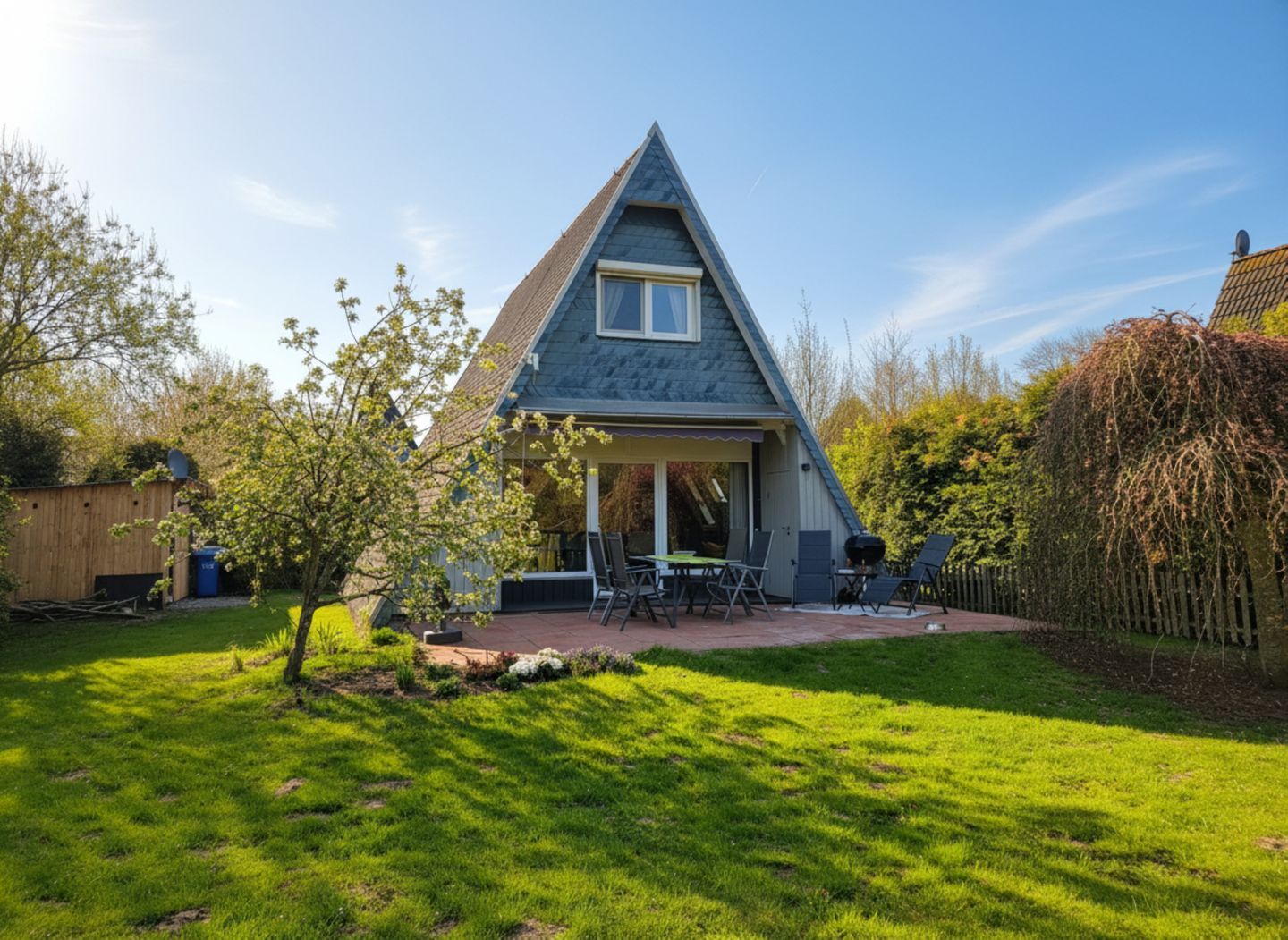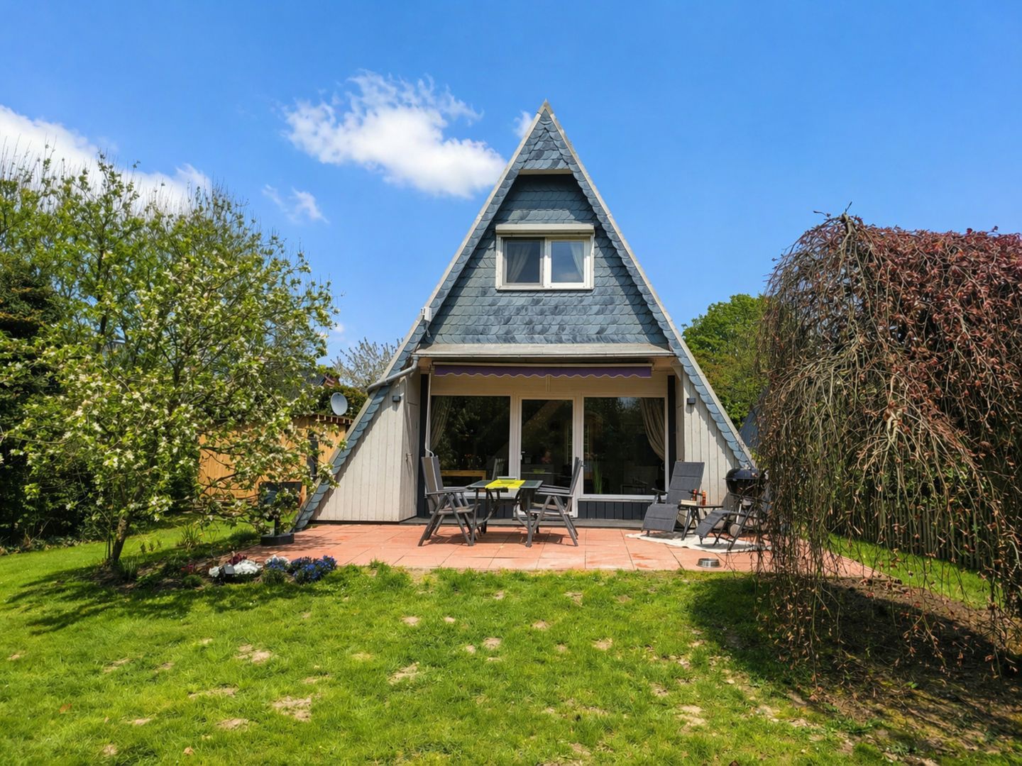 Ein Kohlegrill, Gartenhaus und Gartenmöbel stehen zur Verfügung – ideal für erholsame Stunden im Freien.