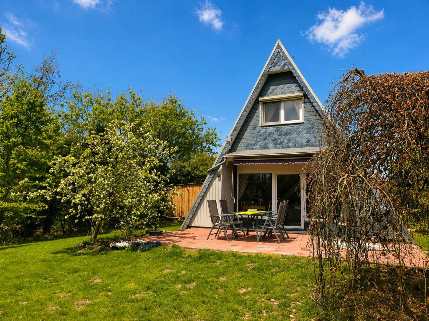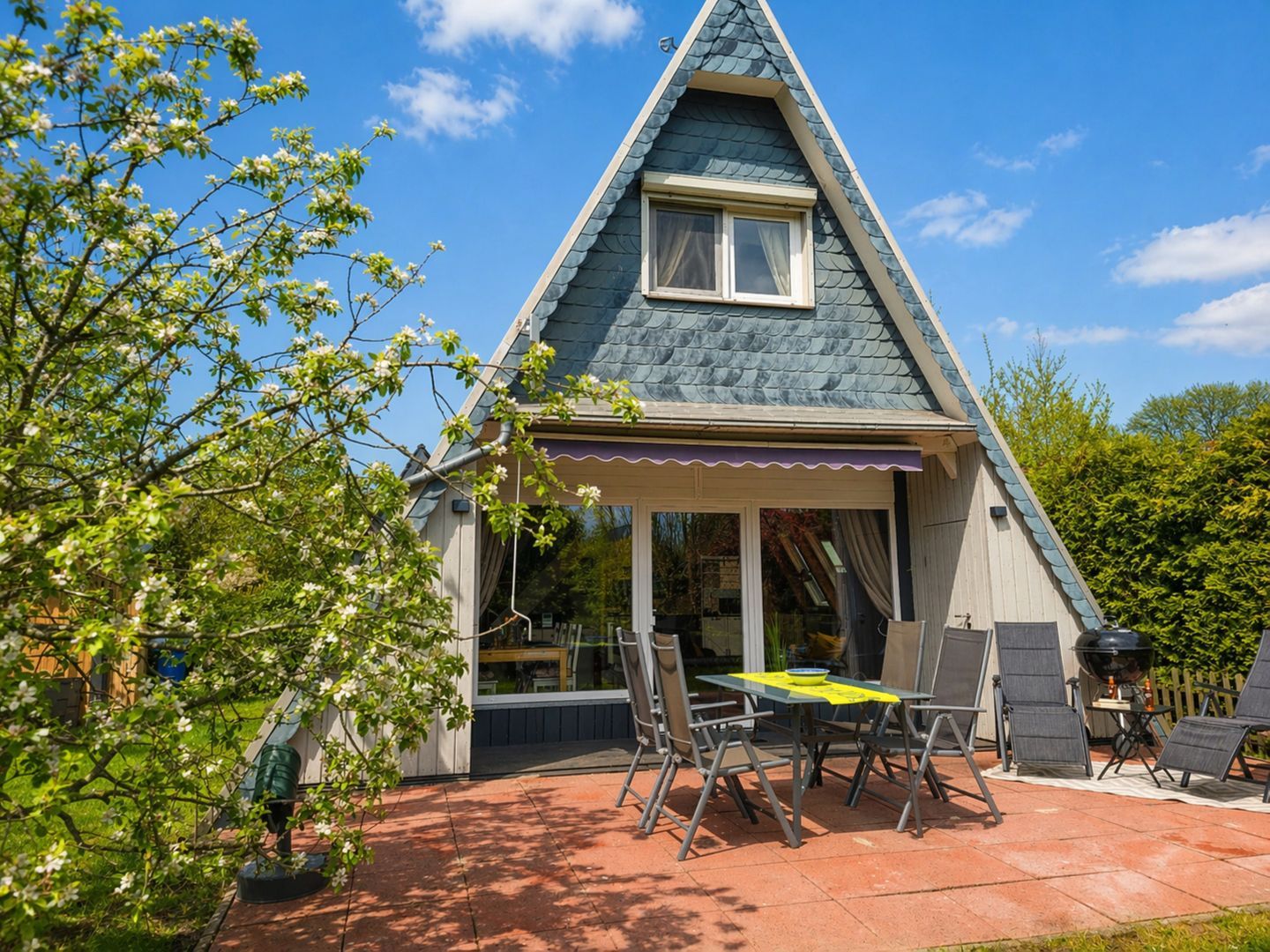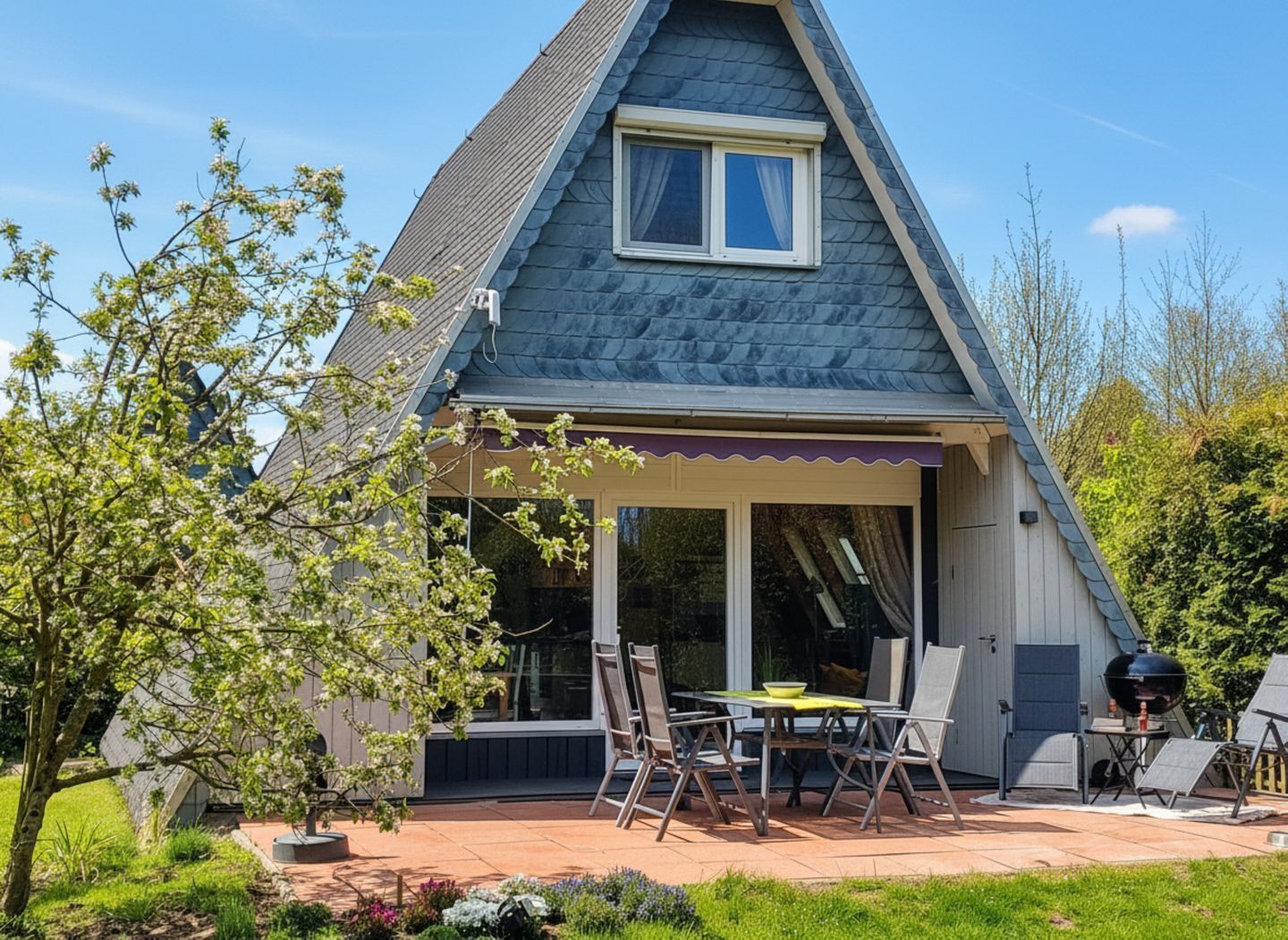 Ein Kohlegrill, Gartenhaus und Gartenmöbel stehen zur Verfügung – ideal für erholsame Stunden im Freien.