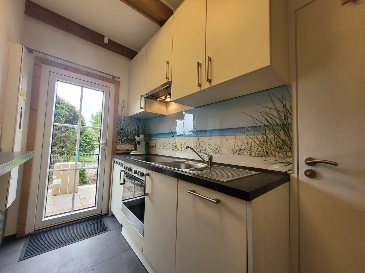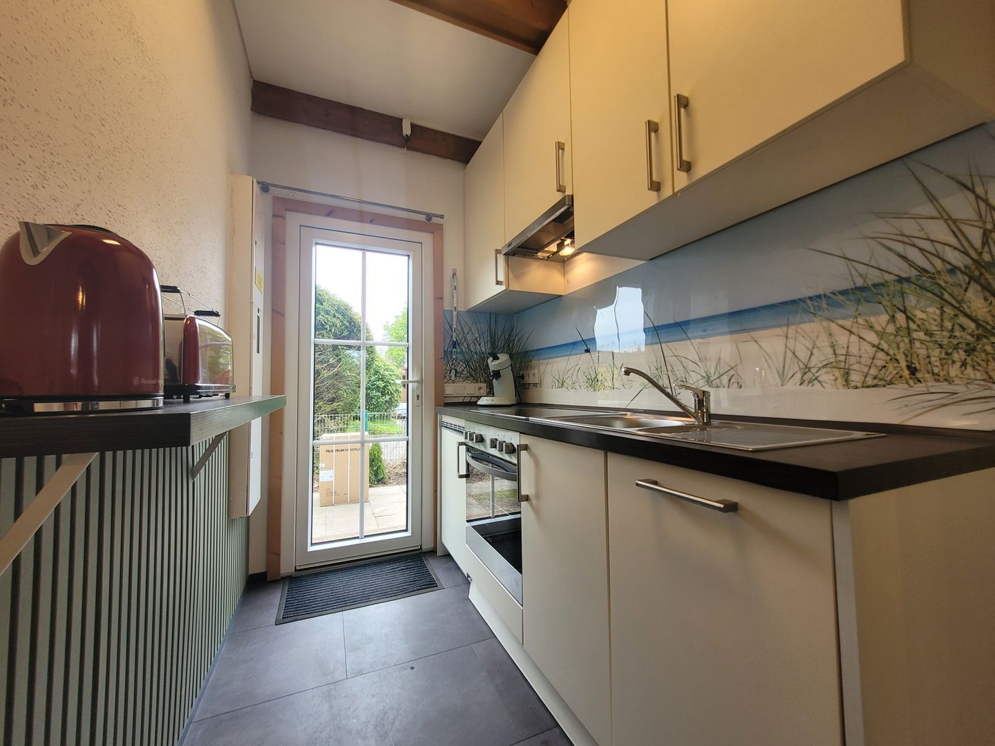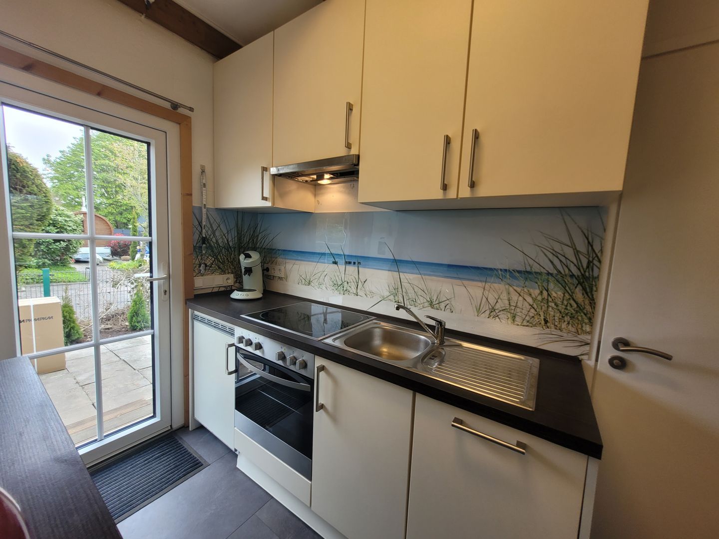 Die offene Küche grenzt direkt an den Wohn- und Essbereich und verfügt über alles, was für eine stressfreie Selbstversorgung nötig ist: Cerankochfeld, Backofen, Mikrowelle, Geschirrspüler, Kühlschrank mit Gefrierfach, Kaffeemaschine, Senseo-Espressomaschine, Wasserkocher, Toaster, Mixer sowie umfangreiches Koch- und Essgeschirr. Gewürze sind ebenfalls vorhanden. Ein Esstisch und bequeme Stühle bieten Platz für gesellige Mahlzeiten.