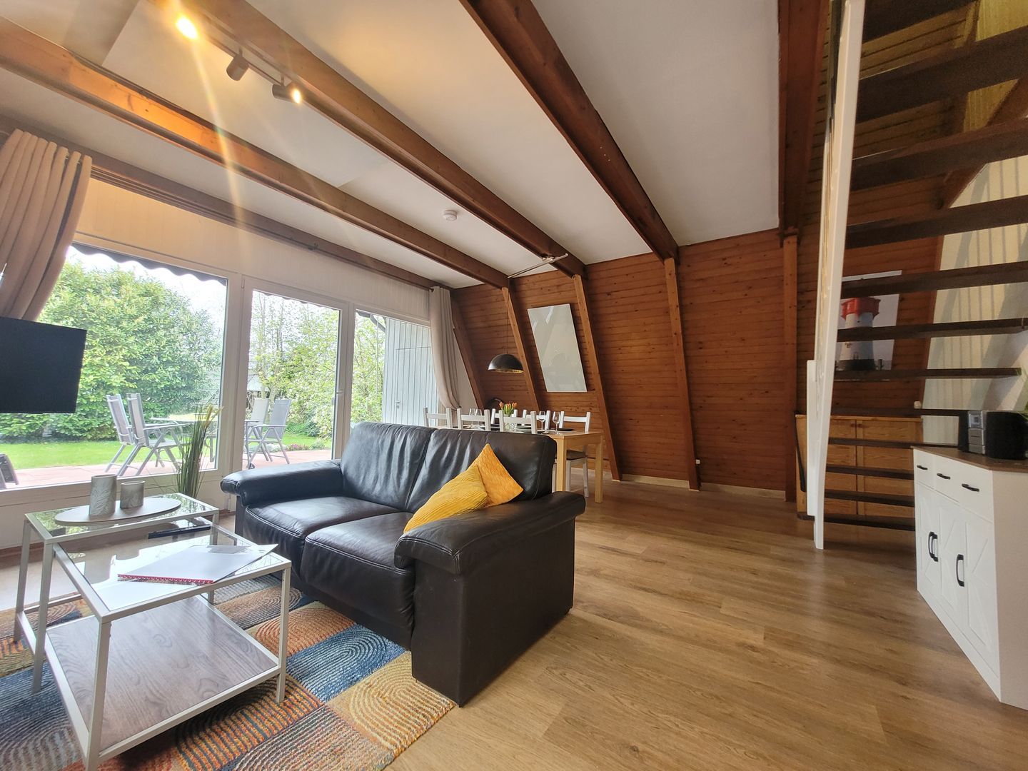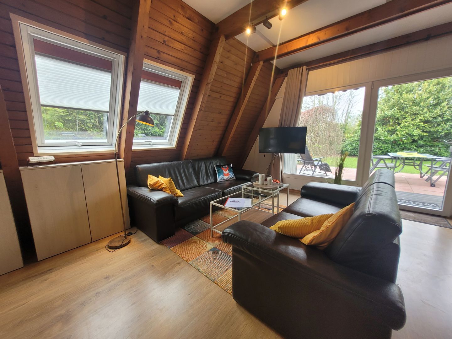 Der lichtdurchflutete Wohnbereich ist mit Laminatboden, gemütlichem Sofa, Sesseln sowie moderner Technik wie einem Satelliten-Smart-TV, digitalem Anschluss und schnellem WLAN (ab 100 Mbit/s) ausgestattet.