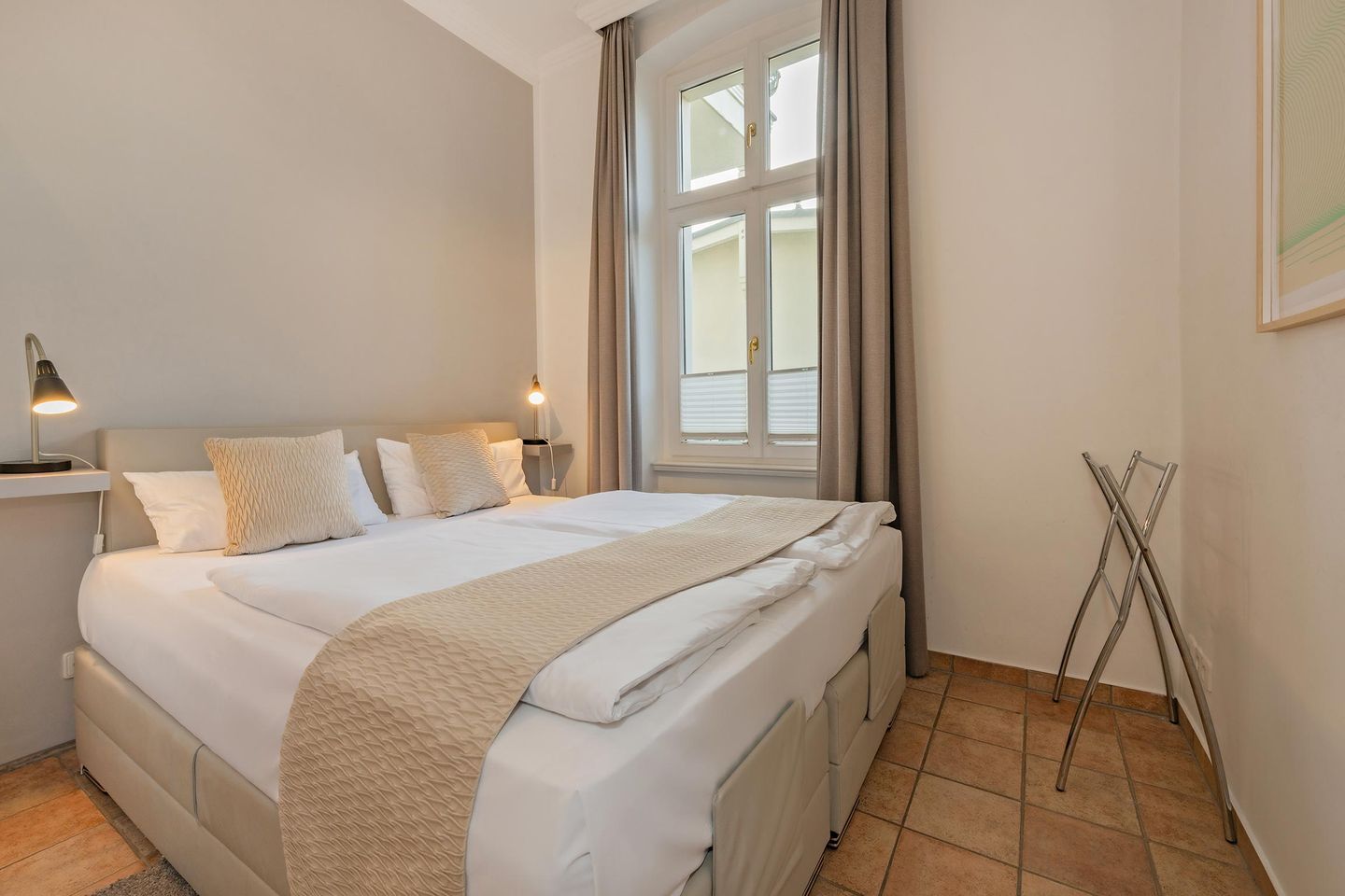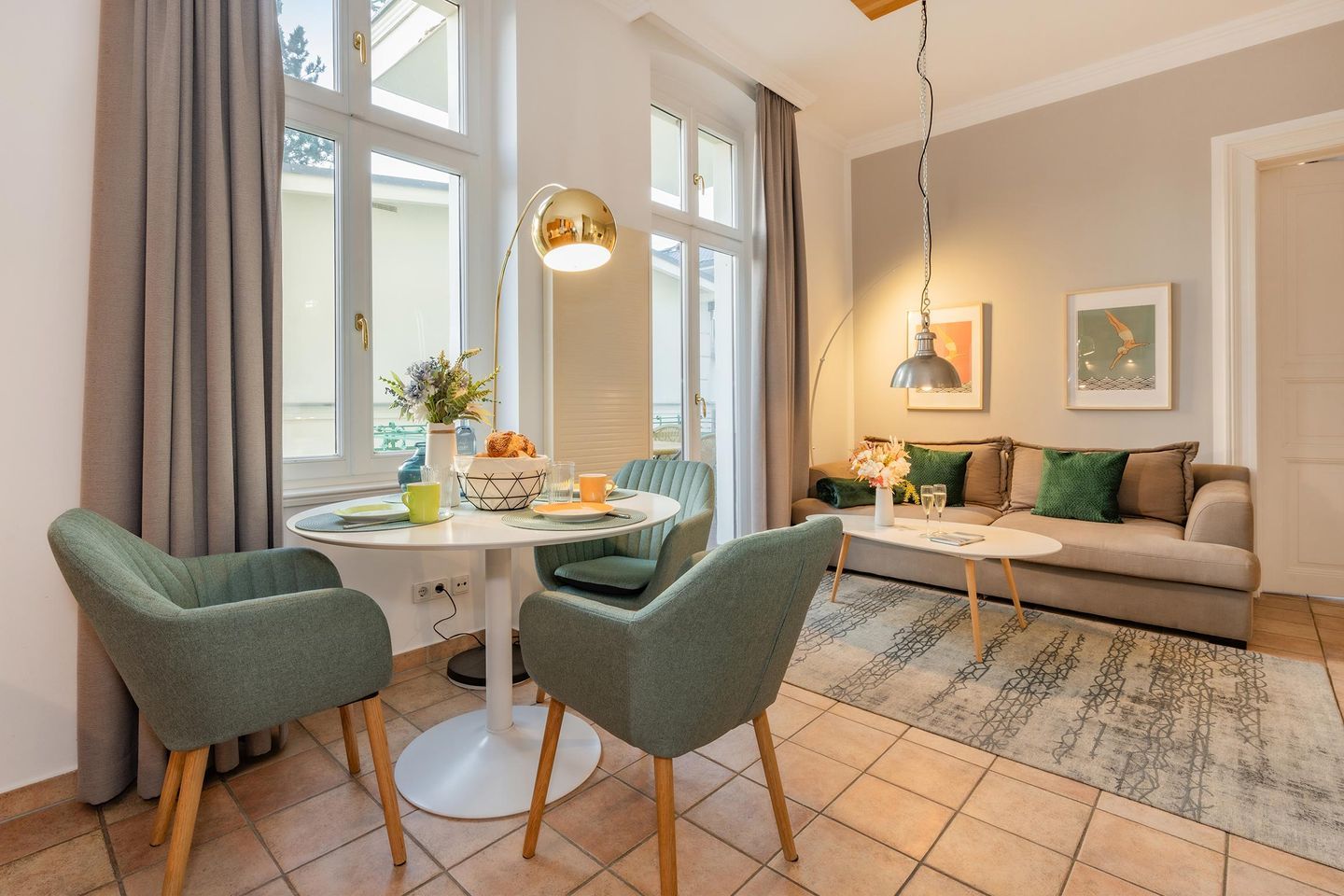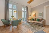 Diese Ferienwohnung ist ein Schmuckstück, direkt an der Promenade in Heringsdorf. Mit einer hochwertigen Ausstattung, liebevollen Details und einem interessanten Zuschnitt genügt sie höchsten Ansprüchen. An das gemütliche und dennoch stylische Wohnzimmer mit offener Küche und kleinem Balkon schließt sich ein Schlafzimmer mit Zugang zum Bad an. Eine ebenerdige Dusche ist vorhanden, ebenso wie ein Waschtrockner. Vom Schlafzimmer haben Sie Zugang zu dem großen Balkon. Hier bleiben keine Wünsche offen, mit hochwertiger Bestuhlung und einer Menge Platz ist dieser Ort das Highlight der Wohnung. Waschmaschine in der Ferienwohnung und PKW-Stellplatz am Haus. WLAN ist vorhanden und kostenfrei.