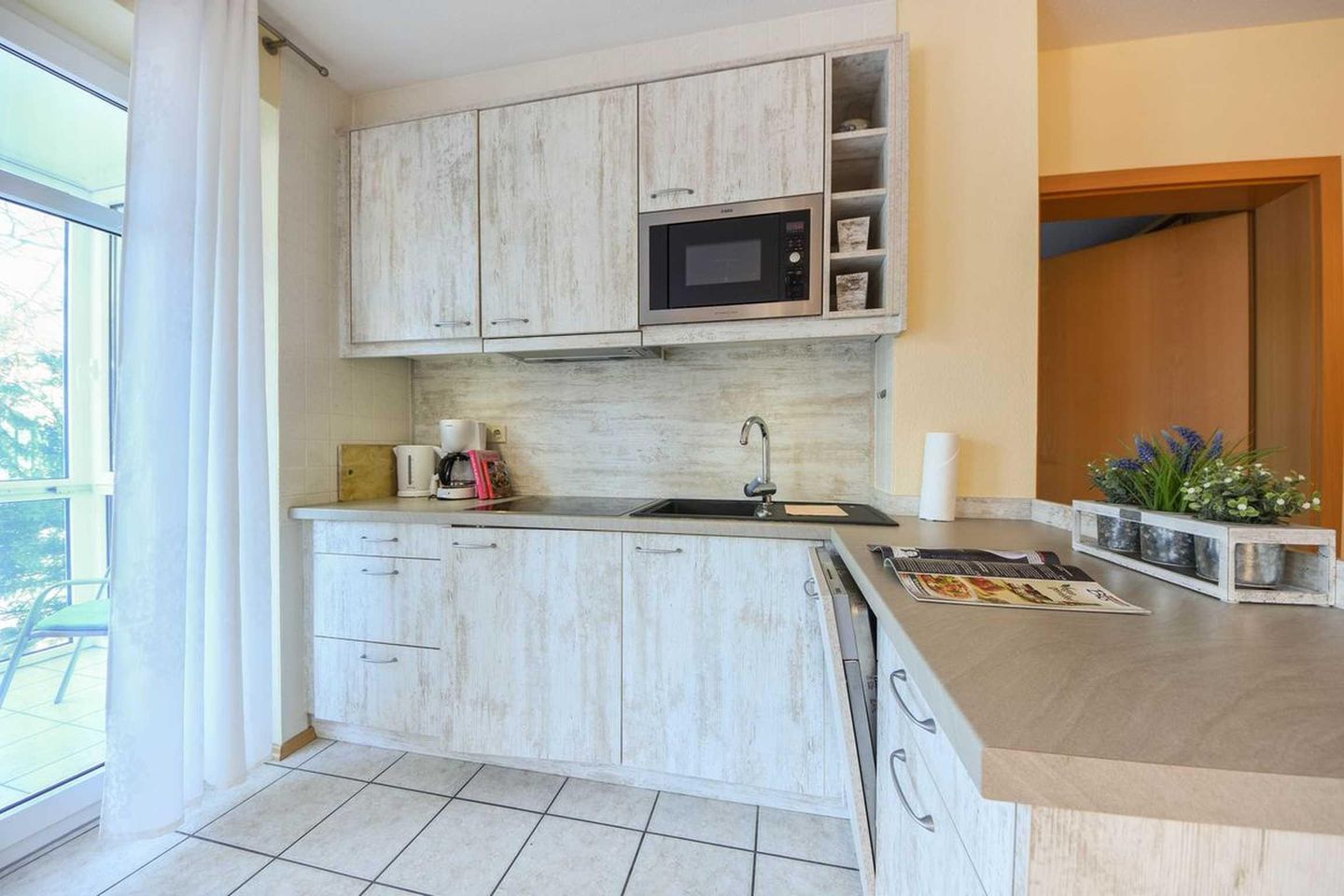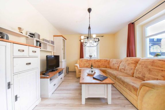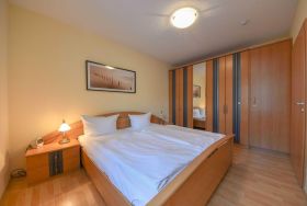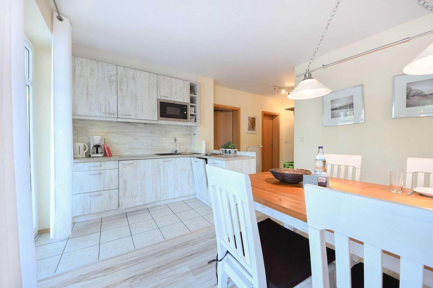 Das Wohnzimmer mit integrierter Küche ist mit TV sowie DVD-Anlage ausgestattet. Des Weiteren kann die Couch zum Schlafsofa umfunktioniert werden und bietet somit bis zu zwei weiteren Personen Platz zum Schlafen. Die Küche ist großzügig eingerichtet (inkl. Geschirrspüler). Vom Wintergarten blicken Sie direkt auf den Park sowie die Strandpromenade (durch die Parkanlage ist Diskretion zur Strandpromenade gewährt). Weiterhin besteht die Wohnung aus einem separaten Schlafzimmer sowie Badezimmer mit Dusche.