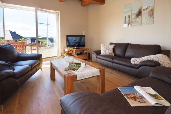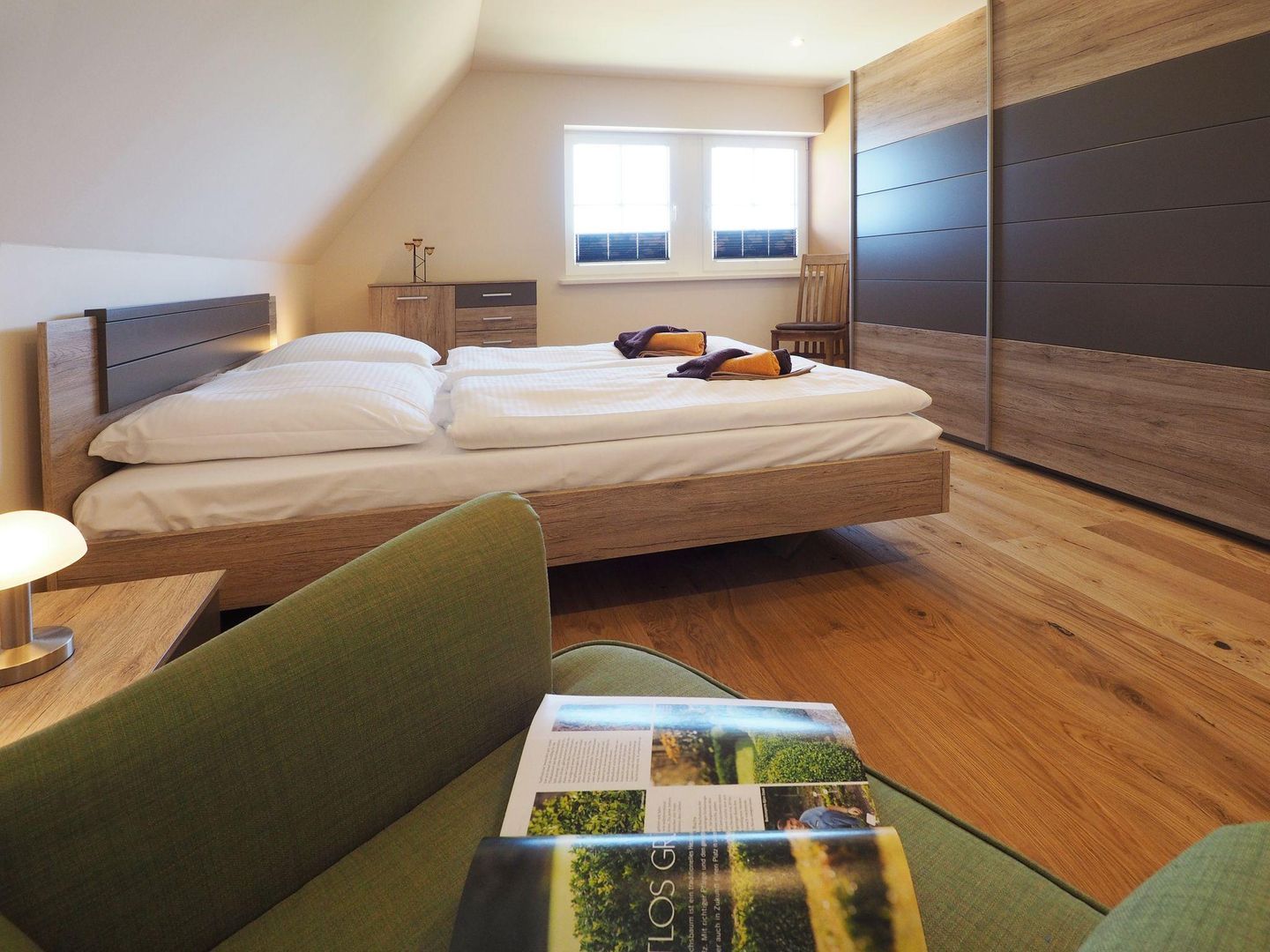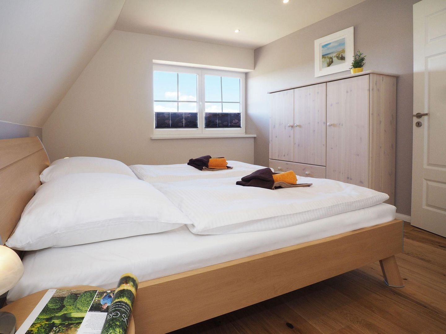 Im Obergeschoss befinden sich drei Schlafzimmer, zwei davon mit komfortablen Doppelbetten, das dritte mit zwei getrennt stehenden Einzelbetten. Zusätzlich lädt eine großzügige Galerie mit Sitzecke und zweitem TV zu ruhigen Momenten, Lesen oder gemeinsamen Filmabenden ein. Das helle, geräumige Bad auf dieser Etage ist mit Dusche und Badewanne ausgestattet und bietet hohen Komfort auch bei voller Belegung.
